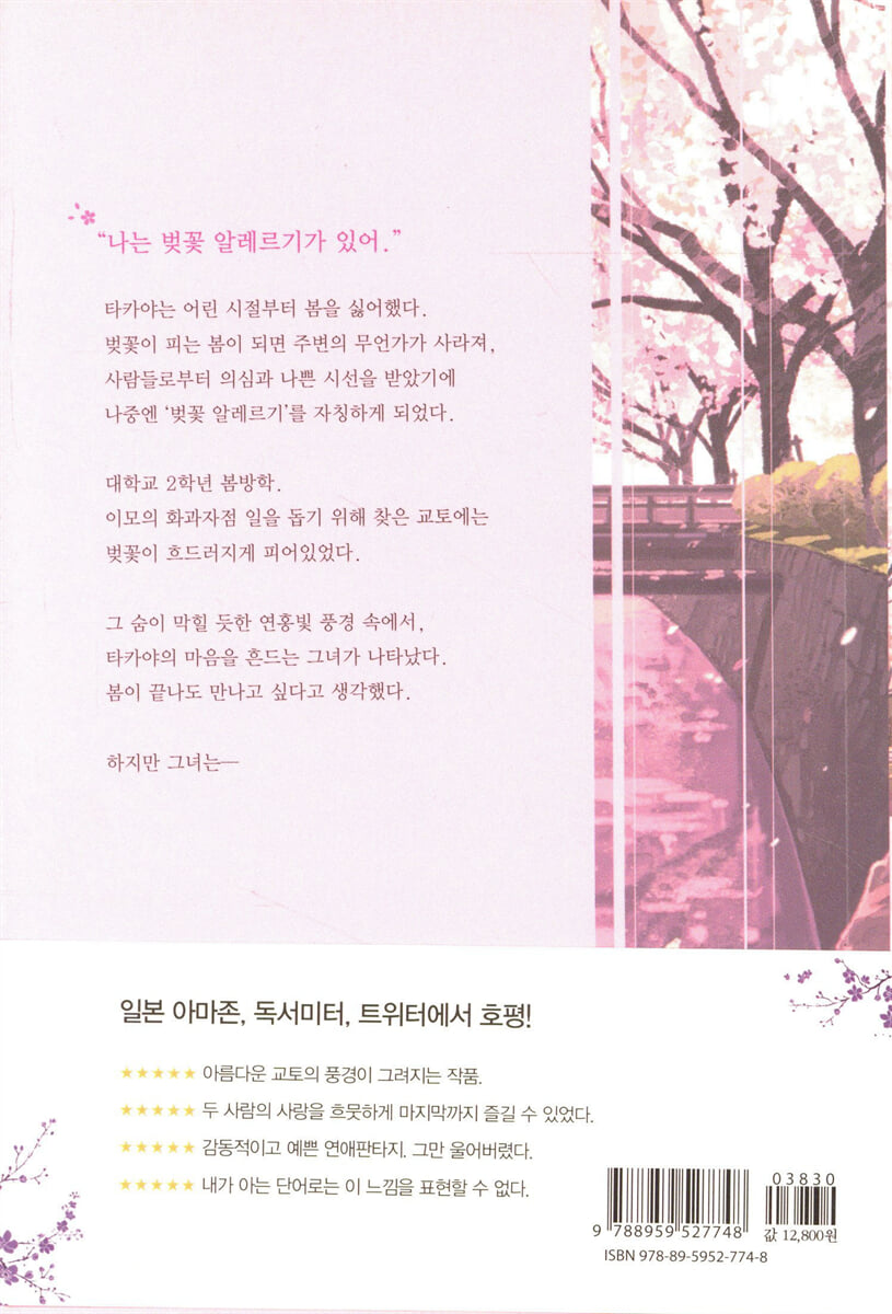 ‘유감’이라고는 하지 않았지만, 그렇게 말하고 싶어 보이는 표정을 짓고서. 무의식적인 행동이리라. 살짝 입술을 삐죽이는 그녀에게 나는 말했다. “저, 벚꽃 알레르기가 있거든요.” --- p.12~13 쿠마노냐쿠오우지 신사 앞 수로에 놓인 냐쿠오우지 다리에서 은각사 다리까지 약 2km에 걸친 철학의 길에는 전 세계 사람들이 아름다운 경치를 보고자 찾아온다. 길가에는 벚나무를 비롯해 철쭉이나 삼지닥나무가 심겨 있어 계절마다 사람들의 눈을 즐겁게 해 준다. 특히 봄에는 만개한 벚꽃이 아름답다. --- p.43 무리 지듯이 피는 벚꽃은 마치 분홍색 함박눈으로 만들어진 부드러운 융단 같았다. 살랑 떠오르는 함박눈 같은 융단은 떨어지지 않고, 머리 위에서 계속 흩날리고 있다. 청아하면서도 눈부시게 빛나는, 각별히 아름다운 봄의 경치였다. --- p.52 “가을이었다면 더 아름다웠을까?” 3천 그루의 단풍나무가 가을의 색깔로 물든다. 서로 겹쳐진 잎들이 노래지고, 붉은색으로 변하면서 때로는 오렌지색으로 비치는 광경은 상상을 뛰어넘을 정도로 아름다우리라. “봄과는 또 다른 아름다움이 있겠지.” --- p.173 |
