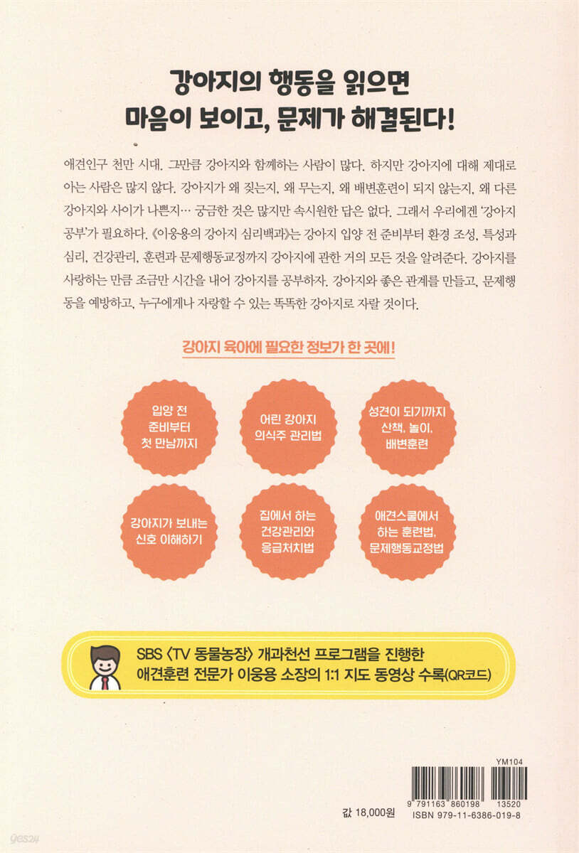 “강아지의 행동을 읽으면 마음이 보인다!” 강아지를 그저 애완동물로 귀여워만 할 것이 아니라면, 함께 살아가는 가족이자 반려동물로서 키우는 데에는 책임감과 준비가 필요하다. 따라서 이 책은 강아지 입양 전 준비부터 시작한다. 강아지를 데려오기 전 스스로의 상황과 환경을 돌아볼 수 있도록 시간·주거환경·가족구성원·알레르기·비용 측면으로 나눠 체크포인트를 제시한다. 나에게는 어떤 강아지가 잘 맞을지 다양한 측면에서 고려할 수 있도록 설명했다. 마음의 준비와 더불어, 강아지 육아에 필요한 용품을 당장 필요한 것과 차차 마련해도 되는 것으로 나눠서 소개한다. 또한 동물보호법 중 꼭 알아야 할 내용만 간추려 보호자로서 지켜야 할 ‘펫티켓’을 짚었다. 의식주 관리부터 놀이와 의사소통까지, 친절하고 세심한 강아지 돌보기 강아지와 가족들의 첫 만남에도 준비와 절차가 필요하다. 가족구성원이나 다른 반려동물에게 소개하고 인사하는 법, 이름 짓기, 강아지를 위해 안전하고 아늑하며 생활하기 편리한 집 안 환경 꾸미기, 아직 서툰 초보 보호자를 위해 의식주 돌보기의 기본 사항을 알려준다. 또한 어린 강아지에서 한 살이 될 때까지 몸과 마음이 모두 건강하게 자랄 수 있도록 의식주 관리법을 상세히 소개한다. 사료와 간식 선택하는 방법은 물론 다이어트, 영양제 선택법까지 소개했고, 몸짓 언어를 이해할 수 있도록 보디랭귀지, 울음소리, 카밍 시그널, 스트레스 시그널로 구분하여 설명했다. 또한 강아지 육아에서 큰 비중을 차지하는 배변 훈련은 다양한 도구를 활용하여 강아지에게 잘 맞는 방법을 찾을 수 있다. 스트레스를 없애고 친밀도를 높일 수 있는 산책, 놀이도 사전 준비부터 실내·실외에서 어떻게 진행해야 하는지 자세히 설명한다. 시간과 비용을 아끼고, 처음부터 문제행동을 예방하는 훈련법 이 책의 핵심은 ‘함께 살기 위한 훈련과 문제행동 교정’이다. ‘앉아’, ‘엎드려’, ‘기다려’와 같은 기본 훈련부터 손, 하이파이브 같이 즐거운 응용 훈련까지 총 13개 훈련의 설명과 동영상을 수록했다. 저자의 오랜 경험에서 우러나온 팁을 실어 누구든지 따라 하기 쉽고 성공할 수 있도록 상세히 소개했다. 훈련 전 준비를 위해 목줄, 리드줄, 입마개에 익숙해지는 방법을 알려주며 신뢰 관계를 만들기 위한 시선 맞추기(아이 컨택) 훈련도 소개한다. 기본 훈련으로는 이리 와(이름 인식) 훈련, 앉아 훈련, 엎드려 훈련, 포인트 훈련, 기다려 훈련을 소개하며 응용 훈련에는 손, 하이파이브, 빵 훈련을 소개했다. 각 훈련별로 훈련 개요와 방법에 대한 상세한 설명. 훈련이 잘 되지 않는 이유, 성공 비결, 훈련 성공 여부를 확인하는 방법 등 오랜 경험에서 우러나온 팁을 실었다. 훈련법 소개 후에는 일상 속 상황, 즉 엘리베이터에 탈 때, 병원에 갈 때, 대중교통을 이용할 때 등 다양한 상황에서 어떤 훈련을 적용하면 되는 소개했다. 많은 강아지들에게서 나타나는 문제행동에 대한 해결책도 충실히 실었다. 주요 문제행동 10가지를 통해 알 수 있는 강아지의 심리 상태를 설명하고 가정에서 쉽게 적용할 수 있는 솔루션을 제공한다. 강아지가 아플 때, 다쳤을 때 당황하지 않는 응급처치법 집에서 하는 건강 관리도 중요하다. 우리 강아지의 주치의가 될 동물병원 선택하는 방법을 소개하고, 처음 병원에 갔을 때 진행하는 검사에 대해 소개한다. 병원을 가기 전, 또는 병원에 가야 할지 판단을 위한 정보도 제공한다. 집에서 간단히 할 수 있는 건강 진단법, 갖춰야 할 가정상비약, 형태별 약 먹이는 방법을 소개했고, 주요 질병의 증상, 예방과 치료법을 설명한다. 어떤 증상일 때 병원에 가야 하는지 판단할 수 있다. 일상적으로 하는 미용 관리, 즉 초보 보호자들이 어려워하는 발톱 깎기, 양치, 목욕을 그림과 함께 단계별로 쉽게 설명했다. |