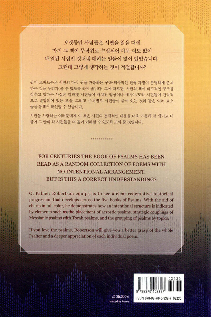 이 책은 시편이라는 소중한 보고(寶庫)로부터 그리스도에 관한 전체적인 것을 배우고 설교하는 일에 새로운 지평을 열어 줄 매우 획기적이고 참신한 연구 결과물입니다. …… 로버트슨 교수는 전체 시편의 다섯 권을 관통하는 특징적인 흐름이 존재한다고 설득력 있게 논증합니다. …… 그는 책 내용에 덧붙여 다섯 가지 도표를 제시함으로써, 어떻게 토라 시편인 1편과 메시아 시편인 2편이 주요 주제들을 제공하고 그것들이 전체 시편을 관통하면서 주요 시편 모음집들을 어떻게 전개시켜 나가는지를 잘 확인하게 해 줍니