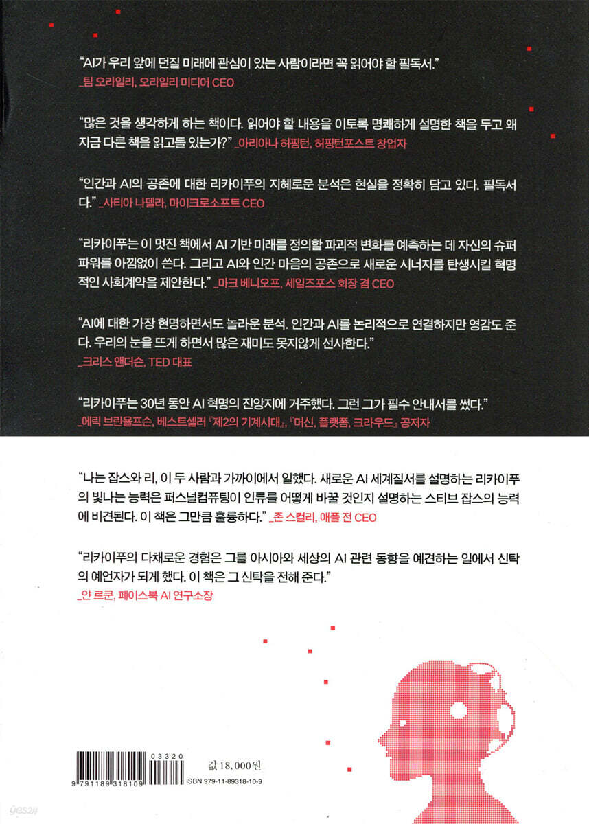 서문 _008 1장 중국판 스푸트니크 모멘트 _013 2장 원형경기장의 모방자들 _049 3장 중국의 대체 인터넷 우주 _099 4장 두 나라 이야기 _149 5장 네 번의 AI 물결 _187 6장 유토피아와 디스토피아, 그리고 진짜 AI 위기 _247 7장 암에서 얻은 지혜 _303 8장 인간과 AI의 공존을 위한 청사진 _341 9장 우리가 만들어갈 세계의 AI 스토리 _391 감사의 말_404 주_406 찾아보기_418 |