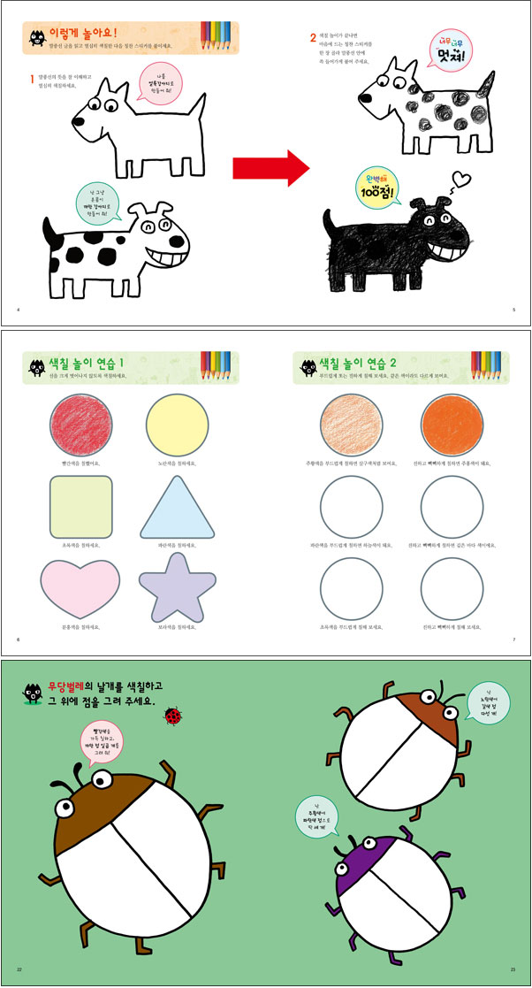 《똑똑한 색칠 놀이책》은 대상을 어떻게 색칠해야 하는지, 어떤 색을 선택해야 하는지, 아이가 스스로 생각하고 선택할 수 있도록 안내하는 책이다. 단순한 색칠 놀이에 익숙한 아이에게는 다소 까다로울 수 있지만, 미술 놀이에서 가장 중요한 요소인 ‘생각하는 재미’를 느낄 수 있다. 특히 아직 글을 못 읽는 아이라면 엄마의 도움이 반드시 필요하다. 어떻게 문제를 해결해야 하는지 생각을 유도하고, 아이가 색칠을 완성해 나가는 과정을 지켜보자. 자신감 쑥쑥! - 동그란 칭찬 스티커를 말풍선 안에 쏙! 《똑똑한 색칠 놀이책》에는 칭찬의 글이 쓰여 있는 재미있는 스티커가 들어 있다. 색칠 놀이가 끝나면 아이가 직접 동그란 스티커를 말풍선 안에 쏙 넣어 붙일 수 있도록 도와주자. 엄마가 보기에 아이의 작품이 깔끔하지 못하고 엉성해 보인다고 절대 실망할 필요는 없다. 아이들마다 손가락 소근육의 발달 정도가 다르기 때문이다. 아이가 스스로 즐기고 재미있게 놀이를 했다면 대성공이다. 칭찬 스티커와 함께 아낌없이 칭찬해 주자. 소근육 발달 쑥쑥! - 색연필은 색칠 놀이의 가장 좋은 친구! 《똑똑한 색칠 놀이책》에서 권장하는 색칠 도구는 색연필이다. 심이 굵은 플라스틱 제품은 색감이 또렷하지 않으므로, 연필처럼 깎아서 쓰는 색연필을 준비하자. 조금 불편하더라도 좁은 면적을 칠하기 쉽고, 발색이 좋으며, 아이의 소근육과 두뇌 발달에 더욱 효과적이다. 이 책에서는 기본 15가지 색을 주로 사용하고 있다. 너무 많은 색은 아이에게 오히려 혼란을 주기 때문에 불필요하다. 먼저 색연필을 바르게 쥐는 방법을 가르쳐 주자. 그리고 심을 부러뜨리지 않고 알맞은 힘으로 색칠하는 요령과 연필깎이로 너무 뾰족하지 않게 색연필 깎는 방법을 알려 주자. 만약 아이가 색연필을 싫어하거나 준비가 여의치 않다면, 사인펜이나 심이 굵은 컬러펜을 사용해도 좋다. 색칠 놀이를 본격적으로 시작하기 전에 ‘색칠 놀이 연습’으로 색칠의 기초를 단단하게 다지는 것이 중요하다. 색과 지능은 매우 밀접한 관계가 있다. 지능이 높을수록 다양한 색을 구분하고 선택한다. 여러 가지 색을 골라 쓸 수 있도록 도와주자. |
