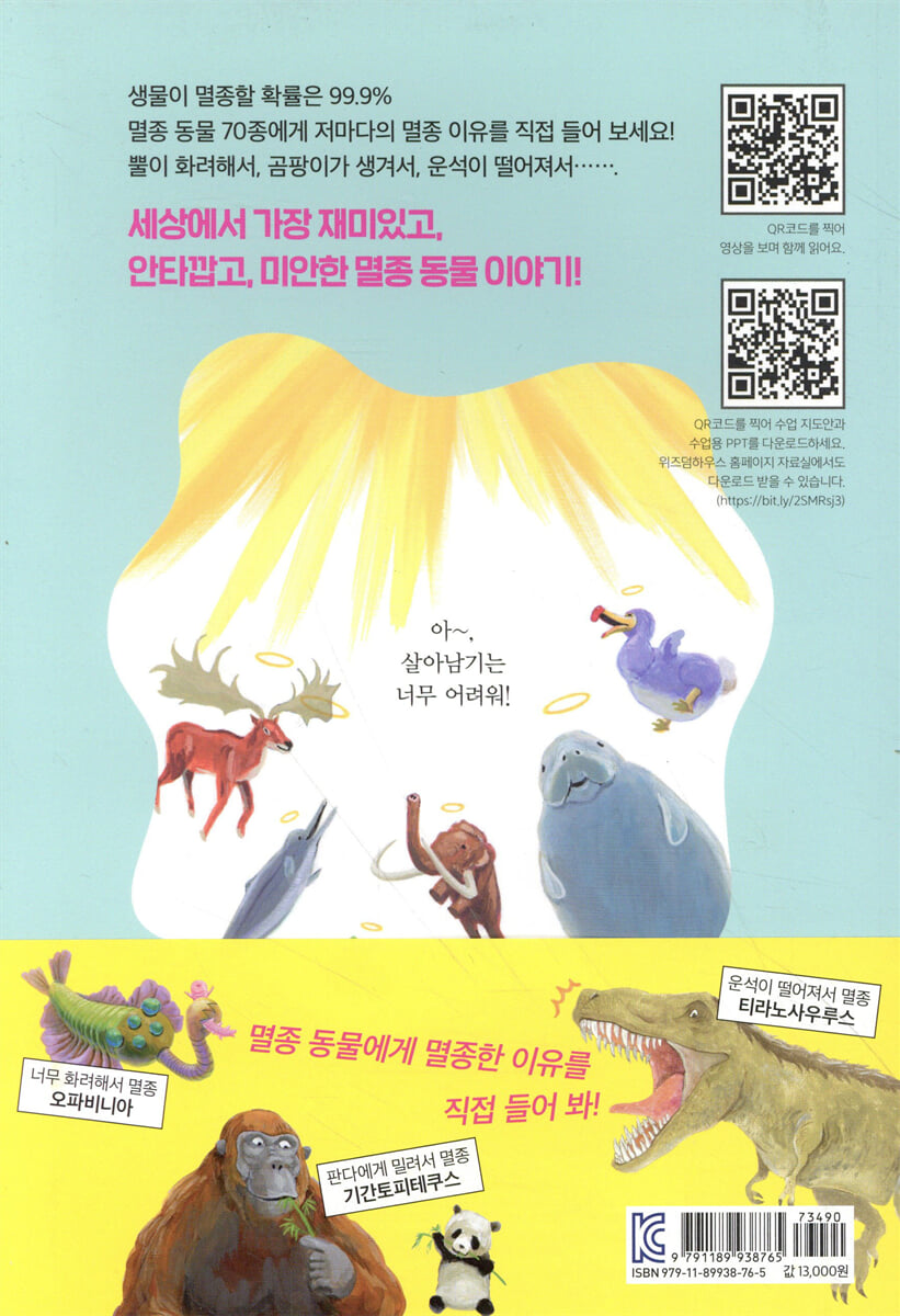 너무 착해서, 이빨이 빠지지 않아서, 강이 바짝 말라서? 70종의 멸종 동물이 직접 지구에서 사라져간 이유를 소개해주는 특별한 멸종 동물도감이다. 읽는 내내 “지구에 정말 이런 동물들이 살았어?” 라는 신기함과 함께 재미있는 구성과 유머로 멸종에 대한 생각거리를 제공한다.