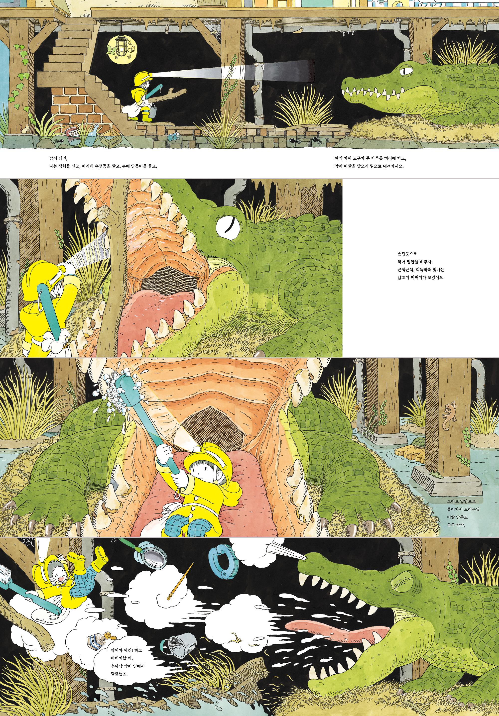밤마다 악어를 찾아가는 아이의 이야기 아이는 밤이 되면 혼자서 장화를 챙겨 신고, 머리에 손전등이 달린 보호모를 쓰고, 한 손에는 양동이를, 다른 손에는 커다란 나무 막대기와 자루를 들고 계단을 내려갑니다. 집 아래 으슥한 곳으로 향하는 아이의 발걸음은 사뭇 비장합니다. 아이의 집 아래에는 커다란 악어가 살고 있거든요. 악어가 어쩌다 그곳에 살게 되었는지는 알 수 없지만, 악어와 아이는 그렇게 어쩌다 아래위 층에 사는 사이가 되었습니다. 아이가 내려오자 아이를 무섭게 노려보던 악어는 곧 입을 쩍 벌립니다. 아이는 익숙한 듯 자루에서 얼른 기다란 나무 막대를 꺼내어 위턱과 아래턱 사이에 끼운 다음, 자기 키만 한 이쑤시개로 악어 이빨 사이에 낀 찌꺼기를 쑥쑥 쑥쑥 파내고, 손전등을 요리조리 비춰가며 꼼꼼하게 칫솔로 이빨을 닦기 시작합니다. 기다란 칫솔로 윗이빨 사이도 싹싹 닦고, 아랫이빨 사이도 싹싹 닦고, 이빨 바깥쪽까지 깨끗이 닦아줍니다. 아이가 이빨을 모두 닦고 악어의 입안에 양동이로 물을 확 뿌리면 악어가 와그르르 와그르르 하고 입을 헹구지요. 두려움을 이겨내고, 문제를 해결하며 스스로 배려심과 책임감을 길러요 아이는 밤, 지하 공간, 악어 등 두려움과 무서움을 느끼게 하는 것들을 침착하게 극복해내면서 어쩌다 자기 집 아래 살게 된 악어를 염려하며 매일 밤 찾아가 보살핍니다. 아이는 만일의 사태에 대비해 악어가 입을 다물지 못하게 막대를 끼워 놓고, 재빨리 악어에게 양치를 시켜줍니다. 입이 다물어지지 않아 불편한 악어가 혀를 움직이자 냉큼 커다란 집게로 혀를 말아 고정시켜 놓기도 하고요. 목구멍에서 침 삼키는 소리가 울리고, 당장이라도 무슨 일이 벌어질 것처럼 악어 숨소리가 거칠어지지만, 아이는 두려워하거나 당황하지 않고 기특하게도 침착하게 할 일을 마치지요. 재채기를 하는 악어에게 마스크까지 씌워 주고, 집으로 돌아와 스스로 양치질을 하고는 잠자리에 드는 아이의 모습을 보면 저절로 흐뭇한 미소가 지어집니다. 누가 시키지 않아도 매일 밤 자기 집 아래 살고 있는 무서운 악어의 이빨을 닦으러 가는 아이를 통해 아이들 안에 자라고 있는 따뜻한 배려심과 스스로 해내는 능력 통해 아이들은 그렇게 스스로 자라자고 있음을 느끼게 됩니다. |