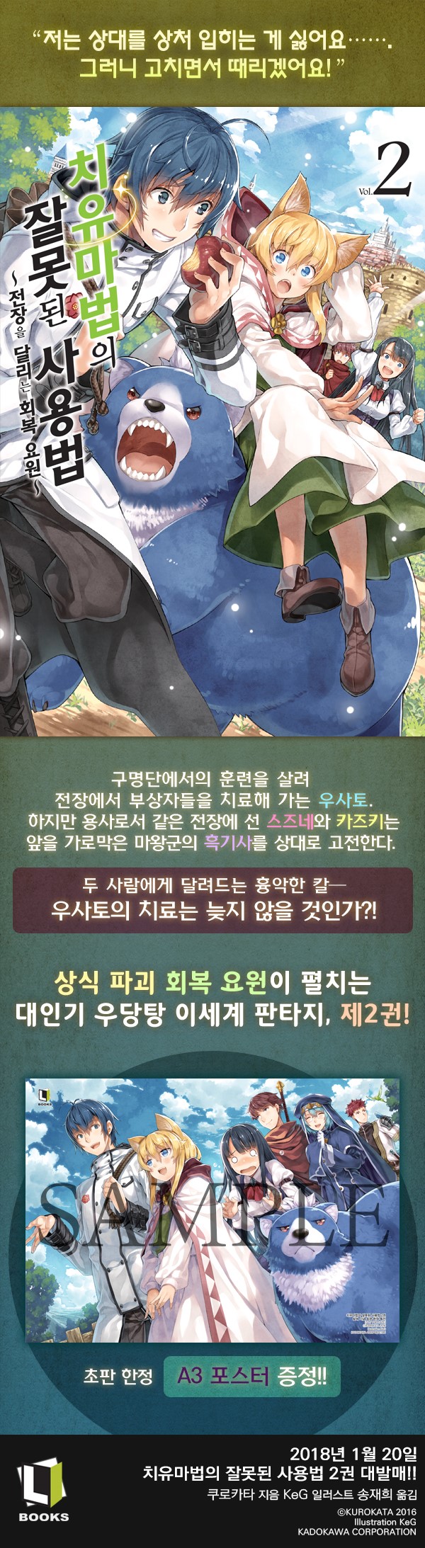 우사토는 훈련 성과를 살려 순조롭게 부상자를 치료해 가지만, 함께 전장에 선 스즈네와 카즈키에게 위기가 닥친다! 두 사람 앞을 가로막은, 꺼림칙한 갑옷을 두른 마왕군의 흑기사. 어떤 공격도 통하지 않는 그 갑옷을 어쩌지도 못하고 두 사람은 조금씩 궁지에 몰린다……. 그리고 마침내 흑기사의 흉악한 칼이 두 사람에게 육박한다─. 소중한 친구를 구하기 위해 『치유마법의 잘못된 사용법』을 무기로 우사토는 전장을 달린다! 상식 파괴 「회복 요원」이 이세계에서 펼치는 대인기 우당탕 판타지 제2권! |