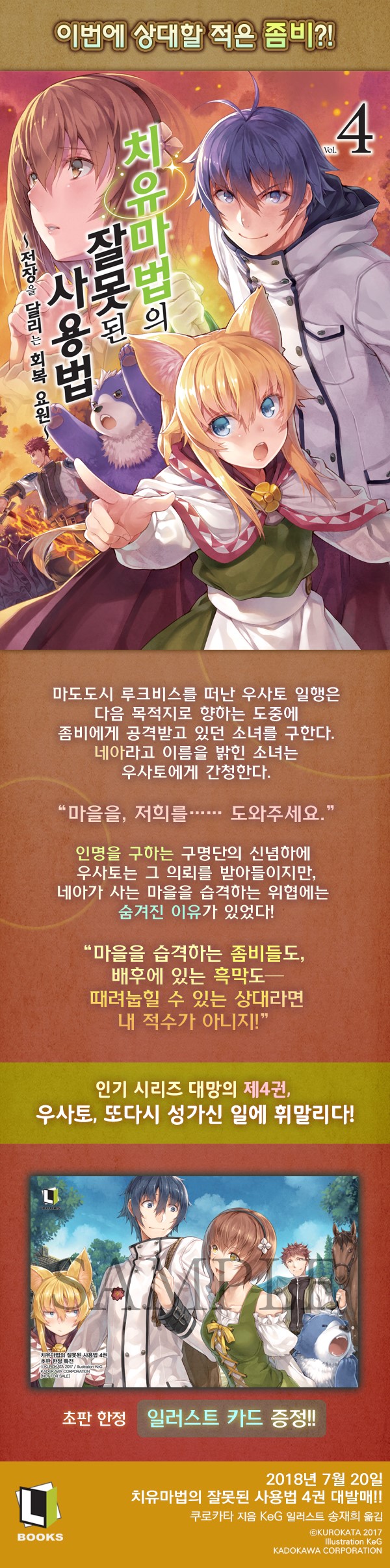 함께 싸우기로 약속을 맺은 우사토 일행. 우사토는 함께 이세계에 온 스즈네, 카즈키와 루크비스에서 헤어지고 아마코, 블루링, 그리고 호위 기사 아르크와 다음 목적지로 향한다. 목적지로 가는 도중, 도움을 구하는 소녀의 비명을 듣고 달려가니 좀비 무리가 소녀를 에워싸고 있었다. 좀비를 격퇴한 우사토에게, 네아라고 이름을 밝힌 소녀가 간청했다. “마을을, 저희를…… 도와주세요.” 우사토는 『인명을 구하는』 구명단의 신념하에 그 의뢰를 받아들이지만, 네아가 사는 마을을 습격하는 위협에는 숨겨진 이유가 있었다! 인기 시리즈 대망의 제4권, 우사토, 또다시 성가신 일에 휘말리다! |