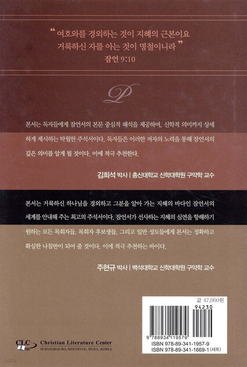 본서는 거룩하신 하나님을 경외하고 그분을 알아 가는 지혜의 바다인 잠언서의세계를 안내해 주는 최고의 주석서이다. 잠언서가 선사하는 지혜의 심연을 항해하기 원하는 모든 목회자들, 목회자 후보생들, 그리고 일반 성도들에게 본서는 정확하고 확실한 나침반이 되어 줄 것이다. 이에 적극 추천하는 바이다 . - 주현규 (박사 | 백석대학교 신학대학원 구약학 교수)