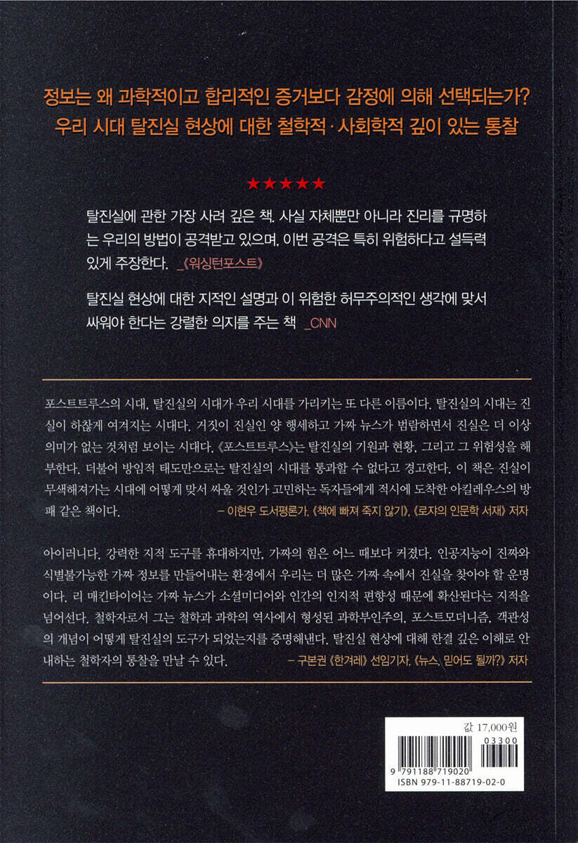 탈진실에 관한 가장 사려 깊은 책. 사실 자체뿐만 아니라 진리를 규명하는 우리의 방법이 공격받고 있으며, 이번 공격은 특히 위험하다고 설득력 있게 주장한다. - 『워싱턴포스트』