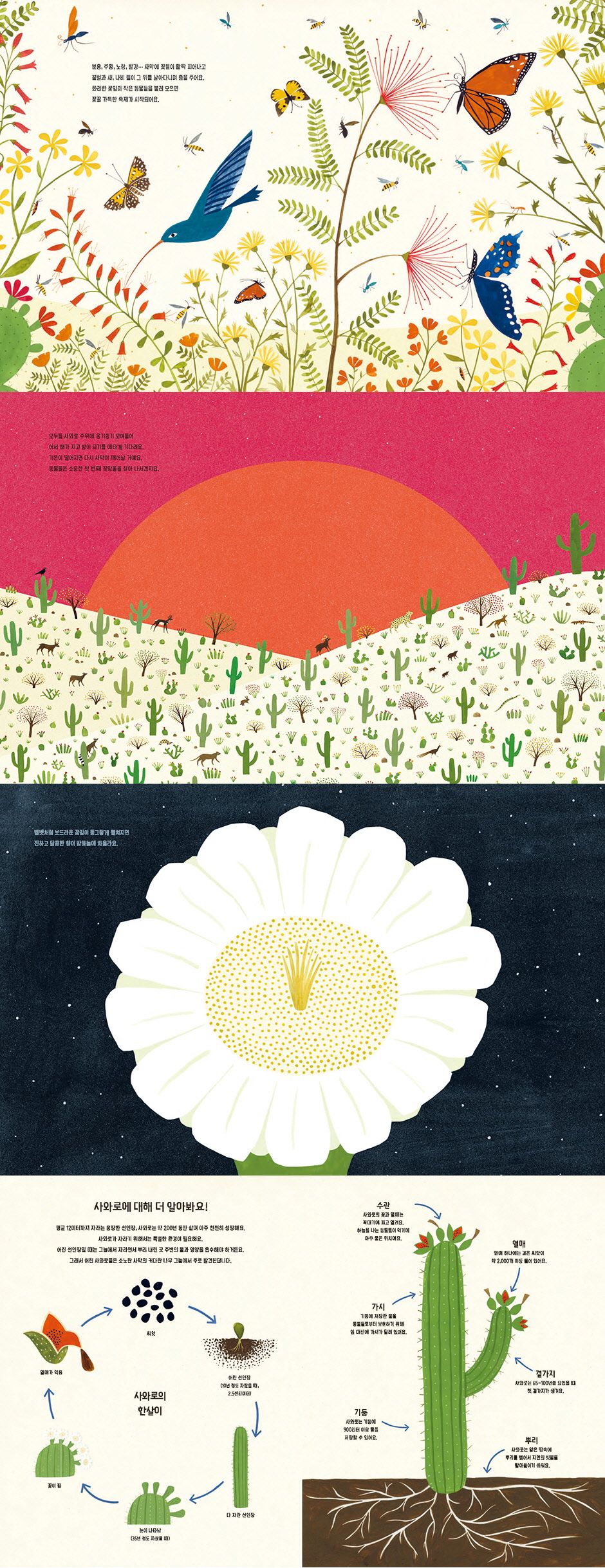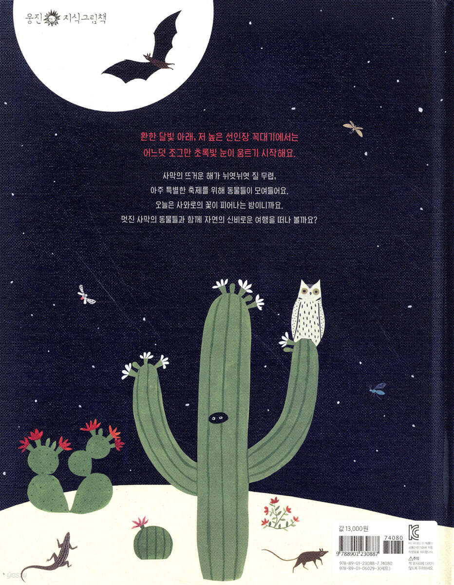 아름다운 밤의 노래 사막의 하루는 도시의 하루와는 조금 다르게 흘러갑니다. 아침과 오후에는 내리쬐는 태양과 달구어진 땅의 온도 때문에 사막 생명들이 꾸벅꾸벅 고개를 떨구며 잠을 자지만, 달이 고개를 내밀어 땅의 온도가 내려갈 때쯤이면 모든 사막 생명들이 일어나 느릿느릿 움직이기 시작하지요. 별이 밝힌 하늘 길을 따라 비행하는 박쥐 떼와 달큼한 꽃향기를 맡고 수차례의 날갯짓으로 바람을 일으키는 나방들, 그리고 끝없이 펼쳐진 사막 위에 달빛을 품고 피어난 사와로꽃 등 경이로운 사막 밤 풍경을 고스란히 담아낸 이 그림책은 몰랐던 세상에 우리의 가슴을 두근거리게 하고, 우리의 시선이 닿지 않는 곳에서 펼쳐지는 무수한 삶과 이야기를 상상하게 하는 시작점이 되어 줄 것입니다. 주변을 다시 발견하게 하는 새로운 세계로의 모험 겨울이 가고 봄이 오면 자연은 무채색에서 유채색으로 옷을 갈아입고, 산수유가 꽃망울을 터뜨리면 진달래와 목련, 벚꽃이 화답하며 릴레이를 이어 갑니다. 이렇게 우리는 일상에서도 매일 경이로운 자연을 만납니다. 그러나 의식하지 않으면 늘 그 존재를 쉽게 잊고 말지요. [일 년에 하루, 밤에 피는 꽃]에선 거친 사막 환경과 사와로 선인장, 남부메뚜기쥐, 호랑이꼬리고양이, 작은긴코박쥐, 아메리카독도마뱀 등 다소 낯선 동식물들과 만나게 됩니다. 우아하고 따뜻한 그림으로 묘사된 그곳의 하루는 당장 눈앞에 나타날 듯 생생하게 펼쳐집니다. 따뜻하고 밝은 노란빛 대지와 분홍, 주황, 빨강, 검정으로 시간 순서에 따라 극적으로 묘사되는 사막의 하늘, 그리고 이런 화려한 배경 속에서 싱그러운 초록빛을 뽐내는 사와로 선인장이 우뚝 솟아 있는 풍경을 통해 그 강인한 생명력을 만날 수 있습니다. [일 년에 하루, 밤에 피는 꽃]을 통해 우리가 경험하거나 관계하지 못한 세계를 모험하고 그 속의 생명들과 관계 맺으며, 우리의 무관심 속에 가려진 자연의 경이와 다양한 삶의 모습을 다시 발견해 보세요. |