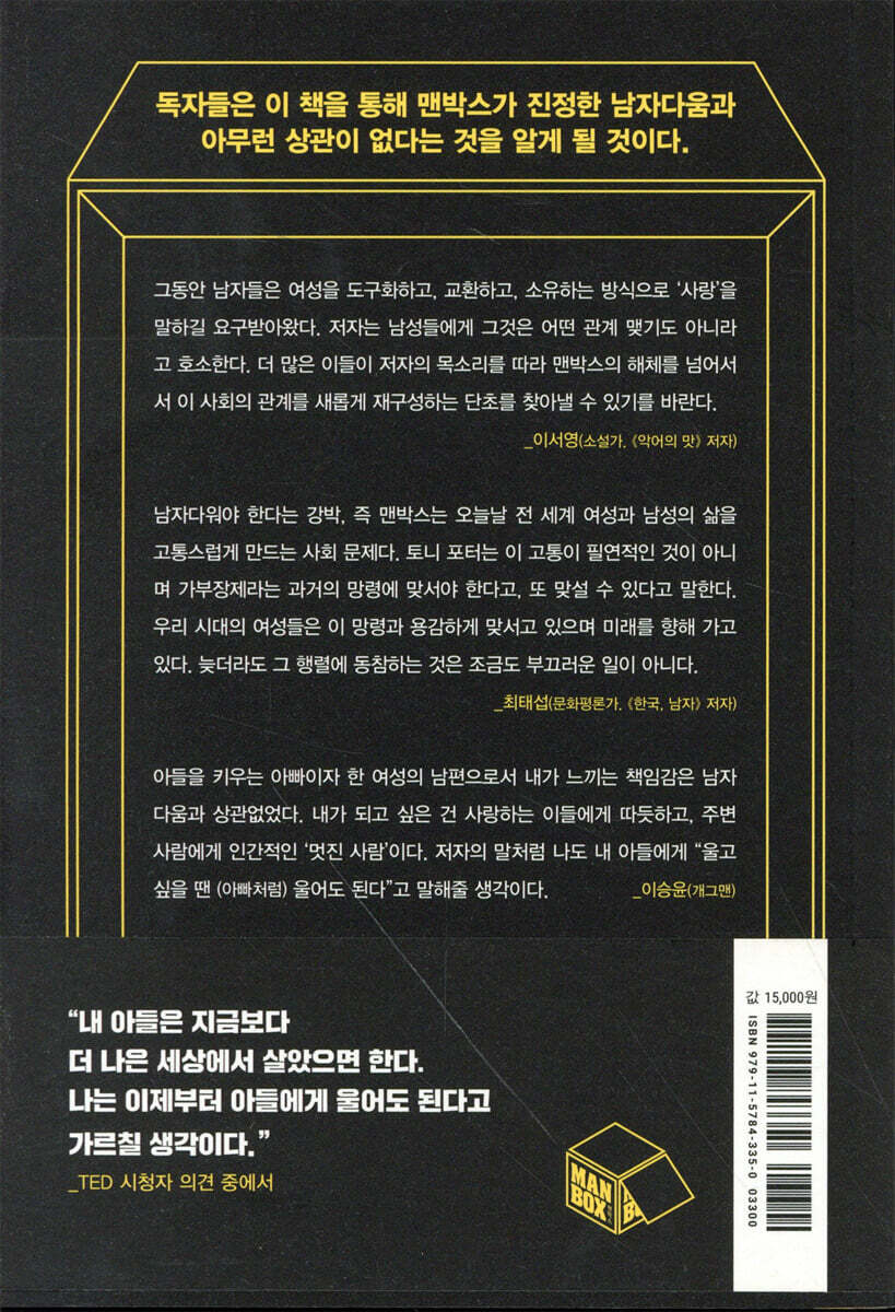 “남자들은 때때로 부끄러워한다. 그들은 약할 때 수치를 느끼고, 수치를 어찌할 줄 몰라서 분노하곤 했다. 저자인 토니 포터는 그 수치심의 줄기를 따라간다. 자신의 강함을 증명하기 위해서 여성을 도구화하고, 교환하고, 소유하는 방식으로 ‘사랑’을 말하길 요구받은 남성들에게 그것은 어떤 관계 맺기도 아니라고 호소한다. 더 많은 이들이 저자의 목소리를 따라 맨박스의 해체를 넘어서서 이 사회의 관계를 새롭게 재구성하는 단초를 찾아낼 수 있기를 바란다.” - 이서영 (소설가. 《악어의 맛》 저자. 한국SF협회 상임이사)