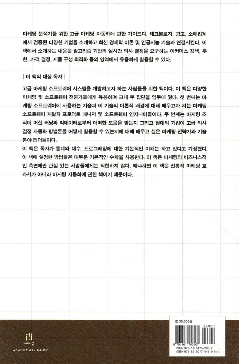 이 책은 마케팅 전문가들에게 고객 행동을 이해하고 제품 오퍼링을 개인화하고 인센티브를 최적화하고 고객과의 접촉을 통제하기 위해 어떻게 머신 러닝과 데이터 과학의 고급 기법들을 사용할 것인지에 관련된 레시피의 집합을 제공한다. 따라서 이 책은 마케팅 시스템에 대한 데이터 기반 분석 플랫폼의 새로운 세대를 창조한다. - 키라 마카곤 (최고 혁신 임원, 링센트럴, 연속적 창업가, 레드아릴과 옥탄의 창업주)