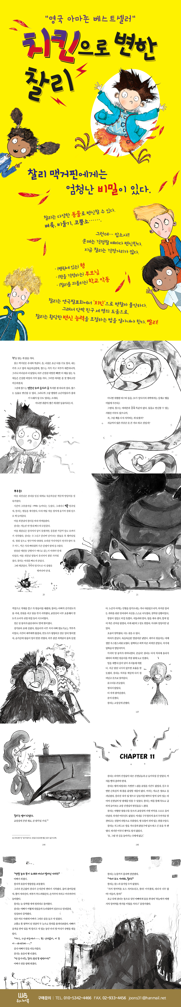 찰리 맥거핀: 엄마, 아빠, 형과 함께 평범하게 살아가던 소년. 형이 입원한 후로 이상한 일들이 일어난다. 걱정할 때마다 동물이나 곤충으로 변신하는 찰리, 부모님은 이 사실을 믿지 못할 것 같아 친구들과 함께 그 원인을 알아내려 한다. 모슨: 입학 첫날 찰리가 바지에 실수했을 때 유일하게 비웃지 않은 다정한 아이다. 첫 번째 단짝 친구다. 우건: 찰리의 두 번째 단짝 친구이며 축구에 소질이 있다. 플로라: 찰리와 모슨, 우건보다도 용감한 여자아이. 모두 벌을 보고 놀랄 때 태연하게 벌을 잡고, 왕따를 당하는 아이가 있으면 나서서 도와준다. 찰리의 문제를 해결하는데 가장 적극적이며 창의적인 아이디어를 쏟아낸다. 딜런: 다른 아이들을 괴롭히는 재미로 사는 악동. 찰리의 변신을 가장 먼저 목격하고 변신할 때마다 휴대폰으로 찍어 온 학교에 퍼뜨리려고 한다. 시도 때도 없이 찰리를 놀리고 연극 무대에서 찰리가 변신해 모두에게 망신당하기를 바란다. 『치킨으로 변현 찰리』는 작가가 독자 옆에서 이야기하듯, 따뜻하고 허물없이 공감하는 친밀함을 느끼게 한다. 무엇보다 이 책의 훌륭한 점은 유쾌한 유머코드로 이야기를 이끌어갔지만, 작가는 어린이들의 불안한 마음을 극복하고 다루는 방법을 이야기로 친절하게 알려주고 있다. 이야기가 끝난 이후에도 작가가 독자의 가상 질문에 직접 답변하는 부분과 출판사의 편지가 이어진다. 이러한 작가의 위트에 더 크게 웃게 된다. 가끔 스트레스를 받거나 탈출구가 필요한 어린이들에게 이 책은 그 자체로 친구가 된다. 차분하고 재치 있는 작가는 이야기 내내 독자의 손을 잡아주며, 아이들이 또 읽고 싶은 소설을 탄생시켰다. |
