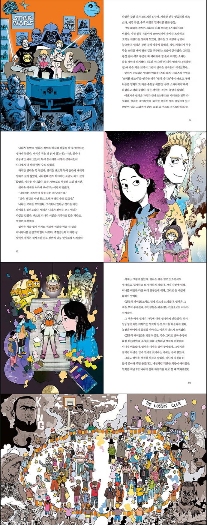 누구나 자기만의 취미 몇 가지에 몰두하며 즐거움을 찾는다. 다양한 취미 활동은 사람들에게 순수한 즐거움과 위안을 주는 안식처 역할을 한다. 하지만 아이들이 성적이나 학교 공부와 관계없는 취미에 몰두하면 비정상적인 것으로 간주되기 쉽다. 학교는 각종 규제와 금지의 잣대를 들이밀며 아이들을 통제하려 하기 때문이다. 그 속에 갇힌 아이들은 자기만의 세계를 만들어 볼 기회를 빼앗기고 주체적으로 사고하는 힘을 잃게 된다. 미국의 초등학교가 배경인 이 작품의 전반적인 분위기도 우리 현실과 크게 다르지 않다. 앨릭은 책에 빠져 있어 성적이 나쁘다는 이유로 교장 선생님과 부모님에게 꾸지람을 듣고 성적이 오르지 않으면 벌칙을 받는 상황에 처한다. 하루 세 시간씩 꿀 같은 휴식처가 되는 루저 클럽에 가지 못한다는 것은 치명적인 벌칙이다. 이러한 갈등 상황에서 앨릭은 어른들로부터 숨거나 도망치는 등 삐뚤어지지 않고 대화를 통해 건강한 방식으로 문제를 극복하려 노력한다. 무조건 자기 주장만 내세우지 않고, 부모님과 선생님에게 진짜로 원하는 것이 무엇인지 그리고 학업을 위해 스스로 어떤 일을 하려 하는지 제안하고 타협하는 과정은 국내 작품에서 한 번도 볼 수 없었던 감동적인 장면이다. 앨릭은 모두를 깜짝 놀라게 할 만큼 공부에 집중하여 당당하게 난관을 헤쳐 나간다. 물론 그렇게 노력한 까닭은 동아리 루저 클럽과 함께하는 친구들을 지키기 위해서다. 자신이 진정으로 좋아하는 일을 발견하고 소중히 여기며 그것을 통해 세상에 당당하게 맞설 수 있게 된 앨릭의 모습은 또 다른 차원의 공감을 이끌어 낸다. 누구도 루저가 아닌, 그 어떤 책보다 반짝이는 세계 책 속에서만 살던 앨릭이 현실을 향해 내딛는 고민의 첫 발걸음은 타인과의 관계로부터 시작된다. 남몰래 좋아하는 니나를 둘러싼 삼각관계, 자신을 놀리고 괴롭히는 동네 친구 켄트와의 갈등, 함께 책을 읽는 다른 학년 친구들과의 만남은 학교에서 가장 유명한 동아리 루저 클럽을 축으로 생생하고 흥미롭게 펼쳐진다. 타인과 소통하거나 함께하는 법을 전혀 몰랐던 앨릭은 점차 솔직하게 니나를 대하고 적이 아닌 친구로서 당당히 켄트에게 맞선다. 작가 앤드루 클레먼츠는 초등학생들이 학교에서 겪을 법한 사건을 차곡차곡 쌓고, 그 사이에 사춘기를 겪는 아이들의 속마음을 촘촘하고 섬세하게 그려 넣음으로써 진솔하면서도 누구나 공감할 수 있는 주제의식을 전달한다. [스타워즈] 시리즈 광팬인 유머러스한 부모님과 어리지만 큰형 같은 동생 캐릭터에 더불어 [샬롯의 거미줄] [손도끼] [야성의 부름] 등 실제 책들을 작품 소재로 활용하여 생동감 넘치는 재미와 함께 여러 책에 대한 호기심을 불러일으킨다. 방과 후 교실 공개 행사에서 루저 클럽에 모인 친구들 한 명 한 명의 색깔이 묻어나는 감동적인 발표를 보여 줄 수 있었던 것은 현실이 소설보다 더욱 멋지다는 것과 그러한 멋진 현실을 앨릭 스스로의 노력으로 만들어 갈 수 있다는 사실을 깨달았기 때문이다. 앨릭이 루저 클럽 회원들의 장점을 발견하여 내면의 한계를 극복해 가는 모습은 혼자가 아닌 함께하는 관계 속에서 진정한 성장이 이루어질 수 있음을 보여 준다. 이렇듯 모두가 함께 만드는 저마다의 세상이 어떤 소설 속 장면보다 아름답게 반짝인다는 사실을, 독특한 작품 세계를 창조해 나가는 웹툰 작가 불키드의 매력적인 일러스트를 국내판에 더해 새롭고 매력적인 감성으로 펼쳐 보인다. 작품 속에 등장하는 수많은 책들을 정리한 도서 목록과 독자들에게 전하는 다정한 맺음말에서 이 책을 통해 좋은 작품을 더 많이 만나기 바라는 작가 앤드루 클레먼츠의 친절한 배려를 느낄 수 있다. |