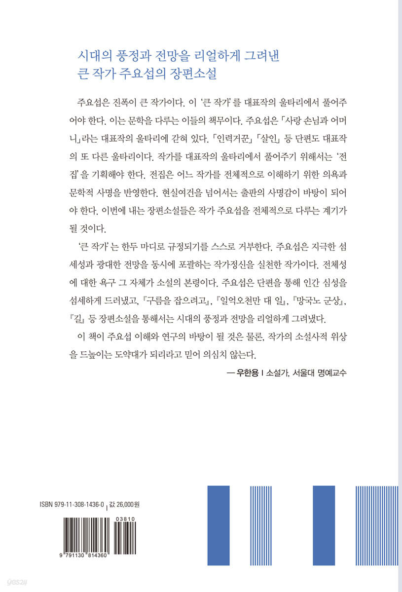 ‘큰 작가’는 한두 마디로 규정되기를 스스로 거부한다. 주요섭은 지극한 섬세성과 광대한 전망을 동시에 포괄하는 작가정신을 실천한 작가이다. 전체성에 대한 욕구 그 자체가 소설의 본령이다. 주요섭은 단편을 통해 인간 심성을 섬세하게 드러냈고, 『구름을 잡으려고』, 『일억오천만 대 일』, 『망국노 군상』, 『길』 등 장편소설을 통해서는 시대의 풍정과 전망을 리얼하게 그려냈다. 이 책이 주요섭 이해와 연구의 바탕이 될 것은 물론, 작가의 소설사적 위상을 드높이는 도약대가 되리라고 믿어 의심치 않는다. - 우한용 (소설가, 서울대 명예교수) |