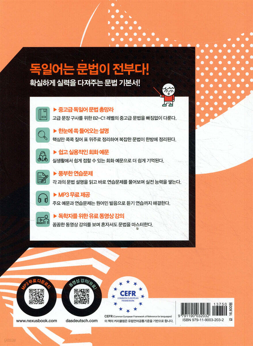 『한번에 끝내는 독일어 문법 중고급편』으로 독일어 중급 문법(B2)부터 고급 문법(C1)까지 완전 정복! 『한번에 끝내는 독일어 문법 중고급편』은 어려운 독일어 문법를 확실하게 정리할 수 있는 기본 문법서입니다. 독일어 고급 문장을 구사하기 위한 중고급 문법을 빠짐없이 담았습니다. 언제 어디서나 듣고 따라 말하는 원어민 음성 MP3 파일과 독학자들을 위한 유료 강의까지 제공하여 혼자 공부하는 학습자들도 쉽게 독일어 문법을 완전 정복! 중고급편 총 60장에 걸쳐 B2-C1 레벨의 문법을 핵심만 콕콕 짚어 설명합니다. 빠르게 이해하고 기억할 수 있도록 도표를 이용하였으며, 독일어 독학자도 무리 없이 이해할 수 있는 친절한 설명과 체계적 커리큘럼으로 한 번에 독일어 문법을 마스터합니다. |