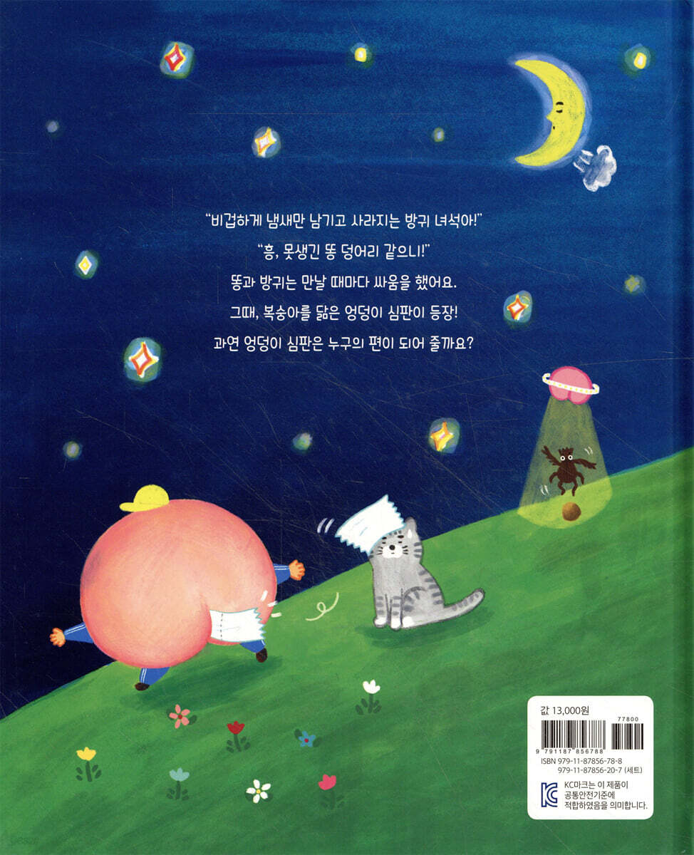 아이들이 좋아하는 친구들이 총출동한 그림책! 이 책의 특징! ① 아이들이 좋아하는 등장인물이 가득! 똥, 방귀, 엉덩이 등 어린아이들이 가장 좋아하는 것들이 사랑스러운 캐릭터가 되어 등장합니다. 서로 으르렁거리던 똥과 방귀가 엉덩이 심판을 만나 친구가 되어가는 모습을 지켜봐 주세요. ② 재미있는 의성어와 의태어가 가득! “뿌지직!” “뽀오옹!” “푸슈~!” 똥을 쌀 때나 방귀를 뀔 때 나는 다양한 표현을 소리 내어 읽어 보면 더욱 재미있는 독서 시간이 될 거예요. ③ 똥과 방귀에 관한 정보가 가득! 똥과 방귀는 그저 더럽고 냄새나는 나쁜 것이 아니라, 우리 몸의 안 좋은 찌꺼기들을 몸 밖으로 배출해 주는 고마운 존재라는 사실을 배울 수 있어요. |