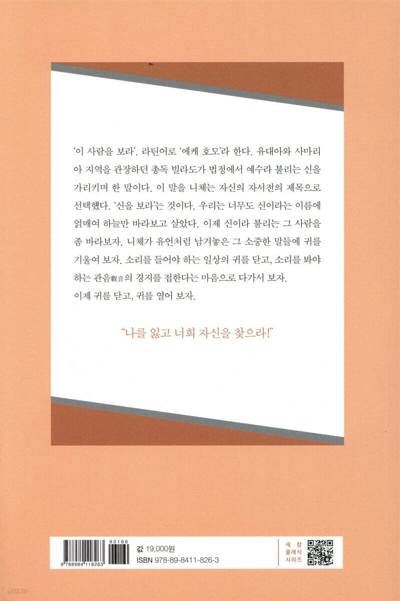이제 더 이상 ‘신’을 보지 말고 ‘이 사람’을 보라고 외친다 인간과 인생에 대한 무한한 긍정으로, 지친 우리 삶을 위로하는 니체의 1초도 허무하지 않은 허무주의 여행이 시작된다 니체는 오랫동안 대중의 사랑을 받은 철학자다. 그를 대표하는 말로는 ‘신은 죽었다’나 ‘허무주의’가 있다. 이로 인해 그가 무턱대고 종교를 혐오하거나 무기력한 허무주의에 빠져있다고 오해할 때가 있다. 그러나 니체가 말하고자 하는 바는 명확하다. 우리가 진리라고 믿는 울타리에 매달리지 말고, 오직 자기 자신을 사랑하라. 기존의 틀을 깬다는 일이 어렵다는 걸 니체도 안다. 틀을 깨는 고통과 성장이 영원히 반복된다는 사실도 안다. 하지만 그는 끊임없이 우리의 어깨를 두드리며 용기를 준다. 이제 우리는 우리를 옥죄던 ‘진리’를 넘어서 인생을 사랑할 준비가 되었는가? 영원히 반복되는 고통과 성장을 당당하게 맞이할 준비가 되었는가? 그렇다면 이제 이 사람을 보자! 에케 호모! 이 사람은 누구인가? ‘에케 호모!(Ecce homo!)’란 ‘이 사람을 보라!’는 뜻의 라틴어다. 성서에 등장하는 로마 총독 폰티우스 필라투스가 분노한 유대인 군중을 향해 예수를 가리키며 한 말이다. 니체는 여기서 ‘신’의 자리에 ‘이 사람’을 올려놓는다. ‘이 사람’은 사람들이 그동안 ‘신’처럼 여겼던 종교, 도덕, 규범, 관습으로부터 그들을 해방시킨다. 우리는 확신에 가득 찬 ‘이 사람’의 안내를 따라 완전한 해방과 자유, 사랑의 길로 들어선다. 우리는 현실의 삶을 살아 낼 용기가 필요하다! 니체는 ‘진리’를 거부한 만큼, ‘이 사람’이 또 다른 진리가 될까 걱정했다. 그래서 ‘이 사람’은 서두에서 “‘나’를 잃고 너희 자신을 찾으라”고 밝힌다. 만일 이 책에서 투어 가이드가 속속들이 안내해 주는 패키지여행과 같은 것을 기대했다면 큰 오산이다. 인생은 직접 경험하며 배우는 자유여행이다. 니체는 자신의 삶과 철학적 사유를 되돌아보면서 이 사실을 강조한다. 그리고 보여 준다. 우리는 모두 현실을 살아 낼 힘이 있다고, 다만 아직 용기가 없을 뿐이라고 말이다. 말년의 니체를 통해 만나는 생(生)철학의 집대성 이 책은 니체가 말년에 쓴 마지막 자서전이다. 여기서 그는 자신이 일평생 쏟아냈던 ‘삶을 긍정하는 철학’, 바로 생(生)철학의 사유를 총망라한다. 더불어 자신이 썼던 책들을 하나하나 요약하면서 어떤 부분을 강조하고 싶었는지, 어떻게 이 책을 이해해야 하는지 일목요연하게 정리한다. 특히 이번 번역에서는 말 줄임표, 마침표 하나하나를 그대로 옮겨, 죽음 앞에서까지 인간의 삶을 긍정하려 했던 니체의 절박함을 함께 살렸다. 비록 정신분열에 시달리느라 체계적인 구성을 갖추진 못했지만, 니체의 철학과 저서에 대해 알고 싶은 독자에게는 명쾌한 안내서가 될 것이다. 왜 다시 클래식인가? 왜 다시 니체인가? 고전의 가치는 시대를 관통하는 법이다. 다만 시대적 흐름에 부응한 새로운 문체와 해설이 필요할 뿐이다. ‘고전은 읽기 어렵고, 지루한 것’이라는 편견을 깨고, 원작의 의미와 깊이를 음미할 수 있도록 새로운 번역과 해설을 선보인다. 우리는 다시, 고전의 안경을 통해 현대를 새롭게 보게 될 것이다. 니체는 오랫동안 사랑받아 온 철학자 중의 한 명이지만, 그의 철학을 어렵게 느끼는 사람들도 적지 않다. 비유가 가득하고, 잔뜩 고조된 그의 언어는 차가운 글에 익숙한 우리에게 낯설게만 다가왔다. 하지만 니체가 하고자 하는 메시지는 분명하다. “네 자신이 누구인지 알고, 충분히 사랑하라!” 우리는 다시, 니체의 외침을 통해 지친 우리 삶을 기쁨과 용기로 채울 수 있을 것이다. |