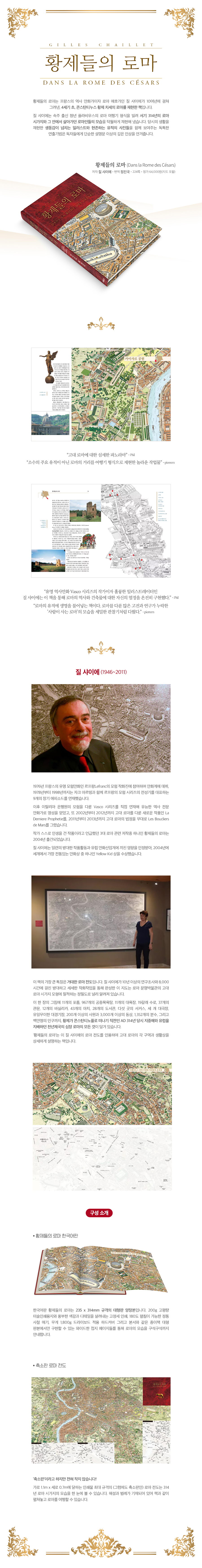 방데지네의 거장 질 샤이에가 생애에 걸쳐 연구하고 5,000시간 이상의 스케치, 3,000시간 이상의 채색 작업을 통해 21세기에 재현한 영원의 도시 로마. 건물 하나하나, 그 건물의 창문 하나까지 세밀히 묘사한 고대 로마의 상세도를 길잡이로 삼고, 가상의 인물을 안내자로 삼아 그의 로마 입성부터 다시 로마를 떠나는 날까지, 수백 장의 사진과 질 샤이에 그린 당대인들의 삽화을 벗삼아 우리는 당대인의 눈으로 4세기 로마 시민의 생활과 풍경을 감상할 수 있다. 인류의 역사에서 가장 빛나고 경이로 가득찬 도시로 여러분을 안내하고자 한다. |