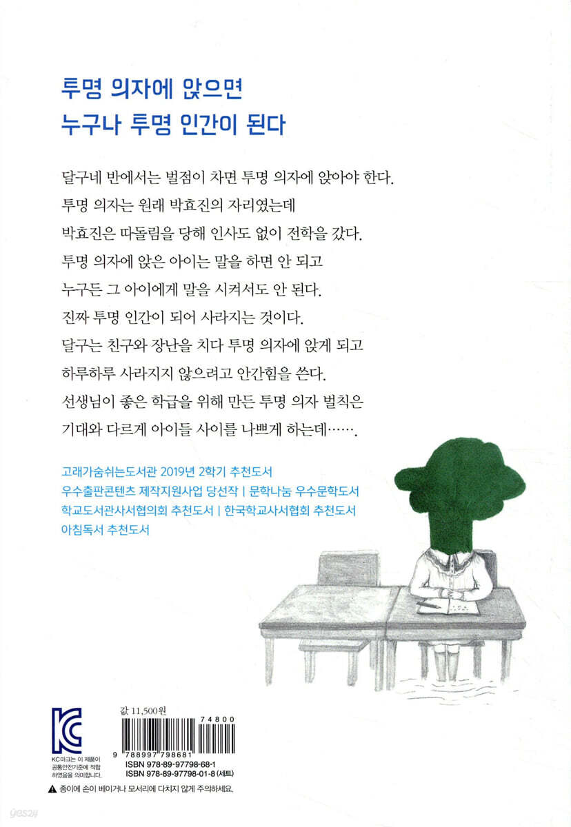 달구네 반에 생긴 ‘투명 의자’는 벌점이 가장 먼저 찬 아이가 앉는 벌칙 의자이다. 투명 의자는 원래 따돌림을 당해 인사도 없이 전학을 간 박효진의 자리였다. 투명 의자에 앉은 아이는 말을 하면 안 되고, 누구든 그 아이에게 말을 시켜서도 안 된다. 달구는 친구와 장난을 치다 맨 먼저 투명 의자에 앉게 되고, 의사소통이 금지된 채 지내다 보니 점점 투명 인간처럼 존재감이 없는 아이가 되어 간다. 마치 유령 취급을 당했던 박효진처럼 말이다. 달구는 아이들과의 관계 속에서 사라진 존재가 되지 않기 위해 하루하루 안간힘을 쓰면서, 그동안 당연하게 여겼던 많은 일들이 정말 당연한 게 맞는지 의문을 갖게 된다.