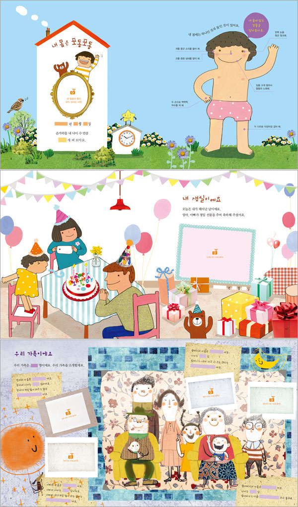 이 책은 기록 그림책이라는 시리즈물이다. 즉 기록을 위해 만들어진 책이다. 0세부터~5세까지 연령별로 기획된 이 시리즈 중 이번에 출간된 책은 만 2세용으로, 『나의 첫 번째 사진첩』과 『우리는 한 가족이에요』 이렇게 두 권의 책으로 구성되어 있다. 그 중 『나의 첫 번째 사진첩』은 만 2세 아이의 1년 동안 성장 기록을 고스란히 담을 수 있도록 구성되었다. 집에서 부르는 나이로 서너 살인 만 2세는 아동발달학자들 사이에서는 ‘첫 번째 사춘기’로 불린다. 이 시기는 세상에 대한 지식이 비약적으로 성장하여 눈부신 인지발달이 이루어지기도 하지만, 인간이라는 한 개체로서의 성장 역시 그에 못지않기 때문이다. 태어나서 줄곧 엄마에게 의존하던 한 살배기에서 독립된 개체로서 자신을 처음으로 자각하는 행동이 나타난다. 마치 청소년기의 사춘기처럼 자신에 대한 자각이 커지는 것이다. 그래서 만 두 살 아이는 “내가, 내가” 혹은 “뭐야?”라는 질문이 많아지고 자존감도 생겨 “아니야”라는 부정적인 표현도 많아진다. 이 책은, 이처럼 막 자신을 자각하기 시작하는 만 2세 아이가 스스로 자기 자신의 감정이나 생각, 경험을 담아낼 수 있도록 구성되었다. 한 장, 한 장 사진을 붙이며 완성된 책은 두 살 배기 우리 아이의 마음을 찍은 ‘성장 기념 사진첩’이 될 것이다. 독자의 참여를 통해 비로소 한 권의 책으로 거듭나는 ‘독자참여형 그림책’인 것이다. 물론 유아용 학습지류처럼 독자에게 답을 요구하는 출판물은 흔히 있어 왔다. 정해진 답이 있으며, 맞고 틀림에 대한 판별이 필수적으로 따라오는 것들이다. 하지만 이 책은 정답이 없으며 아이들마다 생활이 천차만별 똑같은 책은 결코 있을 수 없다. 『나의 첫 번째 사진첩』과 기존 책의 가장 큰 차별점인 것이다. 그래서 이 책은 처음부터 기록과 보관에 초점을 두고 기획되었다. 나아가 이 책은 이 세상에 단 하나 뿐인, 내 아이의 경험이 오롯이 담길 수 있는 책이 되기를 지향하고 있다. 만약 이 책에 담긴 기록들을 1년 뒤…, 5년 뒤, 아니 성인이 되어 다시 본다면 어떨까? 『나의 첫 번째 사진첩』을 꼬옥 껴안고 어릴 적 소중한 추억의 단편들을 떠올리게 될 것이다. 첫 번째 사회적 관계, 가족을 알아가는 책 - 별책 『우리는 한 가족이에요』 만 2세는 자신과 가장 가까운 타인인 가족의 존재를 인식하기 시작하는 시기이다. 엄마, 아빠, 형제 등 가족과 관계 맺기를 통해 유아는 타인과 관계를 맺고 살아가기를 배운다. 또한 할아버지, 할머니, 삼촌 등 확대된 가족과의 경험은, 타인에 대한 조망 능력이 아직 부족한 유아에게 수용과 안전함을 담보한 애정 가득한 분위기에서 마음껏 타인과 교감하게 함으로써 이후 가족을 벗어난 2차적 사회적 관계에서 성공할 수 있도록 돕는다. 또한 가족은 또다른 나의 반영이다. 자존감의 발달이 가장 중요한 성장과제인 만 2세 유아에게, 자신이 가족으로부터의 사랑과 존중을 받고 있음을 확인하는 것은 필수적인 요소인 것이다. 기록그림책 2세용, 또 다른 책인 『우리는 한 가족이에요』는 가족의 일원으로서 자신의 존재를 확인하고 가족들과의 애정을 느끼도록 구성한 책이다. 이 책은 특히, 현대 사회에서 갈수록 소원해지기 쉬운 조부모 혹은 삼촌, 고모들과 함께하는 시간을 제안하고 있어, 우리 아이들이 소중한 경험을 할 수 있는 계기를 마련하고 있다는 점이 눈길을 끌고 있다. |