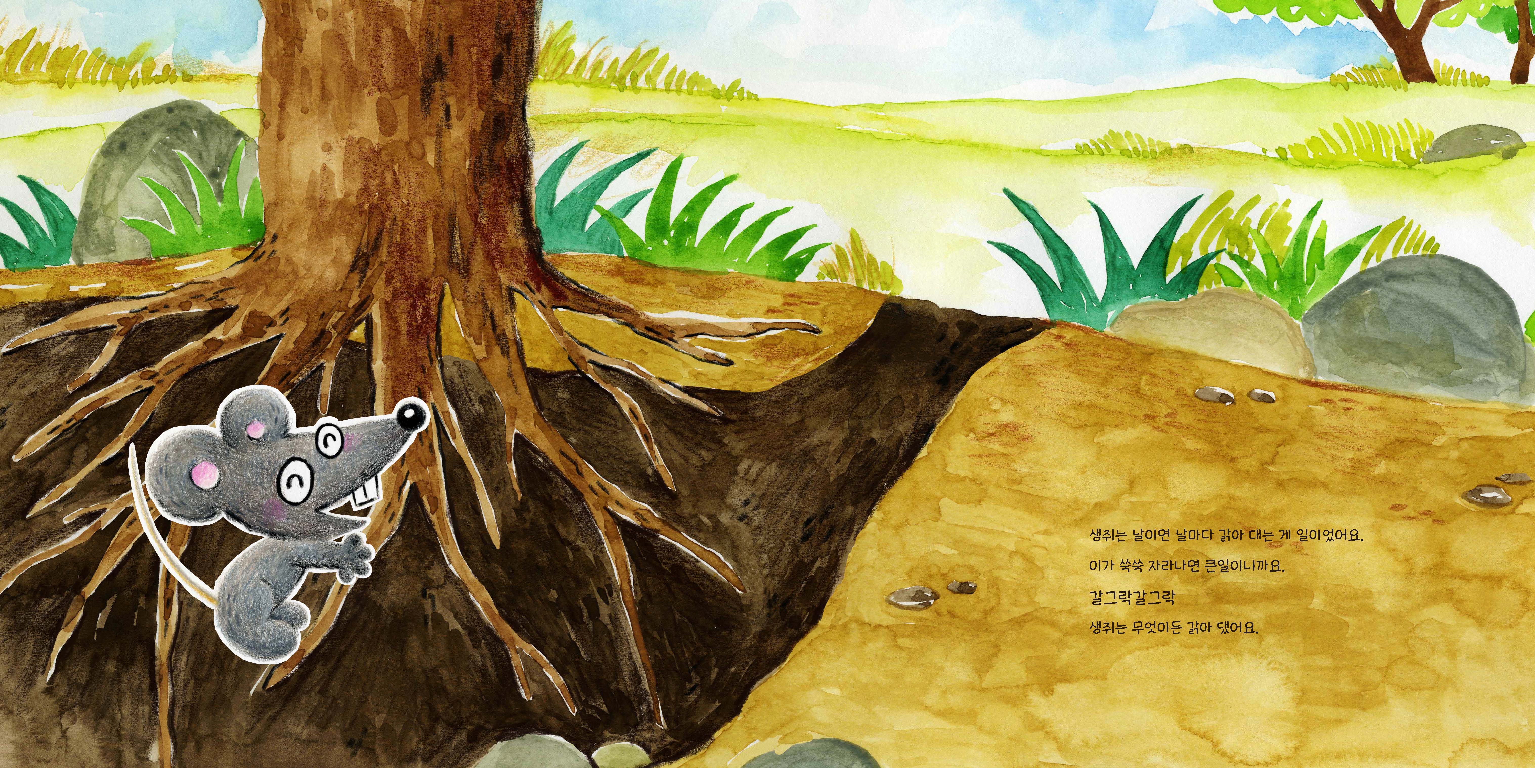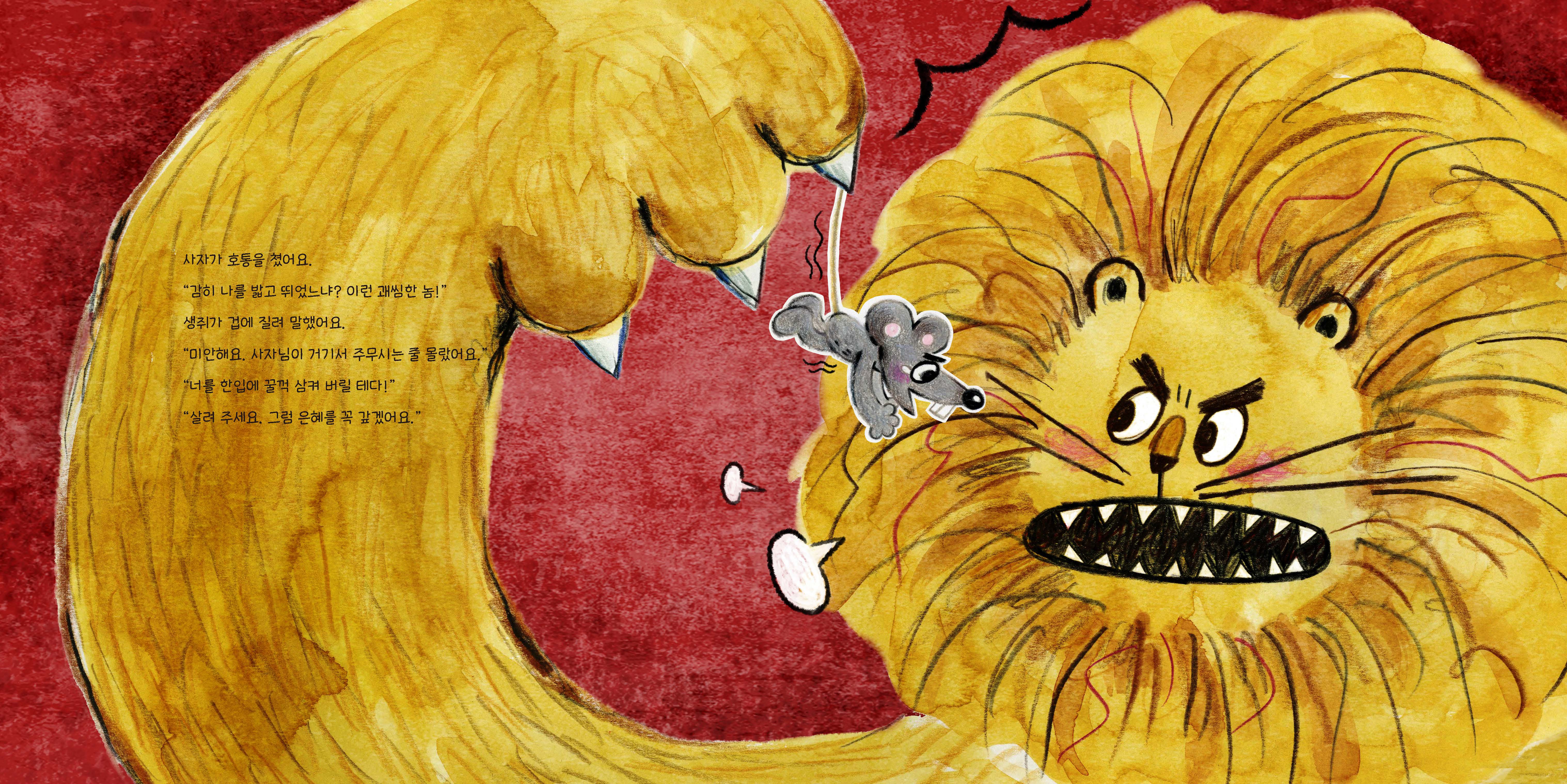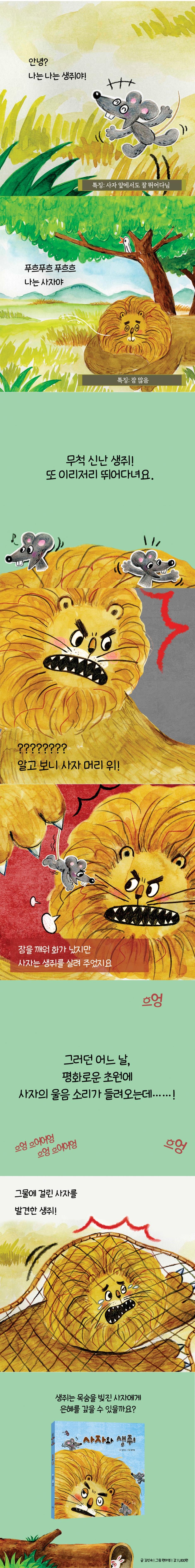 내가 잘할 수 있는 일엔 어떤 게 있을까요? 누군가가 멋지게 어떤 일을 해내면 우리는 ‘저 사람은 참 재주가 많아!’ 하고 칭찬해요. 생쥐가 사자를 살린 건 대단한 일인데, 그렇게 할 수 있었던 건 아주 일상적이고 단순한 재주 덕분이었어요. ‘이빨로 뭐든 갉기’ 말이에요! 생쥐는 이빨이 계속해서 자라기 때문에 날이면 날마다 갉는 게 습관이에요. 그 습관이 결과적으로는 사자의 목숨을 구하는 귀한 재주가 되었어요. 비록 사자보다 힘은 약할지라도, 생쥐에게 밧줄을 갉아 낼 기술을 갖고 있지 않았다면 절대 사냥꾼이 친 덫에 걸린 사자를 꺼내 줄 수는 없었겠지요. 이렇듯 나 자신도 집중하지 않았던 아주 사소한 일들도 다시 보면, 또 어떤 예상치 못한 상황에서는 충분히 나의 장점이자 재주가 될 수 있답니다. ‘나는 몸집이 작은 생쥐일 뿐이야. 저렇게 힘도 세고 강한 사자를 내가 어떻게 꺼내 줄 수 있겠어.’ 하고 자신감 없는 모습을 보였다면 어땠을까요? 생쥐는 제 장점을 충분히 발휘하지 못했겠지요. 우리 모두 나의 장점, 나의 재주를 사랑해 봐요. 생각보다 나 자신이 얼마나 훌륭하고, 뛰어나고, 멋있는 사람인지 깨달을 수 있을 거예요. 나 스스로를 소중히 대하고 품위를 지키는 감정, ‘자존감’은 이런 사소한 습관에서부터 쌓인답니다. |