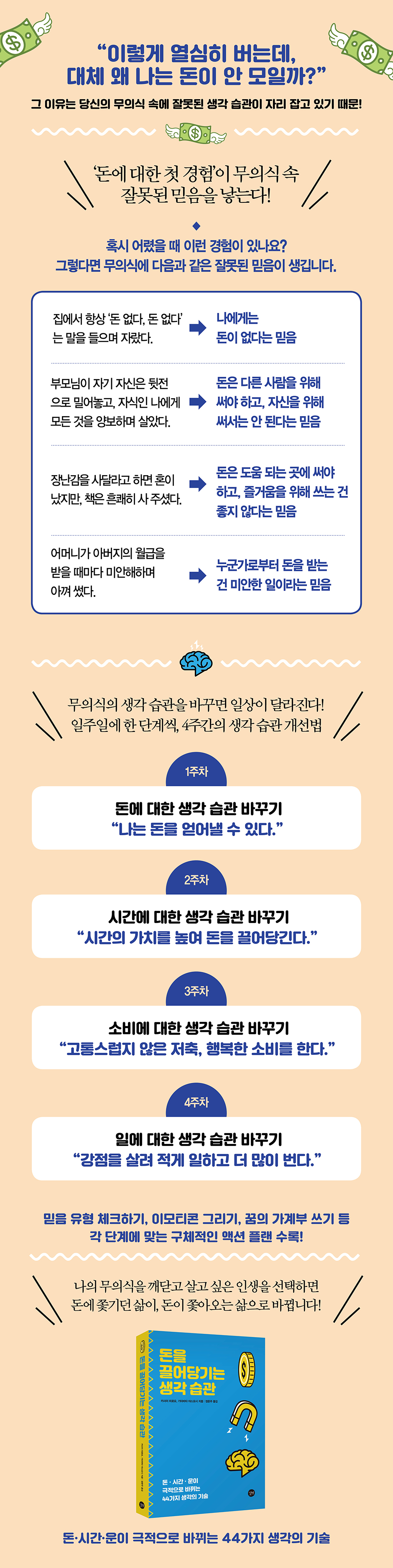 돈에 대한 믿음은 ‘돈이 있다/없다’, ‘돈을 얻어낼 수 있다/없다’의 2가지 기준을 통해 총 4가지 유형으로 나뉜다. 이는 보통 어렸을 적 ‘돈에 대한 첫 경험’으로 인해 생기는데, 나의 유형은 무엇인지 아래에서 골라 보자. 부모님이 하고 싶은 일은 뭐든 할 수 있게 허락해주었다. 부모님은 내가 갖고 싶은 물건은 무조건 사 주었다. → A 유형(돈이 있다 × 돈을 얻어낼 수 있다) 부모님이 열심히 일한 덕분에 학교와 학원에 다닐 수 있었다. 부모님은 내가 갖고 싶은 물건은 대체로 사 주었다. → B 유형(돈이 없다 × 돈을 얻어낼 수 있다) 부모님이 오빠와 여동생은 하고 싶은 일을 시켜주었지만, 나는 그렇지 않았다. 부모님은 왠지 나에게는 갖고 싶은 물건을 사 주지 않았다. → C 유형(돈이 있다 × 돈을 얻어낼 수 없다) 부모님은 내가 하고 싶은 일이 있어도 시켜주지 않았다. 부모님은 내가 갖고 싶은 물건이 있어도 사 주지 않았다. → D 유형(돈이 없다 × 돈을 얻어낼 수 없다) ‘돈을 끌어당기는 사람’은 A 유형에 속한다. 하지만 내가 B, C, D 유형인, 돈에 다소 끌려다니는 사람이라고 해도 걱정할 필요 없다. 이 책에서 소개하는 4단계 비법을 활용하면 믿음, 시간, 소비, 일에 대한 습관적인 생각을 바꾸어 누구나 돈을 끌어당기는 사람으로 변신할 수 있기 때문이다. 그 4단계 비법은 무엇일까? 돈을 끌어당기는 생각 습관을 장착하는 4단계 비법 1단계) 믿음 - “나는 돈을 얻어낼 수 있다.” 나의 돈에 대한 첫 경험과 믿음을 파악한 뒤 새로운 믿음을 장착한다. 2단계) 시간 - “시간의 가치를 높여 돈을 끌어당긴다.” 이모티콘 그리기를 통해 돈을 끌어당기는 사람의 시간 활용법을 적용한다. 3단계) 소비 - “고통스럽지 않은 저축, 행복한 소비를 한다.” 내게 맞는 소비와 저축 비율을 정하고, 꿈의 가계부로 원하는 미래를 그린다. 4단계) 일 - “능력을 살려 적게 일하고 더 많이 번다.” 나의 감정이 어떤 일에 움직이는지 깨닫고, 재능을 살려 부가가치를 창출한다. 책에 실린 [MIND WORK]를 활용해 직접 생각하고 쓰고 실천하며, 굳어져 있던 생각 습관을 바꾼다면 당신도 ‘돈을 끌어당기는 사람’으로 다시 태어날 수 있다. |