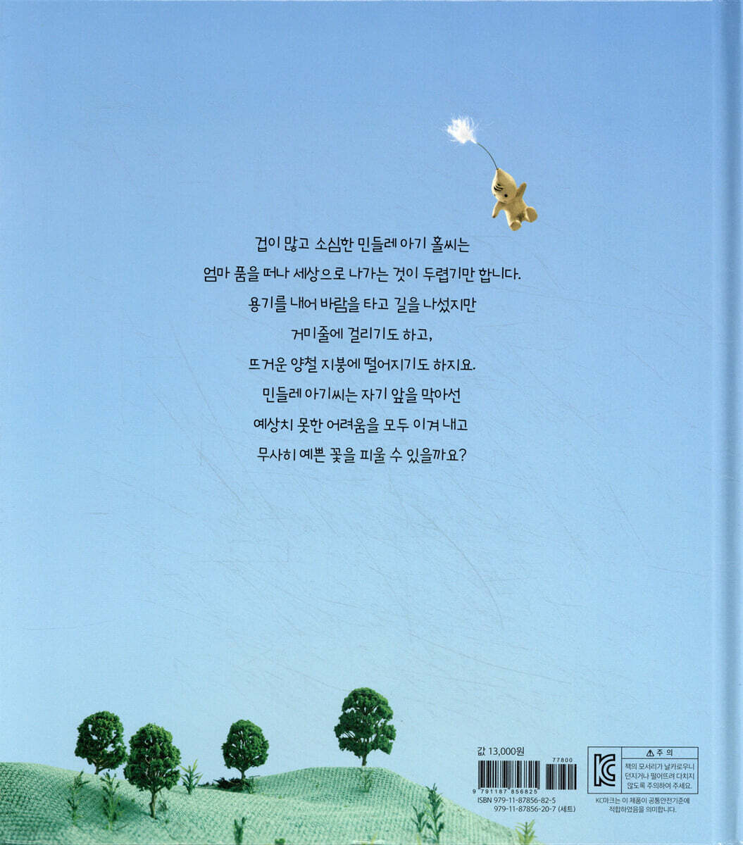 겁이 많고 소심한 민들레 아기 홀씨는 엄마 품을 떠나 세상으로 나가는 것이 두렵기만 합니다. 용기를 내어 바람을 타고 길을 나섰지만 거미줄에 걸리기도 하고, 뜨거운 양철 지붕에 떨어지기도 하지요. 민들레 아기씨는 자기 앞을 막아선 예상치 못한 어려움을 모두 이겨 내고 무사히 예쁜 꽃을 피울 수 있을까요?