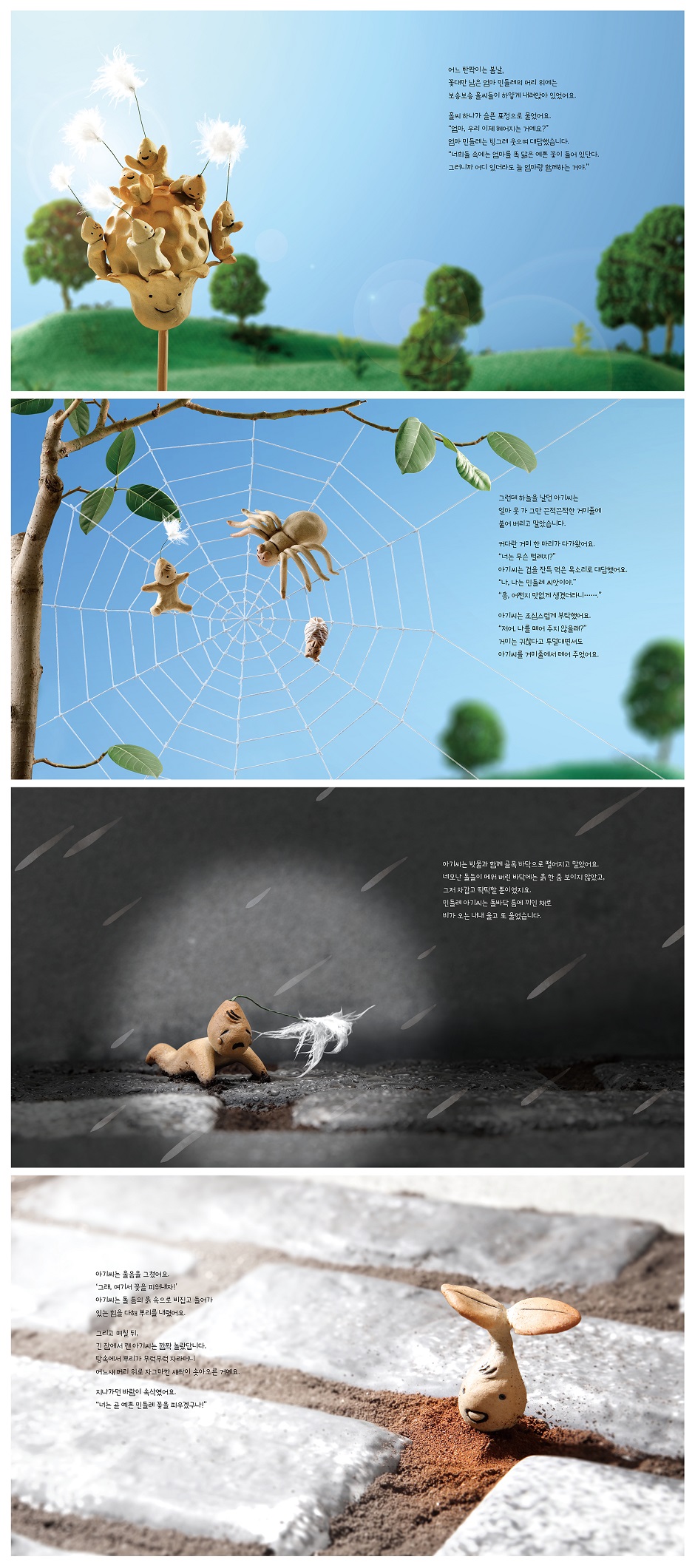 얼핏 보면 쿠키처럼 보이는 『민들레 아기씨』의 등장인물들은 전부 흙으로 빚어 만든 도자기 인형들입니다. 유악 없이 흙의 투박한 재질 그대로를 살려 구워내었기 때문에 편안하고 따뜻한 느낌이지요. 감성을 자극하는 귀엽고 사랑스러운 캐릭터들이 어린이 친구들을 만나러 갈 거예요. 이 책을 읽는 모든 어린이 독자들이, 살아가는 동안 거친 빗방울을 만날지라도 결코 포기하지 않고 마침내 민들레 아기씨와 같은 예쁜 꽃을 피워내기를 바랍니다.