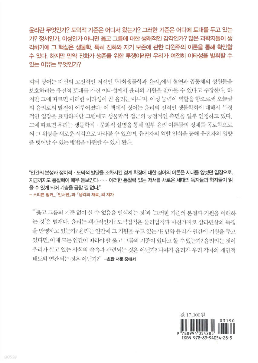 『타임』 지 선정 ‘세계에서 가장 영향력 있는 인물 100인’에 오른 피터 싱어의 고전적 저작 윤리란 무엇인가? 도덕적 기준은 어디서 왔는가? 그러한 기준은 어디에 토대를 두고 있는가? 정서인가, 이성인가 아니면 옳고 그름에 대한 생래적인 감각인가? 많은 과학자들이 생각하기에 그 핵심은 생물학, 특히 진화와 자기 보존에 관한 다윈주의 이론을 통해 확인할 수 있다. 하지만 만약 진화가 생존을 위한 투쟁이라면 우리가 여전히 이타성을 발휘할 수 있는 이유는 무엇인가? 피터 싱어는 자신의 고전적인 저작인 『사회생물학과 윤리』에서 혈연과 공동체의 성원들을 보호하려는 유전적 토대를 가진 이타성에서 윤리의 기원을 찾아볼 수 있다고 주장한다. 하지만 그에 따르면 이러한 이타성이 곧 윤리는 아니며, 이성 능력이 역할을 함으로써 오늘날의 윤리로의 발전이 이루어졌다. 이 책에서 싱어는 윤리의 전적인 생물학화에 대해서 부정적인 입장을 표명하지만 그럼에도 생물학적 접근의 긍정적인 측면을 일부 인정하고 있다. 그에 따르면 우리는 생물학적·문화적 설명을 통해 일부 윤리 이론들의 정체를 폭로함으로써 그 위상을 새로운 시각으로 바라볼 수 있으며, 유전자의 역할 인식을 통해 유전자의 영향을 벗어날 수 있는 방법을 마련할 수 있게 된다. 동물 해방 운동의 바이블이라 일컬어지는 『동물 해방』을 잇는 피터 싱어의 고전적 저작. 만약 ‘무엇인가를 해야 할 이유가 있음을 충분히 인식한 사람일지라도 반드시 그에 의해 동기 지워지는 것은 아니다’는 것을 인정함으로써만 행동을 할 객관적 이유가 있다는 주장의 설득력을 인정받는다면 우리가 너무 많은 희생을 대가로 승리를 거둔 것은 아닌가? 우리가 ‘당신이 옥스팜에 기부해야 할 객관적인 이유가 있다’고 이야기할 수 있을지 모르지만, 만약 당신이 기부하게 할 동기를 갖게 할 수 없다면 빈자들의 형편은 나아지지 않을 것이다. 그럼에도 만약 우리가 객관적인 규범적 진리라는 개념을 받아들일 수 있다면, 우리는 일상생활 속에서의 도덕적 직관에 호소하는 방법의 대안을 갖게 되었다고 분명 말할 수 있을 것이다. 오늘날의 최선의 과학적 이해에 따르면 일상생활 속에서의 도덕적 직관은 우리 진화사의 어떤 시기에 적응에 도움이 되었음이 입증된 정서에 기초를 둔 반응이다. 그런데 객관적인 도덕적 진리가 존재한다면 우리는 ‘이러한 직관의 반응’과 ‘모든 이성적인 쾌고 감수 능력이 있는 존재’를 구분할 수 있다는 희망을 가질 수 있을 것이다.-피터 싱어, 「2011년판 후기」 중에서 |