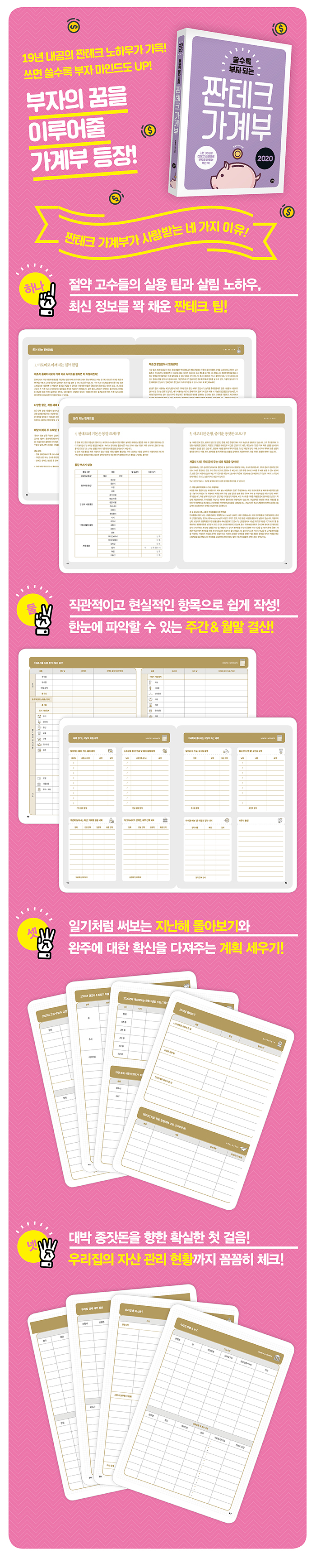 한 권의 살림 책을 보듯 읽어나가는 9가지 짠테크 팁! 사용자가 빈 칸을 어떻게 채울지 고민할 필요가 없도록 사용 가이드가 더욱 상세하게 작성되었다. 일부 작성이 어려운 항목은 예시를 참고해서 작성할 수 있도록 사용 가이드는 친절해졌다. 19년 내공 짠테크 고수들의 노하우를 담은 짠테크 팁은 언제 보아도 실질적인 도움이 될 수 있는 내용만을 담아 찾아보기 편하게 구성했다. 한 권의 책을 읽듯 편하게 읽다보면 재테크 고수가 되어있는 자신을 발견할 수 있을 것이다. 새로 추가된 ‘통장 쪼개기 실습, 연말정산, 간단한 냉파레시피, 간편 결제’의 내용은 가계부를 통해 재테크에 입문하는 사람들을 위한 지침이 되어줄 것이다. 완주는 완성이고, 완성은 성공이다! 자기 자신에 대한 이해로 가계부의 동기부여! 사용자가 삶에서 원하는 것이 무엇인지, 가계의 사정은 어떤지 파악하기 위한 정리표를 앞쪽에 배치하고 있다. 이를 통해 가계부를 작성하기 전 스스로를 돌아보고, 원하는 미래는 무엇인지 그려보는 시간을 가질 수 있을 것이다. 그 목표가 뚜렷할수록 완주에 대한 확신이 점점 커져가는 것을 느낄 수 있을 것이다. 자산 관리 전문가의 조언으로 작성된 계정 항목으로 가계부 완주를 가능하게 만드는 직관적인 작성 흐름! 2020년 개정판에서는 짠돌이카페 회원들의 의견과 자산 관리 전문가의 도움을 받아 정기/수시 지출 항목을 다시 선정했다. 꼼꼼하게 작성된 계정 항목은 ‘이 사용 내역은 어떤 분류인지’ 심각하게 고민하느라 시간을 허비하지 않도록 도움을 줄 것이다. 다양한 혜택과 자산을 한눈에 파악하고 관리할 수 있도록 월말 결산도 강화되었다. 특히 카드 혜택을 챙겨주는 카드 결제 내역 기록표, 연말 정산과 세금 공제 혜택을 위한 현금 및 간편 결제 내역 기록표, 저축액과 채무 잔액 기록표를 통해서 한 달에 발생한 자산의 이동을 빠짐없이 확인할 수 있다. 가계부의 작성은 월초에 고정 지출과 여윳돈을 가늠해보고, 주별로 실제 사용 내역을 작성해서 매달 끝에는 한 달 동안의 자금 변화를 확인하는 순으로 진행되는데. 사용자가 가장 직관적으로 자신의 수입과 지출, 자산 현황을 파악할 수 있도록 구성되었다. 정말로 써보면 아는데……. 사용성 개선으로 NON-뒤적뒤적 시스템 가계부가 쓰기 편하려면 어떻게 페이지를 구성해야 할지 고민했다. 《짠테크 가계부》는 주간 기록을 월간 기록으로 옮겨 적을 때, 힘들게 모든 페이지를 옮겨 다닐 필요가 없다. 살짝 힌트를 주면, ‘살짝 넘겨보기’만 하면 된다. 수도 없이 가계부를 뒤적이는 수십, 수백만 가계부 라이터의 소중한 엄지와 검지의 지문을 지켜주고 싶었다. |