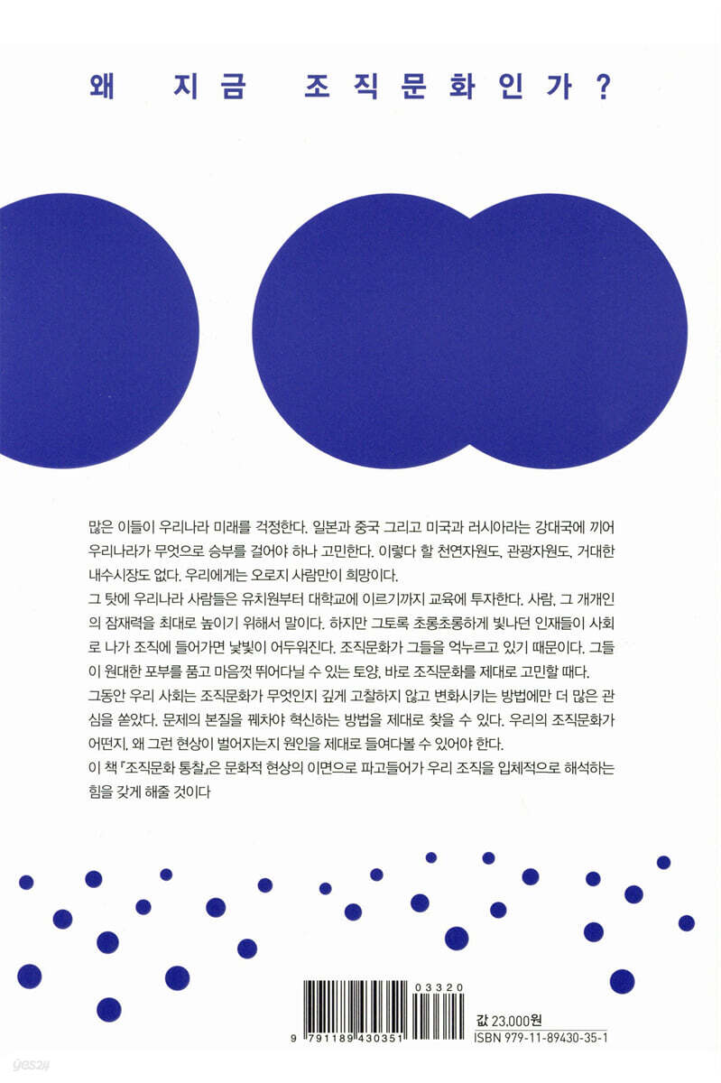 1부 문화가 지배한다 1. 왜 문화를 고민할까? 문화가 일하는 방식을 지배한다 문화가 전략을 낳고 선택하고 자라게 한다 2. 조직문화는 무엇인가? 무엇이 조직문화인가? (학자들은 문화와 풍토를 구분한다 / 문화와 풍토의 어원 / 사례로 보는 두 개념의 차이 학자들은 어떻게 정의할까?) 학자들이 그린 그림을 감상해보자 (조직문화 연구 대가 에드거 샤인 / 에드거 샤인의 조직문화를 구성하는 세 가지 차원 / 조직문화를 더욱 쉽게 정의해보자 / 조직문화는 ‘보이지 않는 율법’이다 / 조직문화는 ‘컴퓨터 운영체제’이다 / 조직문화는 ‘토양’이다) 3. 조직문화는 어떻게 형성되는가? 한 나라의 문화가 투영된다 (나와 타인은 어떤 관계인가? / 나와 타인은 다른가, 같은가? / 대기업 신입사원 교육이 대변하는 우리나라 문화) 조직의 초기 세팅이 어떤 영향을 미칠까? (우리는 무엇을 팔아서 돈을 벌고 성장했는가? / 핵심 성공 요인은 무엇인가? / 누가 태초를 창조했는가?) 따르거나 떠나거나 때로는 문화 반역이 벌어지기도 한다 (GM의 주류 문화를 반하다 / 건설사의 반문화가 주류 문화가 되다) 4. 우리나라 조직에서 발견할 수 있는 독특한 문화들 엘렌 무어가 관찰한 한국의 기업문화 (명함 예절 / 호칭 예절 / 팀 관리 방법 / 회식문화 / 음주문화 / 퇴근문화 / 갑질문화) 마이클 코켄이 관찰한 한국의 회식문화 (왜 우리 민족은 함께 먹기를 즐겼을까? / 회식의 장점을 꼽아보자 / 왜 우리는 회식이 부담스러울까?) 내가 술을 마시는가, 술이 나를 마시는가 (주도를 강제하는 문화 / 술을 강제하는 문화) 5. 수평적 문화는 수평적이지 않다 -문화에 대한 흔한 오해 어느 문화가 더 좋다고 말할 수 있을까? 수평적 조직문화란 무엇인가? (언제부터 우리나라는 수평적 문화라는 표현을 사용했을까? / 수평적 문화라는 표현이 태동한 계기는 무엇일까? / 수평적 문화를 경험한 사건 / 수평적 문화라는 표현이 확산된 계기 / 해외에서는 수평적 문화라는 표현을 사용할까? / 해외 연구자들은 ‘수평적 문화’라는 표현을 사용할까? / 수평, 그 표현의 문제 / ‘수평적 문화’를 사용할 때 유의할 점 / ‘수평적 문화’를 어떻게 정의하면 좋을까?) 펀경영이 정말 좋을까? (펀경영의 긍정적인 측면은 무엇일까? / 펀경영의 부정적인 측면은 무엇일까? / 그래서 펀경영을 어떻게 해야 하는가?) 왜 CEO는 ‘강한 문화’를 좋아할까? (강한 문화란 무엇인가? / 강한 문화의 긍정적 측면은 무엇일까? / 강한 문화의 부정적 측면은 없을까? / 그래서 뭐 어쩌면 좋을까?) 충성심과 주인의식이 과연 좋을까? (나는 나고 너는 너지만 우리는 좋은 사이야-조직몰입 / 내가 너고 네가 나야-조직동일시 나는 너를 소유하고 있어-심리적 주인의식 / 우리 조직에서는 어떤 상태가 바람직할까?) 6. 스타트업과 대기업의 문화는 어떻게 다를까? 왜 스타트업일까? 양쪽 세상을 탐구하기 위한 접근 방법 이들의 기본 가정을 탐구해보자 (나와 타인은 연결되어 있는가, 개별적인가? / 나와 타인은 서로 같은가, 다른가?) 대기업과 스타트업의 세계관 대기업과 스타트업의 사고관 (논리와 분석을 사랑하는 논리형 사람들 / 직관과 영감을 사랑하는 직관형 사람들 / 왜 이런 차이가 나는 것일까? / 논리형 vs 직관형 중 더 나은 스타일이 있을까? / 대기업, 왜냐고 묻지 않을 용기 / 대기업 시스템을 움직이는 소프트웨어 / 원래 논리는 동양이 선호하는 사고관이 아니었다 / 대기업이 논리형을 선호하게 된 배경은 무엇일까? / 그래서 대기업은 어떻게 해야 하는가? / 스타트업에서 사고관 차이로 인한 충돌을 잘 관찰해보자) 2부 어떻게 조직문화 보는 눈을 키울 수 있을까? 1. 우리 조직에는 어떤 현상들이 관찰되나? 권력과 주차장의 상관관계 우리는 엘리베이터 안에서 어떤 모습인가? 사무실에 들어서면 펼쳐지는 풍경은 어떤가? (책상은 어떠한가? / 의자는 어떠한가? / 사무실 공간 배치는 어떠한가? / 사무 공간의 역사적 발전) 우리는 추리닝과 군복 사이에 어디인가? 직장인의 애환이 담기는 보고서 왜 회의를 이렇게 할까? 우리 회사 홈페이지에 문화가 투영된다 2. 구성원들은 어떻게 생각할까? 언더커버 보스처럼 낯선 눈의 내부인은 어떻게 볼까? 내부인이 외부인처럼 보는 방법이 없을까? 사내 게시판에는 어떤 은유적인 메시지가 담겨 있을까? 3. 설문조사를 해야 할까? 조직문화 진단은 곧 설문조사를 의미할까? 진단 모델은 멋있어 보이긴 한다 (톰 피터스가 만든 맥킨지 7S 모델 / 로버트 퀸이 제시한 경쟁가치모형 / 다니엘 데니슨의 진단 모형) 모델을 벗어나야만 진정한 조직문화가 보인다 어떻게 진단 설문 문항을 만드는가? (레퍼런트를 살펴보자 / 설문 길이를 검토해보자) 4. 근본 원인을 분석해보자 호랑이 담배 피우던 시절을 탐구해보자 우리는 어떤 산업에서 땀을 흘리고 있는가? 이 부족의 창조주-창업자는 어떤 특성이 있는가? (창업자의 기질과 성격은 어떠한가? / 창업자의 가치관은 어떠한가?) 우리 조직에는 어떤 전설이 있는가? (규칙 준수·깨기 / 성장 신화 / 왕자 모시기) 우리 조직은 어떤 변곡점을 겪었는가? 우리 회사 문화의 아이콘, CEO와 임원 (그가 자라온