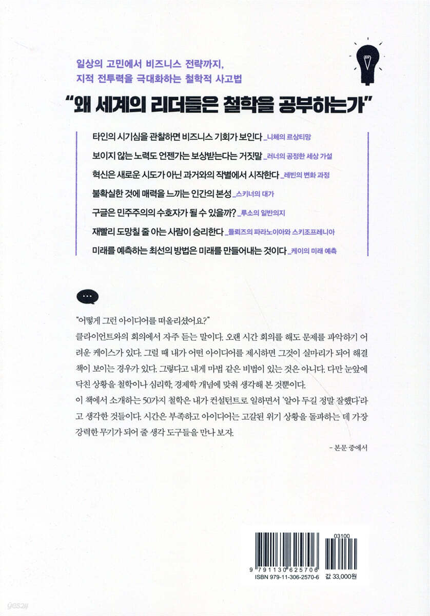 1부 무기가 되는 철학 철학을 배우는 새로운 방법 왜 철학 앞에서 좌절하는가? 2부 지적 전투력을 극대화하는 50가지 철학·사상 1장 ‘사람’에 관한 핵심 콘셉트 - 왜 이 사람은 이렇게 행동할까? 01 타인의 시기심을 관찰하면 비즈니스 기회가 보인다 : 프리드리히 니체_르상티망 02 우리는 모두 가면을 쓰고 살아간다 : 카를 구스타프 융_페르소나 03 성과급으로 혁신을 유도할 수 있을까? : 에드워드 데시_예고된 대가 04 사람은 논리만으로 움직이지 않는다 : 아리스토텔레스_수사학 05 노력하면 구원받을 수 있다고 신은 말하지 않았다 장 칼뱅_예정설 06 타고난 능력이란 없다, 경험을 통해 인간은 무엇이든 될 수 있다 : 존 로크_타불라 라사 07 자유는 견디기 어려운 고독과 통렬한 책임을 동반한다 : 에리히 프롬_자유로부터의 도피 08 불확실한 것에 매력을 느끼는 인간의 본성 : 버러스 프레더릭 스키너_대가 09 인생을 예술 작품으로 대한다면 : 장 폴 사르트르_앙가주망 10 악의가 없어도 누구나 악인이 될 수 있다 : 한나 아렌트_악의 평범성 11 자아실현을 이룬 사람일수록 인맥이 넓지 않다 : 에이브러햄 매슬로_자아실현적 인간 12 행동을 정당화하기 위해 기꺼이 생각을 바꾸는 사람들 : 리언 페스팅어_인지 부조화 13 개인의 양심은 아무런 힘이 없다 : 스탠리 밀그램_권위에의 복종 14 언제 일에서 만족감을 느낄 수 있을까? : 미하이 칙센트미하이_몰입 2장 ‘조직’에 관한 핵심 콘셉트 - 왜 이 조직은 바뀌지 않을까? 15 뛰어난 리더의 조건 : 니콜로 마키아벨리_마키아벨리즘 16 끝까지 이의를 제기하는 사람이 있는가? : 존 스튜어트 밀_악마의 대변인 17 붕괴된 가족과 공동체의 새로운 대안 : 페르디난트 퇴니에스_게마인샤프트와 게젤샤프트 18 혁신은 새로운 시도가 아닌 과거와의 작별에서 시작한다 : 쿠르트 레빈_변화 과정 19 권위를 만드는 세 가지 요소 : 막스 베버_카리스마 20 이해할 수 없는 사람과 함께 일해야만 하는 이유 : 에마뉘엘 레비나스_타자의 얼굴 21 가난한 사람은 더 가난해지고 부유한 사람은 더 부유해진다 : 로버트 킹 머튼_마태 효과 22 협조할 것인가, 배신할 것인가 : 존 내시_내시 균형 23 왜 기장이 조종할 때 사고 발생 확률이 더 높을까? : 헤이르트 호프스테더_권력 거리 24 안정이 계속될수록 축적되는 리스크 : 나심 니콜라스 탈레브_반反취약성 3장 ‘사회’에 관한 핵심 콘셉트 - 지금 무슨 일이 일어나고 있는가? 25 어떻게 시스템은 인간을 소외시키는가 : 카를 마르크스_소외 26 독재에 의한 질서 vs. 자유가 있는 무질서 : 토머스 홉스_리바이어던 27 구글은 민주주의의 수호자가 될 수 있을까? : 장 자크 루소_일반의지 28 머리로 생각할 수 있는 최적의 방법에는 한계가 있다 : 애덤 스미스_보이지 않는 손 29 돌연변이가 발생하는 것은 자연스러운 일이다 : 찰스 다윈_자연도태 30 업무 방식 개혁 앞에 놓인 무서운 미래 : 에밀 뒤르켐_아노미 31 경제학으로 설명되지 않는 새로운 관계 : 마르셀 모스_증여 32 성 편견으로부터 얼마나 자유로운가? : 시몬 드 보부아르_제2의 성 33 재빨리 도망칠 줄 아는 사람이 승리한다 : 질 들뢰즈_파라노이아와 스키조프레니아 34 공평한 사회일수록 차별에 의한 상처가 깊다 : 세르주 모스코비치_격차 35 감시당하고 있다는 심리적 압박 : 미셸 푸코_패놉티콘 36 사람들은 필요해서가 아니라 다르게 보이기 위해 돈을 쓴다 : 장 보드리야르_차이적 소비 37 보이지 않는 노력도 언젠가는 보상받는다는 거짓말 : 멜빈 러너_공정한 세상 가설 4장 ‘사고’에 관한 핵심 콘셉트 - 어떻게 사고의 함정에 빠지지 않을 수 있을까? 38 ‘결국 이런 뜻이죠?’라고 말하면 안 되는 이유 : 소크라테스_무지의 지 39 이상은 이상일 뿐, 환상에 사로잡히지 말지어다 : 플라톤_이데아 40 오해에는 여러 유형이 있다 : 프랜시스 베이컨_우상 41 생각은 아웃소싱할 수 없다 : 르네 데카르트_코기토 42 진보는 나선형 발전으로 이루어진다 : 게오르크 헤겔_변증법 43 사고의 폭을 넓히고 싶다면 어휘력을 길러라 : 페르디낭 드 소쉬르_시니피앙과 시니피에 44 때로는 판단을 보류하는 것이 도움이 된다 : 에드문트 후설_에포케 45 과학적인 것이 꼭 옳은 것은 아니다 : 카를 포퍼_반증 가능성 46 에디슨은 축음기를 유언장의 대체품으로 발명했다 : 클로드 레비스트로스_브리콜라주 47 조급해하지 마라, 세상은 그렇게 갑자기 바뀌지 않는다 : 토머스 쿤_패러다임 전환 48 이분법을 넘어서라 : 자크 데리다_탈구축 49 미래를 예측하는 최선의 방법은 미래를 창조하는 것이다 : 앨런 케이_미래 예측 50 사람은 뇌뿐만 아니라 몸으로도 생각한다 : 안토니오 다마지오_신체적 표지 역자 후기 칸트와 스피노자 없이 철학을 이야기하는 법 |