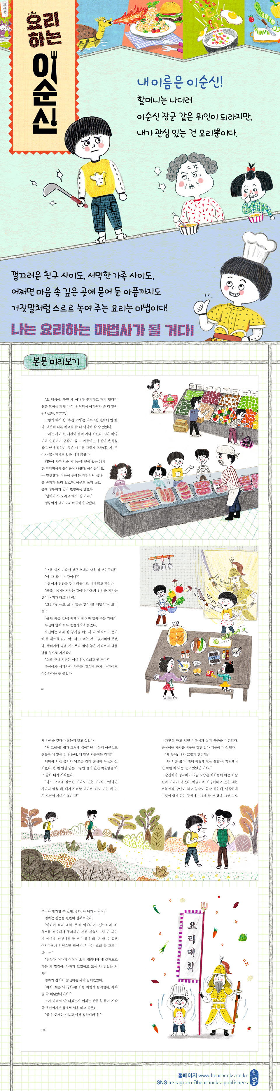 한산초등학교 5학년 이순신은 할머니가 지어 준 제 이름이 부담스럽기만 합니다. 사람들이 이순신이라는 이름만 듣고 선입견을 갖는 것도, 순신이의 실체(?)를 알고 실망하는 것도 마음이 편치 않은 까닭입니다. 다른 아이들과 달리 ‘엄친아’가 어른에다 위인인 것도 억울하기 짝이 없습니다. 할머니는 걸핏하면 이순신 장군을 들먹이며 순신이를 닦달하지만, 사실 순신이는 공부에도 운동에도 영 소질이 없습니다. 남들 앞에 나서는 것도 남들과 부딪치는 것도 끔찍하게 싫어합니다. 그런 순신이가 딱 하나 관심 있는 것은 바로 요리입니다. 할머니는 남자가 부엌에 들어가면 큰일이라도 나는 줄 알지만, 사고로 세상을 떠난 순신이 아빠도 요리를 잘했습니다. 순신이 엄마도 그 요리 솜씨에 반해서 결혼을 결심했을 정도지요. 아빠는 가족들에게 사랑이 가득 담긴 건강한 음식을 만들어 먹이는 걸 큰 기쁨으로 여겼습니다. 순신이도 아빠를 닮아 요리하는 걸 좋아합니다. 할머니의 눈을 피해 단짝 친구 아름이와 비영이에게 가져다줄 간식을 만드는 것이 요즘 순신이의 즐거움이지요. 자주 아침을 굶고 오는 두 친구는 동생 우신이와 달리 순신이의 요리를 맛있게 먹어 주거든요. 그런데 그런 순신이를 영 못마땅하게 보는 친구가 있습니다. 얼굴도 잘생기고, 키도 크고, 운동도 잘하고, 심지어 공부까지 잘하는 유성룡입니다. 성룡이는 순신이만 보면 시비를 걸지 못해 안달입니다. 사내자식이 계집애처럼 만날 요리냐는 둥, 돈만 있으면 얼마든지 사 먹을 수 있는 걸 굳이 만들어 와서 요란을 떤다는 둥 하면서 말입니다. 그것만이 아닙니다. 아름이와 비영이에게 주려고 만들어 온 샌드위치를 통째로 가로채기도 하고, 급기야는 순신이의 소풍 가방을 훔쳐 내 쓰레기통에 처박기까지 합니다. 성룡이는 왜 이렇게 순신이에게 못되게 구는 걸까요? 순신이는 성룡이의 괴롭힘에서 벗어날 수 있을까요? 평범한 아이들을 위한 맛깔난 응원 순신이는 요리를 좋아하는 것 말고는 딱히 이렇다 하게 내세울 점이 없는 아이입니다. 요리도 좋아하기는 하나 잘한다고 하기에는 조금 애매한 구석이 있습니다. 꼬마김밥에 건포도, 바나나 땅콩버터 샌드위치에 핫소스, 잡채에 크림소스같이 좀처럼 어울릴 것 같지 않은 조합을 과감히 시도하는 탓이지요. 요리에 있어서만큼은 도전 정신이 넘친다고나 할까요. 그 바람에 동생 우신이에게 ‘오빠가 해 준 스파게티보다 코딱지가 더 맛있다’는 혹평을 듣기도 합니다. 그뿐인가요. 친구 따라 강남 가는 격으로 요리 대회에 참가한 성룡이가 3위에 입상할 때 순신이는 특별상 격인 톡톡상을 수상하는 데 그칩니다. 사실 순신이의 장점은 빼어난 요리 솜씨에 있지 않습니다. 그보다는 누가 뭐라고 하든 좋아하는 것을 계속해 나가는 데 있지요. 순신이는 이 험한 세상을 어찌 살아갈까 싶은 순둥이입니다. 할머니에게 잔소리 좀 들었다고 눈물 바람부터 하고, 성룡이가 시비를 걸어 와도 변변한 대거리 한번 못합니다. 하지만 좋아하는 요리에 있어서만큼은 양보가 없습니다. 할머니가 말려도, 동생이 악평을 해도, 성룡이가 비아냥거려도, 순신이는 꾸역꾸역 요리를 합니다. 아침을 거르기 일쑤인 아름이와 비영이를 위해, 소풍 도시락을 챙겨 줄 사람 없는 성룡이를 위해, 돌아가신 아빠를 위해……. 좋아하는 일을 잘하기까지 한다면 그보다 좋을 수는 없겠지요. 하지만 지금 당장 잘하지 못한다고 해서 좋아하는 마음을 감추거나 거둘 필요는 없습니다. 좋아하는 일을 잘하게 되기까지는 시간이 필요한 법이니까요. 그리고 무언가를 지극히 좋아하는 마음은 그 자체만으로 많은 것을 바꾸어 놓곤 합니다. 요리를 좋아하는 순신이의 마음이 성룡이의 미움을, 할머니의 편견을, 성룡이 아빠의 무관심을, 그리고 순신이 자신의 상처를 스르르 녹여 버렸듯 말이지요. |