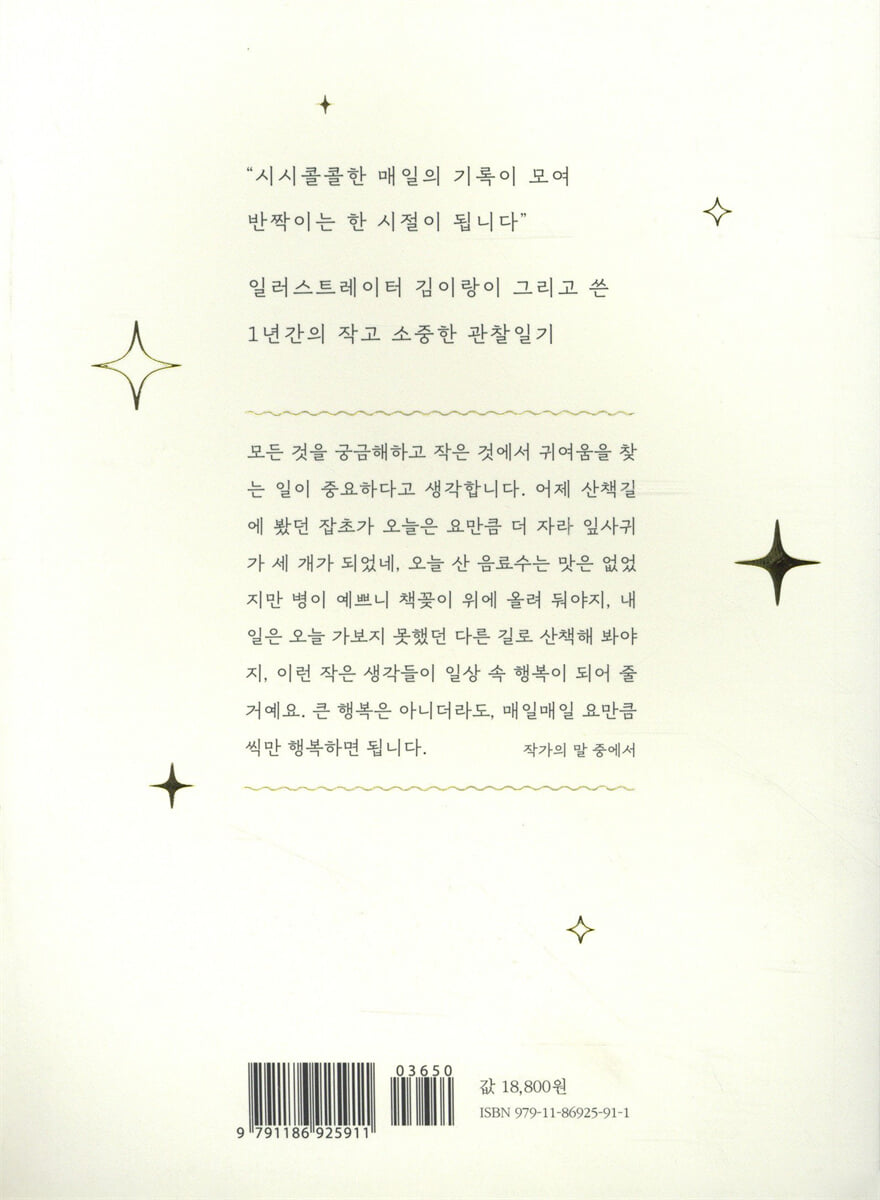 365개의 수채화 관찰일기 매일, 한결같이 예쁜 수채화를 그리는 일러스트레이터 김이랑. 그녀의 첫 책 『1일 1그림』이 나온 지도 벌써 3년이 흘렀습니다. 첫 책이 나온 그때도, 열 번째 책을 집필한 지금도 김이랑 작가가 늘 강조하는 것은 ‘꾸준히 그리기’예요. 좋아하는 일을 더 잘하고 싶나요? 그럼 그 일을 매일, 조금씩이라도 꾸준히 해볼 것을 추천합니다. 『오늘의 좋아하는 것들』 역시 꾸준함의 결과입니다. 특별할 것 없이 반복되는 일상 속에서도 매일 그날그날 발견한 작고 소중한 것들을 기록해 완성한 책이거든요. 김이랑 작가의 1년이 고스란히 담긴, 그녀의 인생 한가운데를 툭 잘라 담아낸 일기들입니다. 사소한 것들을 소중히 바라볼 줄 아는 작가의 하루하루는 누구라도 펼쳐 보고 싶을 만큼 사랑스럽습니다. ‘좋아하는 것들’에 대한 기록인 만큼 사적인 취향도 듬뿍 담겨 있어요. 세심한 관찰자의 시선으로 바라본 이것저것들의 이야기가 무척 흥미롭습니다. 큰 사랑을 받고 있는 일러스트레이터의 일상, 수집가의 자세로 모은 작지만 쓸데없고 예쁜 것들, 술과 커피를 좋아하고 자기 전 영화 보는 시간을 사랑하며 산책을 즐기고 동물과 식물을 진심으로 아끼는, 평범한 30대 여성으로서의 날들. 자신의 하루를 돌아보고 기록하는 일은 나의 시간을 소중히 기억하는 일이기도 합니다. 오늘은 당신에게 어떤 하루였나요? 그날의 장면을 대충, 조금씩이라도 기록해 보세요. 시시콜콜한 매일의 기록이 모여 반짝이는 한 시절이 된답니다. |
