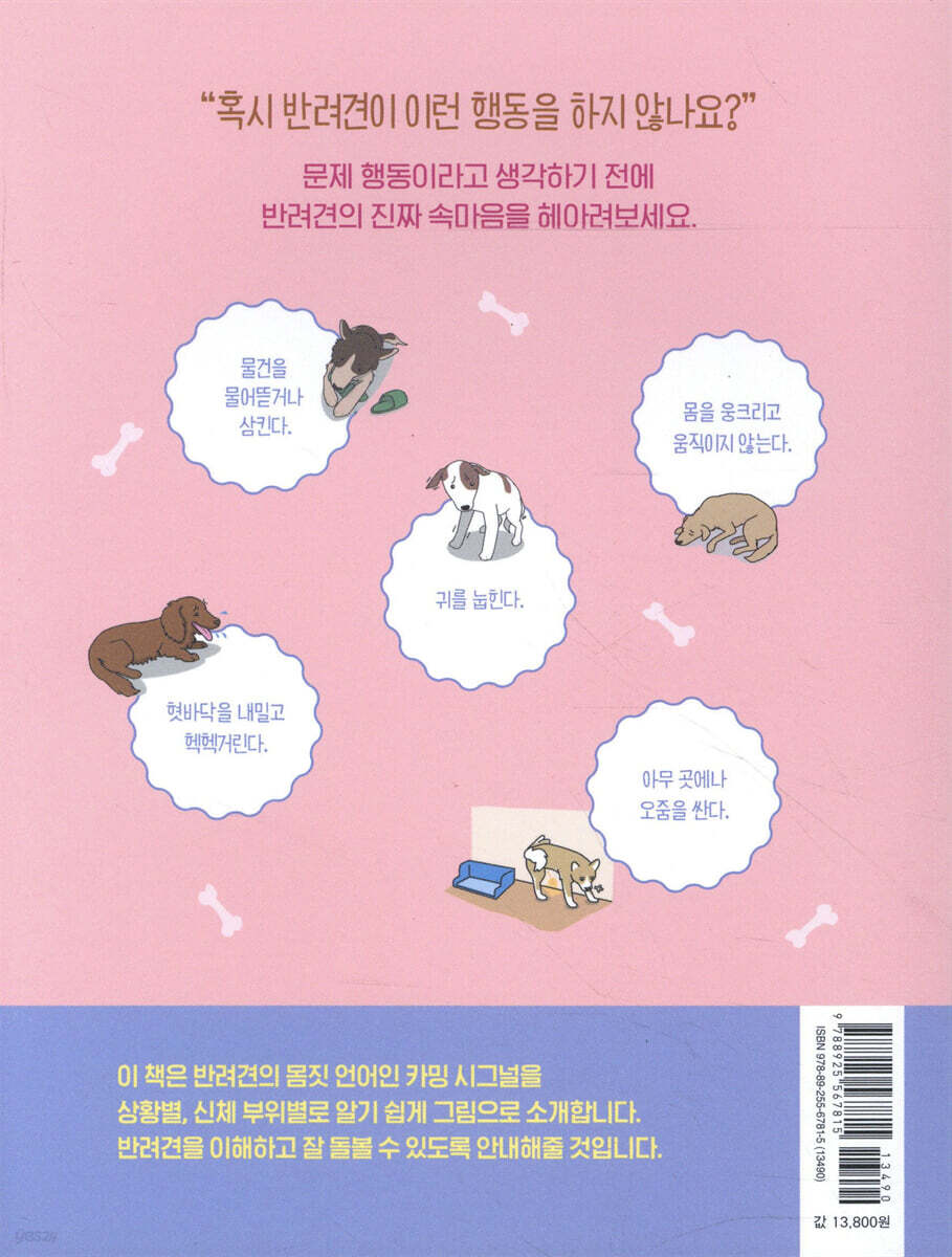 알아둬야 할 반려견 언어 카밍 시그널 1장 상황별 행동으로 알 수 있는 속마음 산책할 때 1 갑자기 멈춰 서서 버틴다 산책할 때 2 끊임없이 냄새를 맡는다 산책할 때 3 다른 개와 만나도 모른 척한다 산책할 때 4 다른 개의 냄새를 맡는다 산책할 때 5 다른 개에게 짖거나 으르렁댄다 산책할 때 6 모르는 사람에게 꼬리를 흔든다 산책할 때 7 자기보다 작은 동물을 향해 짖는다 반려견 놀이터에서 다른 개와 쫓고 쫓기며 논다 미용실에서 목욕이나 미용 중 하품을 한다 동물병원에서 진찰대 위에서 바들바들 떤다 반려견 카페에서 가만히 있지 못한다 차 안에서 차에 타면 산만해진다 집에서 식사할 때 1 식사 시간이 되면 ‘앉아’를 한다 집에서 식사할 때 2 밥을 먹지 않는다 집에서 장난칠 때 물건을 물어뜯거나 삼킨다 집에서 배변할 때 1 자기 오줌을 피한다 집에서 배변할 때 2 지정된 장소가 아닌 곳에 배변을 한다 집에 손님이 왔을 때 1 손님을 보고 짖는다 집에 손님이 왔을 때 2 초인종이 울리면 격렬하게 짖는다 집에 손님이 왔을 때 3 손님을 환영하고 기뻐 날뛴다 집에서 창밖을 볼 때 바깥을 향해 짖어댄다 집에서 목욕할 때 귀를 뒤로 젖히고 몸이 경직된다 집에서 놀이를 할 때 놀아줄 때 너무 흥분한다 집에서 잠잘 때 자기 전 땅을 파는 동작을 한다 Special_반려견 사회화 교육 2장 신체 부위별 몸짓 언어로 알 수 있는 속마음 짖음 1 경쾌하게 짖으며 상반신을 숙인다 짖음 2 경쾌하게 짖으며 여기저기 뛰어다닌다 짖음 3 높은 톤으로 짖는다 낑낑댐 자기 집에서 낑낑댄다 으르렁거림 1 상대를 노려보고 으르렁대며 짖는다 으르렁거림 2 이빨을 드러내고 낮은 톤으로 으르렁댄다 꼬리의 움직임 1 꼬리를 좌우로 활발하게 흔든다 꼬리의 움직임 2 꼬리를 흔들며 하반신까지 흔든다 꼬리의 움직임 3 꼬리를 내린 채 부드럽게 흔든다 꼬리의 움직임 4 꼬리를 가랑이 사이에 말아 넣는다 꼬리의 움직임 5 꼬리를 위쪽으로 바짝 세운다 입 주변의 움직임 1 험악한 얼굴로 이빨을 드러낸다 입 주변의 움직임 2 살짝살짝 문다 입 주변의 움직임 3 천을 물고 잡아당긴다 입 주면의 움직임 4 혼이 나는 와중에 하품을 한다 혀의 움직임 1 입과 코를 혀로 핥는다 혀의 움직임 2 혀를 내밀고 헉헉댄다 혀의 움직임 3 자기 다리를 핥는다 혀의 움직임 4 보호자의 입 주변을 핥는다 귀의 움직임 1 귀를 세우고 한 방향을 주시한다 귀의 움직임 2 귀를 젖힌다 코의 움직임 코를 실룩대며 냄새를 맡는다 눈의 움직임 1 보호자와 아이콘택트를 한다 눈의 움직임 2 눈이 촉촉해진다 눈의 움직임 3 시선을 피해 눈을 돌린다 눈의 움직임 4 상대를 응시한다 다리의 움직임 1 한쪽 발만 살짝 든다 다리의 움직임 2 뒷다리를 접어 몸을 낮춘다 다리의 움직임 3 앞다리로 버티며 움직이려 하지 않는다 다리의 움직임 4 보호자를 앞발로 건드린다 몸의 움직임 1 몸을 웅크린 채 움직이지 않는다 몸의 움직임 2 점프해서 보호자에게 달려든다 몸의 움직임 3 자기 꼬리를 쫓아 빙빙 돈다 몸의 움직임 4 배를 보인다 몸의 움직임 5 불쌍한 표정으로 머리를 약간 숙인다 Special_여러 마리의 개를 키울 때 3장 조심해야 할 반려견의 질병과 홈케어 몸의 이상을 보여주는 사인 질병의 징후를 놓치지 말자 신체 부위 별 반려견의 상태를 살펴보자 질병 예방을 위한 예방 접종 발정·임신·출산 기분 좋은 생활을 위한 데일리 홈케어 몸의 청결함을 위한 홈케어 4장 반려견과 좀 더 좋은 관계 맺기 반려견과 좀 더 사이좋게 지내기 위한 Q&A INDEX |