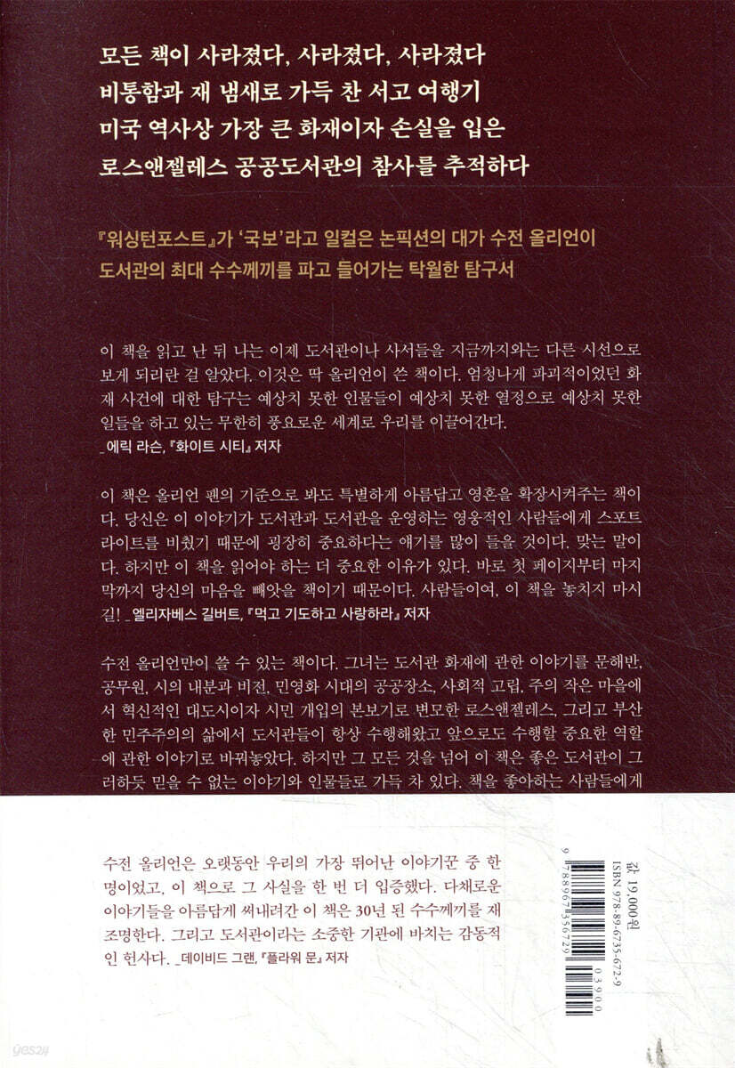 이 책을 읽고 난 뒤 나는 이제 도서관이나 사서들을 지금까지와는 다른 시선으로 보게 되리란 걸 알았다. 이것은 딱 올리언이 쓴 책이다. 엄청나게 파괴적이었던 화재 사건에 대한 탐구는 예상치 못한 인물들이 예상치 못한 열정으로 예상치 못한 일들을 하고 있는 무한히 풍요로운 세계로 우리를 이끌어간다. - 에릭 라슨 (『화이트 시티』 저자)