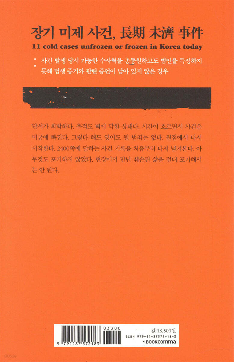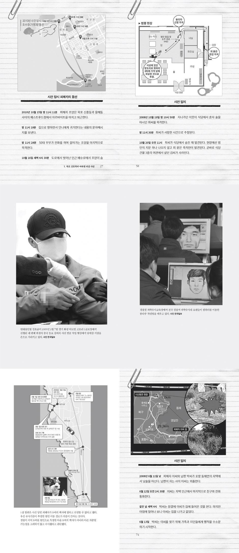 들어가는 말 1. 목포 간호학과 여대생 피살 사건 DNA 대조 2015명, 목포를 이 잡듯 뒤졌지만 ‘그놈’은 어디에 장기 미제 사건의 의미 2. 양산 택시기사 피살 사건 왼쪽 다리 저는 마지막 택시 손님… 흐릿한 폐쇄회로 TV가 야속하다 택시 안 범행 3. 광주 대인동 식당 주인 살인 사건 잠자다 둔기 맞아 숨진 동생… 늙은 형은 아직 보내줄 수 없다 장물과 족적 4. 포항 흥해 토막 살인 사건 다섯 부분 절단된 시신, 범인의 지문과 DNA 없어 ‘백지상태’ 토막 살인범이 시신 훼손하는 심리 5. 남양주 아파트 밀실 살인 사건 최첨단 보안에도 침입 흔적은 전무… “귀신도 곡할 밀실 살인” 밀실 살인 6. 청주 비닐봉지 살인 사건 얼굴에 검은 비닐봉지… 목 조른 흔적도 없는데 질식사 시신의 얼굴을 가리는 심리 7. 울산 초등학생 방화 살인 사건 시커먼 연기 속 청테이프로 손과 입 묶인 채 숨진 아이가… 방화 범행 8. 정읍 화물차 사무실 살인 사건 감쪽같이… 빚과 살인 혐의에서 도망친 ‘희귀병 40대’ 신분 세탁 9. 제주 보육교사 피살 사건 거짓말탐지기는 그가 범인이라 말하지만… 물증 없는 심증뿐 거짓말탐지기 10. 의성 뺑소니 청부 살인 사건 남편 몰래 보험 들고 뺑소니 연출… 13년 만에 술자리서 덜미 제보 전화 11. 나주 드들강 여고생 살인 사건 집에서 15킬로미터 떨어진 강변에서 알몸 시신으로… 치밀한 범행 15년 6개월 만에 기소 |