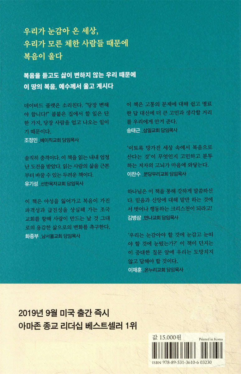 ‘이토록 망가진 세상 속에서 복음으로 산다는 것’이 무엇인지 고민하고 분투하는 저자의 고뇌가 마음에 와닿습니다. 자신의 내면을 솔직하게 보여 주는 저자의 마음 중심이 귀하게 다가오는 것은 혼미한 이 시대를 사는 우리 모두의 마음이 동일하기 때문일 것입니다. 고통하는 현실에 발 딛고 사는 우리이기에, 이 책을 통해 우리 모두가 우는 세상을 위해 함께 가슴으로 통곡할 줄 아는 그리스도인이 되기를 기도합니다. 우리의 삶이 그들의 영과 육을 살리는 공교한 전술이 되기를 기도합니다. - 이찬수 (분당우리교회 담임목사)