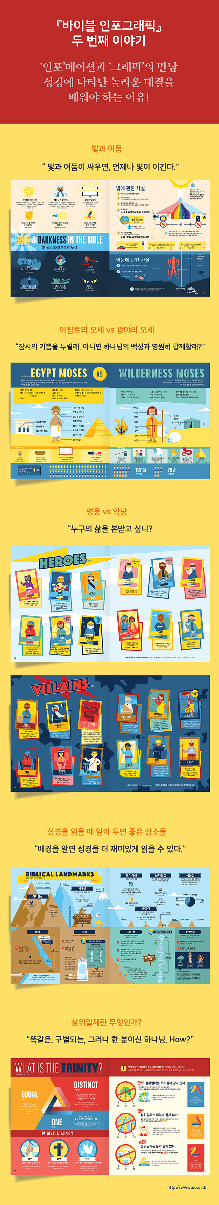 두 배 더 재밌다 사실 『바이블 인포그래픽』은 성경을 어렵고 지루하게 읽는 태도와 ‘대결’을 벌인 책이다. 지루함과 성경은 반대말이니 어느 한쪽이 이기기 마련이다. 성경을 새로운 방법으로 재미있게 읽게 하는 『바이블 인포그래픽』 두 번째 이야기가 나왔다. 『바이블 인포그래픽 2』에는 성경에 나오는 반대말을 흥미진진하게 소개한다. 지루하고 뻔한 내용 vs 성경 이야기, 비교가 안 돼! 빛 vs 어둠 - 왜 빛과 어둠을 한 장소에서 함께 볼 수 없을까? 천사 vs 어둠 - 둘 다 강하지만, 결국 한쪽이 이긴다! 하나님의 위대한 일 vs 인간의 실패 - 하나님은 엄청난 일을 하셨다. 인간들은? 흠. 악명 높은 거짓 신들 vs 참되신 한 분 하나님 - 거짓 흉내쟁이들로부터 진짜를 구분하자! 하늘 vs 지옥 - 지옥도 하늘나라도 진짜, 그러나 하늘나라는 정말 감동적이다. 이스라엘 왕들 연대표(선한 왕 vs 악한 왕) 성경 인물 트레이딩 카드(영웅 vs 악당) 부록으로 실린 ‘이스라엘 왕들 연대표’는 이스라엘 역대 왕들을 한눈에 보게 한다. 왼쪽에서 오른쪽으로 연대표의 흐름을 따라가다 보면, 구약성경의 큰 흐름을 배울 수 있을 뿐만 아니라 누가 선한 왕이고 악한 왕이었는지 인포그래픽으로 배울 수 있다. 악한 왕과 선한 왕은 등장하고 퇴장하기를 반복하지만, 그 모든 흐름을 이끄시는 분은 하나님이라는 사실을 배울 수 있다. 또 ‘성경 인물 트레이딩 카드’를 성서유니온 홈페이지(www.su.or.kr)에서 무료로 제공한다. 『바이블 인포그래픽 2』에서 배운 영웅과 악당을 누가 더 정확히 기억했는지 다양한 방법으로 확인할 수 있다. 가정과 교회와 학교에서 ‘하나님을 가까이한 영웅과 하나님을 맞선 악당’의 특징을 재미있게 익힐 수 있다. |