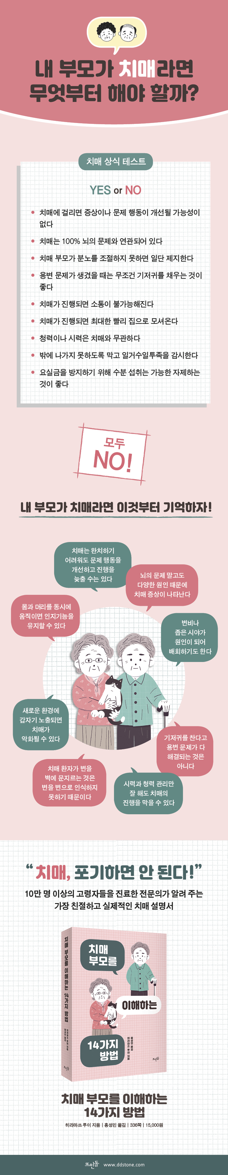 치매 부모가 자주 하는 난처한 행동 01 쉽게 화를 낸다. 폭력을 휘두른다. 성추행을 한다. 치매에 걸리면 사람들이 자신에게 나쁜 짓을 한다고 오해한다 · 청력이 저하되면 문제 행동이 나타나기도 한다 · 돌봐 주는 사람을 나쁜 사람이라고 단정하고 돌봄을 거부한다 · 우선은 진정되기를 기다린다. 소용없으면 보호 입원을 고려한다 · 사람은 죽기 전까지 성(性)적 생물 · 좋아하는 곡에 맞춰서 노래를 부르면 화도, 치매의 진행도 막을 수 있다! 치매 부모가 자주 하는 난처한 행동 02 소변을 지린다. 대변을 지린다. 기저귀를 찬다고 다 해결되는 것은 아니다 · ‘모르다’를 ‘알다’로 바꾼다. 이것이 용변 문제를 해결하는 비법 · 치매 약이 요실금을 초래하는 경우가 있다 · 치매가 아니어도 기침, 재채기에 소변을 지린다 · 취침 2시간 전에 누우면 요실금을 막을 수 있다? · 요양시설 입소자의 절반이 변실금이다 · 변실금의 주요 원인인 변비는 주위 사람에게도 책임이 있다 · 식이섬유나 치매 약이 변실금의 원인이 된다 · 변을 벽에 문지르는 고령자는 변을 변으로 생각하지 않는다 치매 부모가 자주 하는 난처한 행동 03 길거리를 배회한다. 치매에 걸렸다고 목적도 없이 배회하는 것은 아니다 · 배회의 목적부터 찾자 · 변비나 좁은 시야가 원인이 되어 배회하기도 한다 · 자물쇠를 채운 집에 두거나 24시간 지키는 건 무리 · GPS 단말기를 몸에 지니게 하고 실종되면 반경 500미터 이내를 찾는다 · 배회 SOS, 예방책을 알아 두자! 치매 부모가 자주 하는 난처한 행동 04 수면 시간이 부족하다. 밤낮이 바뀐다. 수면 부족으로 집에 가고 싶어 하거나 밤중에 배회한다 · 노화로 인한 근력 저하가 수면 부족과 치매의 원인이 된다 · 낮에도 실내를 밝게 하자 치매 부모가 자주 하는 난처한 행동 05 ‘도둑 망상’ 등 피해망상이 나타난다. 눈이나 뇌에 이상이 있으면 보이지 않는 것이 보인다 · 감사의 말을 해 주는 것만으로도 망상을 줄일 수 있다 · 장기기억과 단기기억의 불일치가 피해망상을 만들어 낸다 · ‘나는 훔치지 않았다!’고 정면으로 부정하지 않는 것이 좋다 칼럼 치매와 오감 · 운동신경과의 관계 치매 부모가 자주 하는 난처한 행동 06 집 안을 쓰레기통으로 만든다. 쓰레기를 쓰레기로 생각하지 않는다 · 갖고 싶으니까 달라고 하면 줄 때도 있다 · 필요 이상으로 물건을 많이 사는 것은 산 기억이 없기 때문만은 아니다 · 치매에 걸리면 절도를 저지르기 쉽다 · 집 안 사진을 찍어서 보면 쓰레기가 쌓인 것을 인식하기 쉽다 · 쓰레기 수거일을 잊어버려 난감한 상황이 생길 수 있다 치매 부모가 자주 하는 난처한 행동 07 기다리지 못한다. 요일, 날짜, 자신의 나이도 깜빡한다. 나이에 따라 1분의 길이를 다르게 느낀다 · 정년퇴직과 육아 종료가 요일 감각을 둔하게 만든다 · 생각이 떠오르지 않으면 건망증, 기억조차 못 하면 치매 · 오감이 둔해진 것뿐인데 치매라고 착각하는 경우가 많다 · 손으로 비둘기 모양을 만들지 못하면 치매가 의심된다 · 옛날 사진으로 치매의 진행을 막을 수 있다 · 몸과 머리를 동시에 움직이면 인지기능을 유지할 수 있다 · 치매는 걱정한다고 해결되지 않는다. 지금을 즐기자 치매 부모가 자주 하는 난처한 행동 08 기온이나 계절을 무시한 옷차림을 한다. 치매 환자들은 왜 여름에는 두꺼운 옷을, 겨울에는 얇은 옷을 입을까? · 한여름의 더운 외부보다 실내가 더 위험하다 · 고령자의 10%가 화상으로 입원까지 하게 된다 · 한겨울 밤의 목욕은 고령자에게 치명적이다 · 욕실은 따뜻하게, 입욕은 20분 이내로! 목욕을 할 때는 가족에게 알린다 · 인공호흡은 하지 않아도 심장 마사지는 반드시 해야 한다 · 심근경색과 뇌졸중 예방에는 식이섬유, 등 푸른 생선, 낫토, 바나나 · 매일매일 맨손체조 치매 부모가 자주 하는 난처한 행동 09 옷차림에 무신경해진다. 외모에 관심 있는 고령자는 많다 · 나이가 들면 단추의 크기가 절반 정도로 작게 느껴진다 · 고령자가 동전지갑을 쓰는 것은 소박해서가 아니다 · 면 혼방 소재를 고르고 새 옷은 세탁해서 입는다 · 치매에 걸려도 웃는 얼굴을 인식하는 힘은 남아 있다! · 바셀린을 바르고, 실내 가습을 하고, 손톱을 자르는 것이 좋다 · 피부에 닿는 햇빛을 차단하고 비타민 D를 섭취하자 · 왜 고령 여성은 머리칼을 파랑이나 보라색으로 염색할까? 치매 부모가 자주 하는 난처한 행동 10 새로운 것을 강하게 거부한다. 신상품과 새로운 환경은 치매를 부른다? · 왜 고령자에게는 스마트폰이 불편한 도구일까? · 온라인 게임을 즐기고 태블릿 컴퓨터를 사용하는 고령자가 있다 · 마사지기 부작용으로 불편을 호소하는 고령자가 속출한다 · 편지야말로 최고의 선물 · 자신을 고령자라고 생각하지 않는 고령자가 의외로 많다 · 여행과 독서가 새 물건이나 환경에 대한 적응력을 높인다 치매 부모가 자주 하는 난처한 행동 11 갑자기 도로로 튀어 나간다. 치매 환자들은 차에 대한 공포심이 없고 횡단보도로 건너야 한다는 개념도 없다 · 사고율이 가장 높은 시각은 저녁 6시 · 운전자에게 과실이 없어도 사고는 일어난다 · 젊은 사람