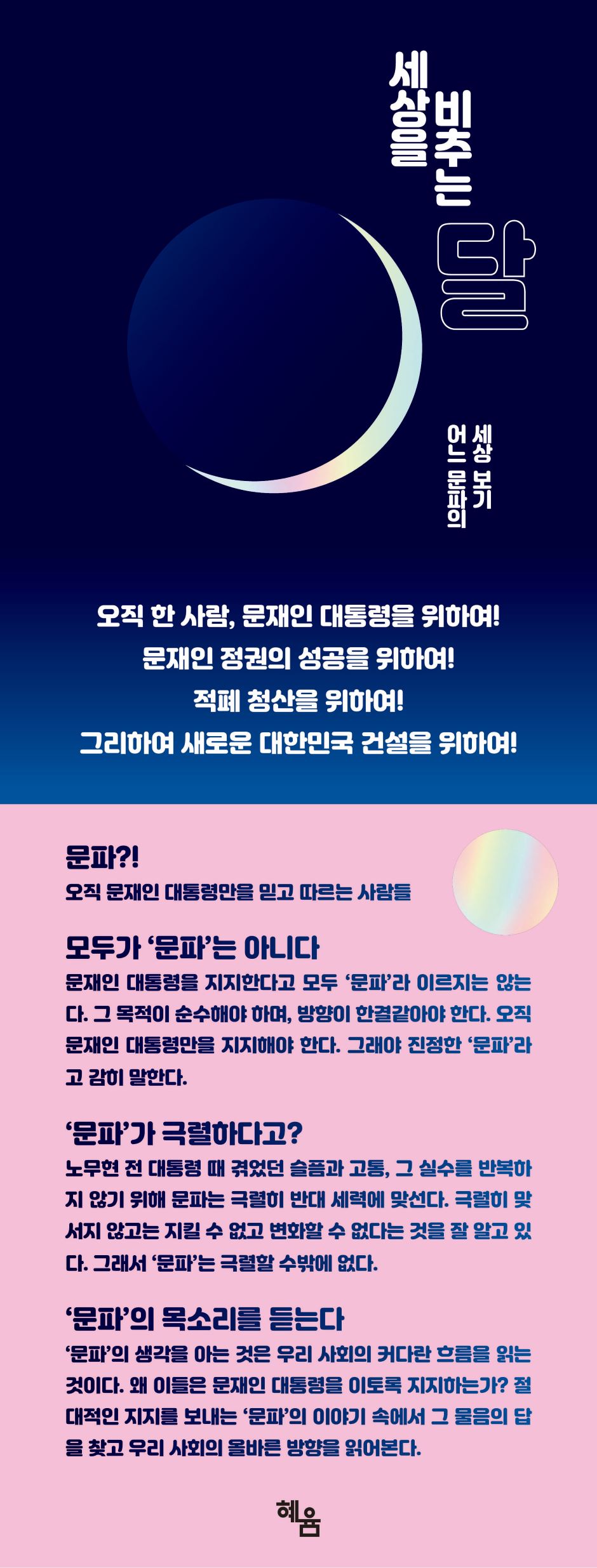 문재인 정부를 향한 총구가 사방에서 겨눠져 있다. 그리고 언제나 불을 뿜는다. 그 ‘총탄’을 몸으로라도 막아내고자 하는 사람들이 문재인 대통령 지지자, 즉 ‘문파’다. 오해와 공격을 받으면서도 오직 문재인 정부의 성공만을 위해 진흙 길 가는 것을 주저하지 않는 사람들이다. 내가 물론 문파의 대표는 아니지만, 이 책이 문파를 이해하는 데 조금이라도 도움이 된다면 더 바랄 게 없다. 물론 문재인 정부에도 애정과 지지를 보내주기를 바라는 마음 역시 간절하다. 굳건한 지지만이 문재인 정부의 성공, 나아가 대한민국의 업그레이드를 이끌 수 있다.