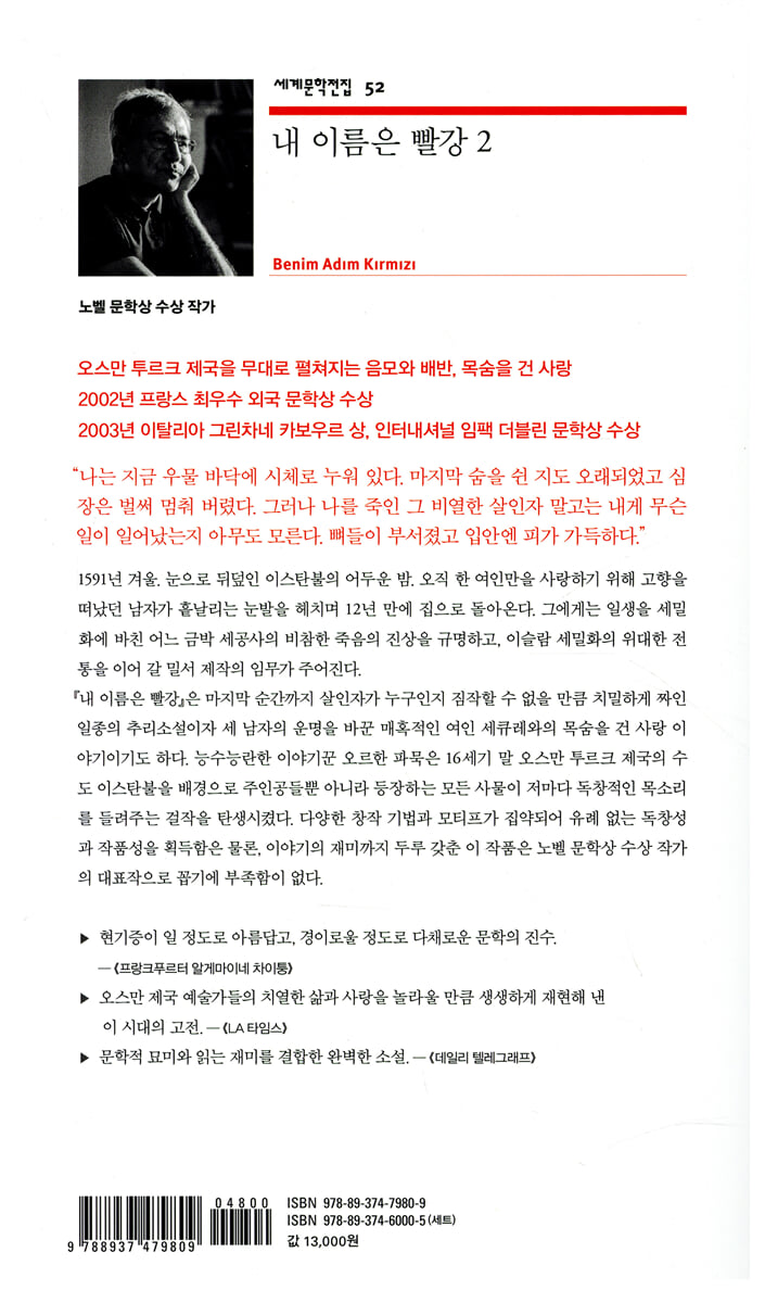 35. 저는 말입니다 36. 내 이름은 카라 37. 나는 여러분의 에니시테요 38. 내가 화원장 오스만이다 39. 저는 에스테르랍니다 40. 내 이름은 카라 41. 내가 화원장 오스만이다 42. 내 이름은 카라 43. 나를 올리브라 부른다 44. 나를 나비라 부른다 45. 나를 황새라 부른다 46. 나를 살인자라고 부를 것이다 47. 나는 악마다 48. 나는, 셰큐레 49. 내 이름은 카라 50. 우리는 두 명의 수도승 51. 내가 화원장 오스만이다 52. 내 이름은 카라 53. 저는 에스테르랍니다 54. 저는 여자예요 55. 나를 나비라 부른다 56. 나를 황새라 부른다 57. 나를 올리브라 부른다 58. 나를 살인자라고 부를 것이다 59. 나는, 셰큐레 작품 해설 작가 연보 |