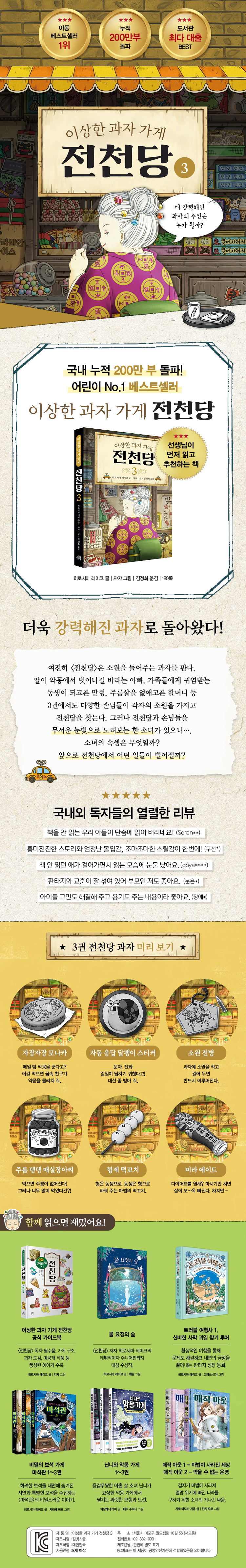 『이상한 과자 가게 전천당』 시리즈는 2019년 한국에서 첫 출간을 하자마자 종합 베스트셀러 순위에 진입하고, 어린이 판타지 분야에서는 1위를 할 정도로 독자들에게 사랑을 받고 있다. 이 시리즈는 학원물과 탐정물이 주를 이루는 국내 어린이 판타지 시장에 마법과 환상, 스릴러 요소가 가미된 색다른 내용으로 한순간 독자들의 마음을 사로잡았다. 복잡하지 않은 이야기 구조와 매력적인 캐릭터, 과자 가게의 아이템, 그것을 운용하는 사람들의 이야기가 흥미진진하며 신선하게 다가온다. 『이상한 과자 가게 전천당』에서 보여주는 인간의 욕심, 행복, 올바른 가치관을 추구하는 권선징악의 내용은 대중적이며 보편적인 주제라서 아이부터 어른까지 즐겁게 읽을 수 있다. ■ 새로운 인물의 등장으로 풍성해진 전천당 이야기 『이상한 과자 가게 전천당』 3권에서는 새로운 인물이 등장한다. 여덟 살 정도의 앳된 여자 아이. 그 소녀는 [화앙당]의 주인으로 전천당의 손님을 가로 채거나 전천당 손님과 화앙당 손님이 맞닥뜨리게 만들어 누구의 행운이 더 강한지 겨루게끔 한다. 평화로웠던 [전천당]에 의뭉스러운 이가 나타났음으로 인해 긴장감이 감돈다. 그 소녀는 누구이고, 왜 [전천당]과 주인 베니코 앞에 나타났을지 『이상한 과자 가게 전천당』 3권에서부터 새롭고 더욱 흥미진진한 이야기가 시작된다. ■ 쉽고 빠른 전개, 흡입력 넘치는 스토리, 권선징악의 교훈까지 『이상한 과자 가게 전천당』은 문장 호흡이 짧고 군더더기 없이 깔끔한 문체를 가졌다. 옴니버스 형식으로 구성되어 있고, 전개가 빠르며 흡입력이 강해 단숨에 읽어 내려간다. 몰입도가 높고 내용은 흥미진진하여 마치 애니메이션을 보는 듯한 착각을 불러일으킬 정도다. 이 책이 갖고 있는 이야기의 힘은 독서력이 부족한 아이들에게 징검다리 역할을 한다. 또한 웹소설 및 모바일에 익숙한 아이들도 한 번 읽기 시작하면 뒷내용이 궁금하여 멈추지 않을 정도로 재미있게 읽는다. 『이상한 과자 가게 전천당』은 재미와 흥미, 그 이상의 가치를 남긴다. 행운의 과자를 손에 넣었어도 자신이 어떻게 활용하느냐에 따라 그 결말은 상당히 달라진다. 내가 바라는 행운, 그리고 그 행운을 둘러싼 나의 선택과 행동들에 권선징악의 결말이 더해져 독자들에게 교훈과 생각할 거리를 건넨다. |