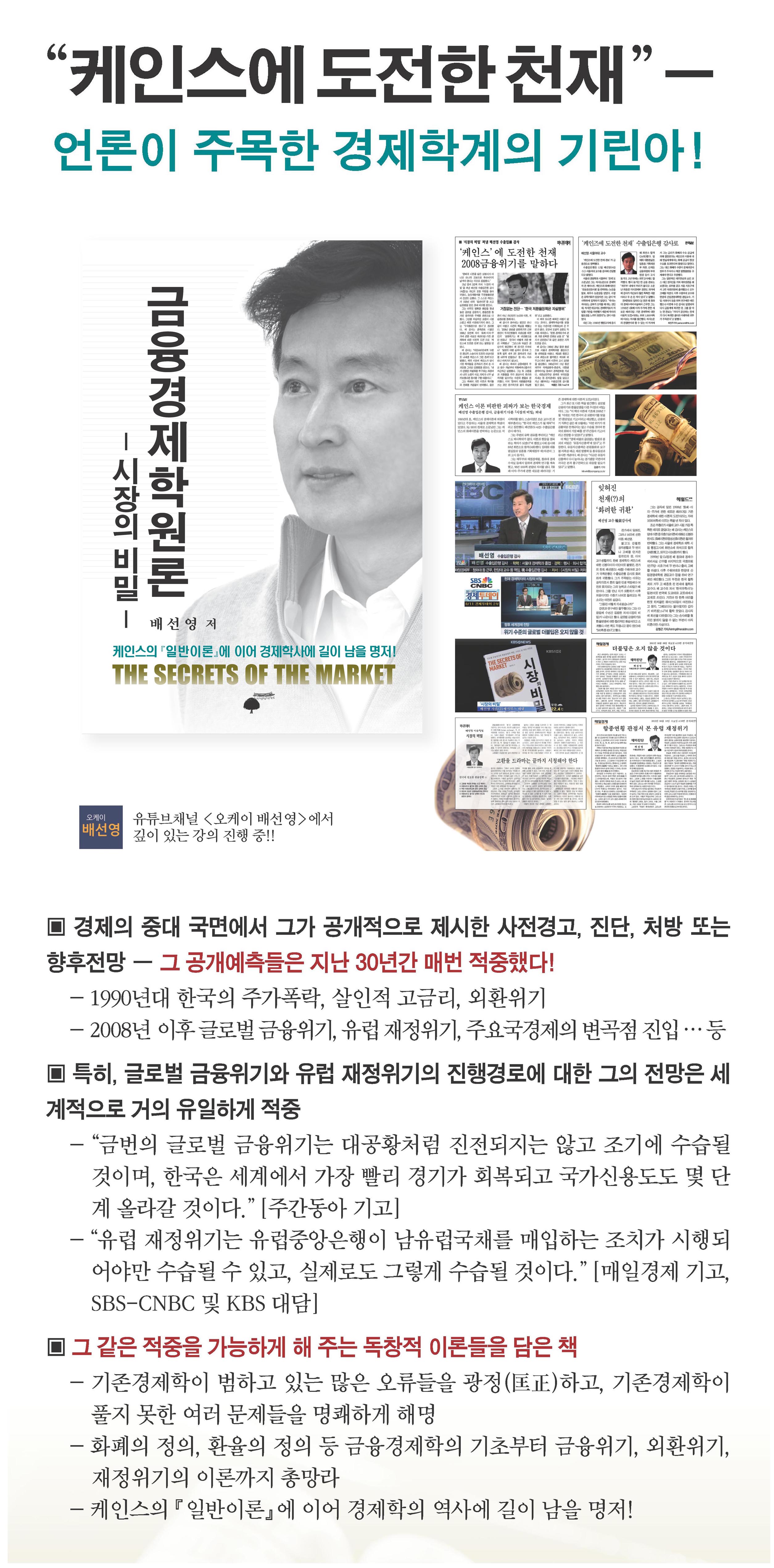 케인스를 위시한 기존경제학자들이 전개하는 상투적인 논리와는 전혀 다른 논리로, 금융 및 외환시장이 어떻게 운행되는지, 또 그 운행의 과정 및 결과가 실물경제부문에 어떤 영향을 미치고 그것이 다시 금융 및 외환시장으로 어떻게 피드백되는지를 명쾌하게 밝히고 있다. 통화량보다 중요한 유동자산총액의 크기, 그리고 이자율이나 환율과 같은 시장변수들의 수준 등이 어떤 원리에 의해 결정되는지, 더 나아가 2008 글로벌 금융위기와 같은 금융위기, 2011 유럽 재정위기와 같은 재정위기, 1997 한국 외환위기와 같은 외환위기 등이 어떤 메커니즘으로 결정되는지 하는 것들을 치밀하게 해설하고 있다. 화폐의 정의나 환율의 정의부터 기존의 이론서에서와는 다르다. 예를 들어, 기존의 이론서에서는 “환율(exchange rate)의 ‘환’(換; excange)은 ‘교환’을 의미하고, ‘율’(率; rate)은 ‘비율’을 의미한다. 그래서, 환율은 글자 그대로 두 나라 통화 간의 ‘교환비율’을 의미한다.”라고 설명한다. 반면에, 저자는 “환율에 관한 기존경제학에서의 정의는 잘못된 것이다! 한국어에서든 영어에서든, ‘환’의 사전상의 의미는 ‘교환’이 아니라 또 다른 뜻인 ‘외국 돈’(外換; foreign money 또는 foreign exchange)이고, ‘율’의 사전상의 의미도 ‘비율’이 아니라 또 다른 뜻인 ‘단가(單價; unit price)다. 그래서, 환율의 정확한 의미는 ‘외국돈 한 단위의 가격’이다. 즉, 이를테면 미국 돈 한 단위인 1달러의 가격(달럿값)이 곧 환율인 것이다!”라고 설명한다. 참으로 의표를 찌르는 설명이다. 2011년 『시장의 비밀』로 처음 세상에 나와 매스컴의 주목을 받으며 독자들 사이에 센세이션을 불러일으켰고, 이후 8년간의 증보 과정을 거쳐 완전히 새로워진 판본 『금융경제학원론; 시장의 비밀』로 다시 세상에 나오게 되었다. 이 새로운 판본에서는 2011년부터 2019년 10월 현재까지의 기간에 이슈화된 사안들에 관한 분석이나 평가도 포함되어 있는데, 미국 유로존 중국 일본 등 주요국 경제의 변곡점 진입에 관한 분석이 포함되어 있고, 특히, 한국의 박근혜 정부 및 문재인 정부 각각의 경제 정책에 관한 분석과 평가가 기술되어 있다. 문재인 정부의 경제 정책에 관해서는 소득주도성장론의 대오류와 확장적 재정정책의 위험성을 기존경제학자들과는 다른 시각에서 종합적이고 체계적으로 깊이 있게 지적하고 있는 것이 눈길을 끈다. 저자는 심오한 경제학 이론들을 기술하면서 동서고금의 명언과 전략적 예화들을 적절히 인용함으로써 자칫 어렵고 딱딱할 수 있는 내용을 일반인들도 쉽고 흥미롭게 이해할 수 있도록 하고 있는데, 그의 박학다식한 언술과 문체는 기존 경제학이론서에서는 접할 수 없는 것으로서 가히 “경제학의 문사철”이라는 평가를 받기에 손색이 없는 정도다. 독자들은 저자의 해박한 지식과 명쾌한 분석, 전망을 따라가면서 실물경제와 금융시장을 보다 면밀하고 정확하게 전망할 수 있는 새로운 시각을 터득할 수 있을 것이다. “케인스에 도전한 천재”, 언론이 주목한 경제학계의 기린아! 지난 30년간 국내외 경제의 중대 국면에서 저자가 공개적으로 제시한 사전경고, 진단, 처방과 전망… 그 공개예측들은 매번 적중했다! 1990년대 한국의 주가 폭락, 살인적 고금리, 외환위기가 그랬고, 2008년 이후 글로벌 금융위기, 유럽 재정위기, 주요국경제의 변곡점 진입에 관한 예측과 전망 또한 그러했다. 그의 주장은 세계 각국의 내로라하는 경제학자들의 의견과 배치하거나 그들의 이론과 식견을 뛰어넘는 것이었고, 그래서 모두 반신반의했지만 한 번도 틀린 적이 없었다. 특히, 글로벌 금융위기와 유럽 재정위기의 진행경로에 대한 그의 전망은 세계적으로 거의 유일하게 적중했다. 전 세계 유수의 경제학자들이 ‘대공황’을 예견할 때 그는 “금번의 글로벌 금융위기는 대공황처럼 진전되지는 않고 조기에 수습될 것이며, 한국은 세계에서 가장 빨리 경기가 회복되고 국가신용도도 몇 단계 올라갈 것이다.”라고 단언했다[주간동아 기고]. 또, “유럽 재정위기는 유럽중앙은행이 남유럽 국채를 매입하는 조치가 시행되어야만 수습될 수 있고, 실제로도 그렇게 수습될 것이다.”라고 진단했고[매일경제 기고, SBS-CNBC 및 KBS 대담], 그러한 진단과 처방은 국제정치경제 무대에서 그대로 실현이 되었다. 이 책은 그 같은 적중을 가능하게 해 주는 독창적 이론들을 담고 있으며, 기존 경제학이 범하고 있는 많은 오류를 광정(匡正)하고, 기존 경제학이 풀지 못한 여러 문제를 명쾌하게 해명하는 한편 화폐의 정의, 환율의 정의 등 금융경제학의 기초부터 금융위기, 외환위기, 재정위기의 이론까지 총망라함으로써 케인스의 『일반이론』에 이어 경제학사에 길이 남을 명저로 자리매김하고 있다. 기존경제학자들이 회피하고 싶어 하는 질문들에 관한 명쾌한 답변서! 또한, 이 책에서는 금융위기에 관해 기존의 경제학자들이 대답하길 꺼리는 질문들까지 다룬다. 이는, 정확한 경제 전망을 위해서라면 반드시 제기되어야 할 날카로운 질문들인데, 그 논제들은 다음과 같다. ▶ 2008년 9월 리먼브러더스의 파산과 함께 