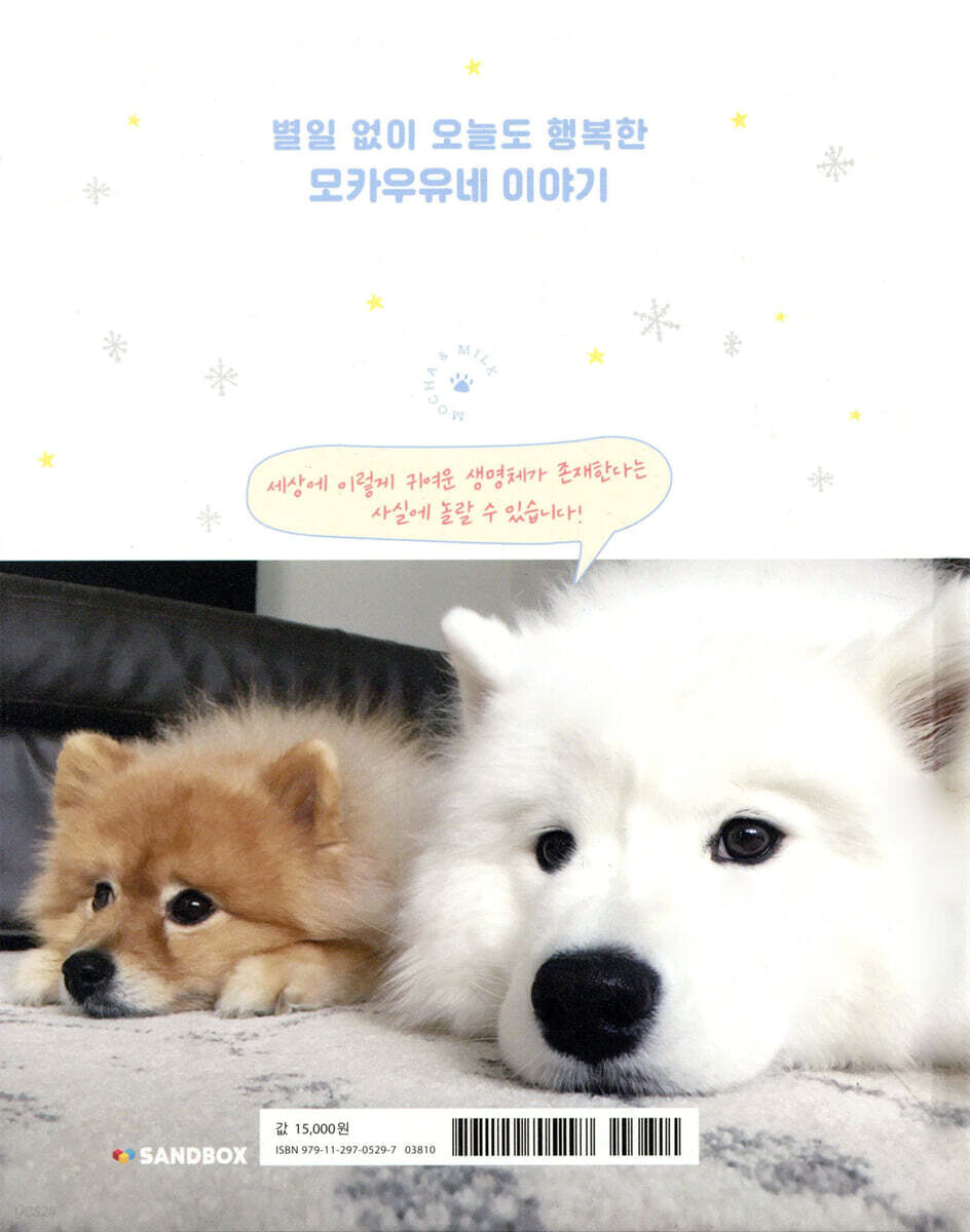 모카를 소개합니다 우유를 소개합니다 1. 우리가 처음 만난 순간 작은 곰 모카와의 만남 모두의 사랑은 모카의 것! 이웃 생각도 좀 해주자 모카우유 교육관 모카, 우유를 만나다! 서로 다른 모카우유가 어울리는 방법 흰둥이의 탄생 우유의 질병 간식은 셀프! 누렁니를 탈출하자 2. 매일매일 빛나는 모카우유의 하루 나름 바쁜 하루일과 댕댕이 대가족을 소개합니다 사람처럼 행동하는 모카 모카는 8살 소통의 달견, 모카우유 아플 때만 “아빠!” 모카, 제2의 부(Boo)가 될 수 있을까? 우리가 셀프 미용을 하게 된 이유 사모예드 우유의 털 관리 비법 물이랑 안 친한 우유 3. 우리집은 캐나다예요 강아지는 가족이에요 복종 훈련을 시키지 않는 이유 까칠한 갈색 강아지들의 공격 극과 극, 강아지공원 인싸견과 아싸견 강아지용품점 나들이는 언제나 즐거워! 나는 시베리아 출신이개 모카야, 우유야, 캠핑가자! Trick or treat! 할로윈 파티 4. 함께 가족으로 살아간다는 것은 우리 엄마가 달라졌어요! 매일 우유의 흔적과 치르는 전쟁 모카와 시온의 돌이킬 수 없는 관계 나 홀로 집에 우유는 천사야! 막냇동생이 생겼어요 동생 껌딱지 우유와 츤데레 모카 모카에게 우유에게 Q&A 모카와 우유에 대한 모든 것! |