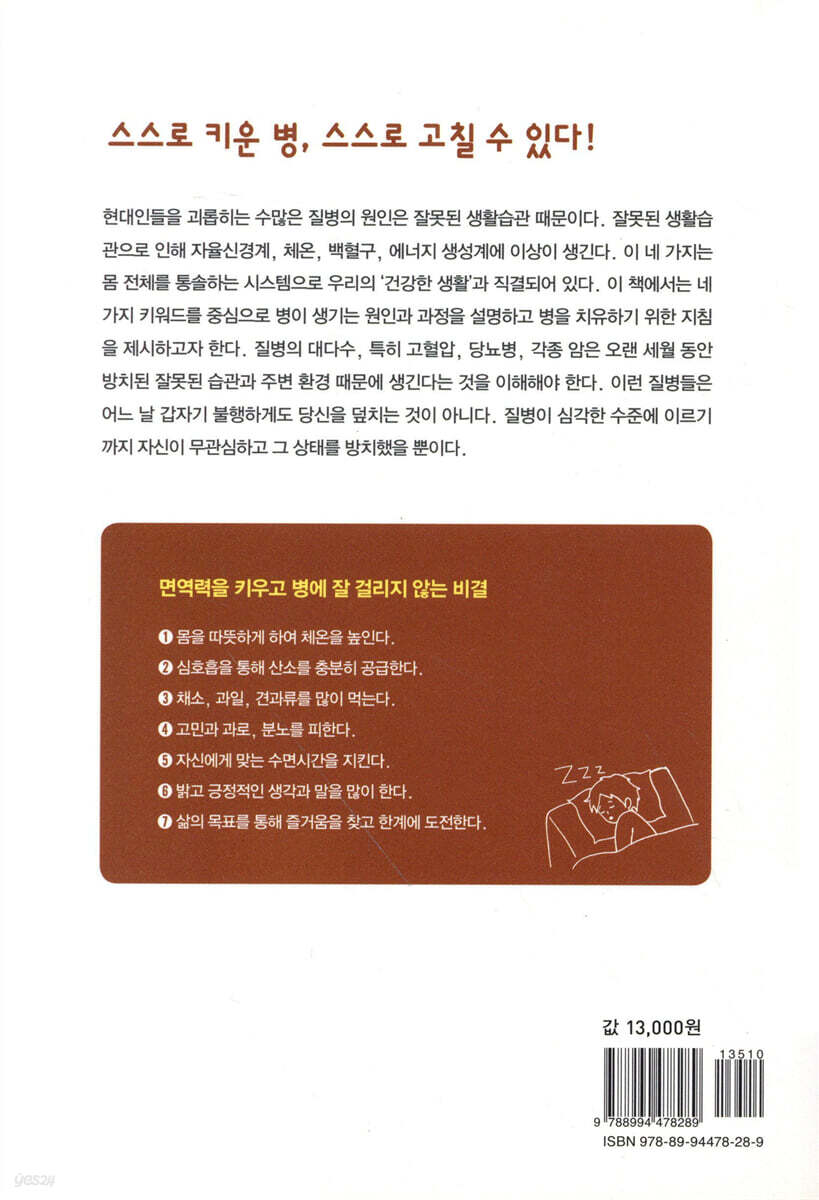 왜 100살까지 장수하기 힘들까? 생활습관을 보면 병이 보인다 미니스커트를 자주 입으면 자궁경부암에 걸린다? 면역력이 약해지면 병에 걸린다 의사의 처방대로 약을 먹는 것이 최선일까? 고혈압이라고 해서 무조건 겁먹지 말자 혈압에 따라 적정 수면시간이 달라진다 억지로 혈압을 낮추면 부작용이 생길 수 있다 엄격한 정상치 설정이 환자를 늘린다 노인들이 병원에 열심히 다니는 이유 수치의 불편한 진실 : 무조건 염분 섭취를 줄여야 할까? 콜레스테롤 정상치에 대한 견해 보건 교사들의 딜레마 교감신경과 부교감신경에 대한 이해 활기로 넘치는 사람을 환자로 낙인찍다 얼굴색과 대변 상태는 건강의 척도다 통째로 먹기 : 정제된 백미보다 거친 현미가 낫다 2장. 자율신경계가 건강의 핵심이다 감기는 몸이 보내는 메시지 자신의 한계를 넘어서기 전에 멈춰야 한다 인간에게 병은 피할 수 없는 운명일까? 교감신경의 긴장에 주의하라 체온이 낮아지면 면역력도 떨어진다 죽음을 부르는 3종 세트 : 고민, 과로, 분노 약은 몸을 해치는 독(毒)이다 과식과 게으름의 함정 : 지나친 부교감신경 우위도 문제다 해법1 : 몸을 단련하여 스트레스를 이겨낼 힘을 키운다 해법2: 곡물을 섭취하면 정서가 안정된다 해법3: 낮과 밤이 다른 생활로 균형을 유지하다 적당하게 먹고 적당한 체중을 유지하자 적당히 뚱뚱한 것이 몸에 좋은 사람도 있다 3장. 내 안의 치유력을 믿어라 암은 어떤 사람들이 걸릴까? 병에 걸리면 지나친 영양 섭취를 피하라 건강을 지키는 삼총사 : 과립구, 림프구, 대식세포 궤양은 혈류와 과립구의 관계에 의해 일어난다 너무 억척스러우면 병에 걸린다 통증, 발열, 설사는 회복반응이다 붓고 아프면서 회복된다 암에 걸려도 초조해하지 마라 알레르기는 약으로는 억지로 고칠 수 없다 진통제가 오히려 병을 악화시킬 수 있다 현대 의학으로는 병을 고칠 수 없는가? 자궁경부암은 면역력 저하 때문이다 현대의학이 만들어낸 백신을 맹신하지 마라 생활 속의 지혜1: 몸을 따뜻하게 해 병을 치유한다 생활 속의 지혜2: 복근을 단련하고 빨리 걷는다 생활 속의 지혜3: 자세를 바꿔 냉증을 떨쳐낸다 삶의 목표를 통해 한계를 뛰어넘다 4장. 인체 구조를 알면 100세까지 장수한다 생로병사의 비밀은 여기에 있다 해당계 : 위기를 극복하기 위한 순발력 시스템 미토콘드리아계 : 무병장수를 위한 지구력 시스템 미토콘드리아계가 극도로 활성화되면? 노인은 많이 먹지 않아도 지구력이 있다 여자는 따뜻한 곳에 살아야 장수한다? 암세포는 저체온 · 저산소 상태에서 생긴다 UV 차단? 자외선을 너무 미워하지 말자 인간은 방사선을 에너지로 활용한다 암과 만성질환을 예방하는 3가지 원칙 수면시간과 질이 건강을 결정한다 우울증은 과연 나쁘기만 할까? 치유력을 높이기 위해 열을 내자! 암이 생기는 생활을 멀리하자! 해마다 수십만 명이 암으로 죽는 현실에 무덤덤해지다 밝고 긍정적인 말을 사용하라 120세를 목표로 한 나의 생활습관 매일 무엇을 먹으면 좋을까? 매일 원시인 체조를 3세트씩 10회 반복한다 손톱 지압과 자세 교정 |