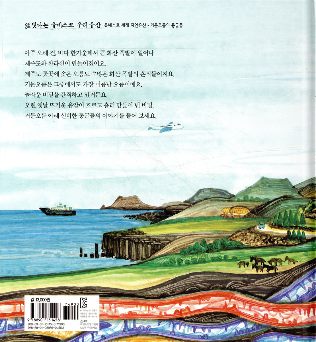 전봇대를 세우려고 땅을 파던 사람들이 깜짝 놀랍니다. 흙덩이와 자갈이 저 아래로 후드득 떨어지더니 땅 밑으로 어두컴컴한 구멍이 나타났거든요. 이 책의 이야기는 이렇게 땅 위에서 땅 밑으로 들어가며 시작됩니다. ‘네가 발 딛고 서 있는 땅, 그 아래에 비밀이 숨겨져 있었단다.’ 하고 호기심을 자극하며 아이들을 낯선 공간으로 초대하는 것이지요. 쏙 빨려들듯 들어간 동굴 속, 첫 느낌은 어떨까요? 어둡고, 축축하고, 서늘합니다. 컴컴한 저 앞에서 뭔가가 튀어나올 것 같아 무섭기도 하고요. 하지만 그건 동굴이라는 신비한 세계의 아주 작은 일부일 뿐입니다. 이 책은 오랜 시간에 걸쳐 이루어진 동굴의 진짜 이야기를 눈앞에 펼쳐 보여줍니다. 먼 옛날 동굴이 처음 시작되던 그 까마득한 순간으로 시간 여행을 떠나는 거지요. 시간 여행의 시작은 바다 한가운데서 화산 폭발이 일어나 제주도가 생기고, 다시 폭발이 일어나 한라산이, 그리고 수많은 오름들이 만들어지던 때입니다. 책을 보는 아이들은 그 뜨겁고 강렬한 화산 폭발의 순간부터 목격합니다. 그리고 한 장 한 장 책장을 넘길 때마다 거문오름의 용암동굴들이 생성되어 가는 과정을 마주합니다. 화산은 힘찬 폭발을 거듭하고, 뜨거운 용암은 흐르고 또 흐릅니다. 용암이 식어 동굴이 만들어졌나 했더니, 또 다른 폭발과 용암으로 동굴은 끊어지기도 하고 또 다른 동굴로 이어지기도 하면서 땅 속에서 층층이 미로처럼 복잡해집니다. 지금 우리가 보는 동굴은 그렇게 긴 시간 속에서 이루어진 것이지요. 이 시간 여행을 통해 아이들은 용암동굴이 어떻게 형성되고, 왜 그런 모습을 갖게 되었는지 하나씩 선명하게 이해할 수 있습니다. 그 비밀을 알게 된 아이들에게 거문오름의 동굴은 이제 그저 땅 밑의 낯설고 텅 빈 공간이 아닐 것입니다. 오랜 옛날 뜨거운 용암이 흐르던 자리, 용암이 남긴 다양한 흔적들에서 아이들은 신비롭고 놀라운 이야기를 스스로 발견하고 상상할지도 모릅니다. 아름답고, 또 아름다운 세계 - 자연이 빚어 낸 작품을 만나는 감동 동굴이 만들어진 과정을 힘 있게 보여준 책은 거문오름의 동굴들도 하나하나 소개합니다. 세계 자연유산으로 선정된 벵뒤굴, 만장굴, 용천동굴, 당처물동굴의 특징과 이름난 동굴 생성물, 신비한 모습이 어떻게 만들어 졌는지도 함께 살펴봅니다. 층이 나누어진 통로가 미로처럼 얽힌 동굴, 거대한 돌기둥과 엄청난 규모를 자랑하는 동굴, 옛날에 사람이 살았던 흔적이 남아 있는 동굴, 맑고 아름다운 호수를 품고 있는 동굴, 온통 금빛으로 반짝이는 동굴 등 거문오름의 동굴들은 저마다 독특한 아름다움을 자랑합니다. 그 신비한 아름다움은 과학적인 정보와 지식으로는 미처 설명할 수 없는 감동과 경외심마저 느끼게 합니다. 거문오름의 동굴들은 거대한 자연의 힘과 오랜 시간이 만들어 낸 멋진 작품인 것이지요. 땅 밑에 비밀처럼 감춰져 있던 자연의 위대한 작품을 만나는 감동도 이 책의 또 다른 재미입니다. 자연의 힘과 아름다움을 강렬하게 표현한 그림 이 책의 그림은 보통의 지식 정보 그림책에서 만날 수 있는 그림과 많이 다릅니다. 어찌 보면 다소 파격적일 수도 있는 색과 구성입니다. 하지만 그 과감함은 책에 흠뻑 빠져들게 하는 시각적인 만족감을 주며, 거문오름의 동굴들을 보는 이의 마음에 뚜렷하게 각인시킵니다. 이 책에서 동굴은 기나긴 시간을 품고 있는 지루하고 어두운 공간, 멈춰 있고 퇴색한 공간이 아닙니다. 여전히 살아 숨 쉬며 시시각각 다른 빛을 발하는 생동감 넘치는 공간입니다. 그림은 거대한 에너지가 한꺼번에 터져 나오는 화산 폭발, 힘차게 꿈틀거리며 흐르는 용암, 기묘하게 모양을 갖춰 나가는 동굴을 화려하고 강렬한 색, 입체적이며 역동적인 화면으로 보여줍니다. 미묘한 색의 변화와 깊이 있는 구조로 표현한 각 동굴들의 내부는 그 아름다움과 신비함을 그대로 살려냈습니다. 과학적인 정보나 변화 과정에 대한 설명이 필요한 부분은 오히려 단순하게 그렸습니다. 작은 컷으로 구성한 그 그림들은 보는 이가 원리를 쉽게 이해하도록 돕습니다. 거문오름의 동굴들, 그 속에 응축되어 있는 자연의 힘과 아름다움을 강렬하게 표현한 이 책의 그림은 오래도록 독자의 기억에 남을 것입니다. [빛나는 유네스코 우리 유산] 시리즈 ‘빛나는 유네스코 우리 유산’은 전 세계가 함께 보호하고 전수해야 할 유산으로 유네스코가 지정한 우리나라의 세계 문화유산, 세계 자연유산과 세계 기록유산, 세계 무형문화유산을 소개하는 그림책 시리즈입니다. 이 시리즈는 아이들에게 우리 문화유산의 과학성, 예술성, 역사성과 그 안에 담긴 사람들의 모습을 전달하고자 합니다. 특히 그 유산이 갖는 과거의 의미뿐만 아니라 현재의 의미까지 표현하려고 노력하였습니다. 지금까지 출간된 책으로 『임금님의 집 창덕궁』, 『아버지가 남긴 돌 고인돌』, 『신과 인간이 만나는 곳 종묘』, 『돌로 지은 절 석굴암 』, 『천 년의 도시 경주』, 『신라 사람들의 꿈 불국사』 『곰뱅이 텄다! 남사당 놀이』 『제주섬의 어머니산 한라산』이 있습니다. 특히 『돌로 지은 절 석굴암