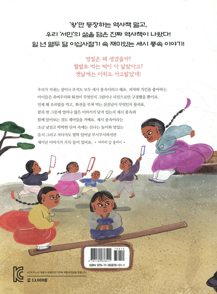 일 년 내내 잔치만 하던 사람들 … 012 해의 날과 달의 날 … 014 집 안에 귀신이 득시글득시글 … 018 느티떡과 골무떡은 언제 먹나요? … 023 제2장_일 년 열두 달, 이십사절기 속 재미있는 세시 풍속 음력 1월의 세시 풍속과 절기… 030 까치 까치 설날은 어저께고요, 우리 우리 설날은 사라졌어요? 030 | 더위도 팔았던 정월 대보름 037 | 귀신 날이 왔다. 집에서 꼼짝 마! 042 | 학교 보내 주고 장가보내 주던 소의 날 046 | 봄이 드는 입춘과 강물이 녹는 우수 049 음력 2월의 세시 풍속과 절기… 051 머슴 송편 먹고 돌덩이를 들면 세경이 올라간다 051 | 영등 할머니, 딸 말고 며느리를 데리고 오세요 055 | 용알 주워 먹던 경칩과 나이 떡 먹는 춘분 057 음력 3월의 세시 풍속과 절기… 061 노랑나비 따라 꽃놀이도 흐드러진 삼짇날 061 | 불을 피우지 않고 찬밥 먹는 날, 한식 064 | 나의 나무 심는 청명과 볍씨 틔우는 곡우 065 음력 4월의 세시 풍속과 절기… 069 어린이날처럼 즐거웠던 사월 초파일 069 | 모내기를 시작하는 입하와 이팝나무 꽃을 보며 배곯는 소만 073 음력 5월의 세시 풍속과 절기… 078 단오 그넷줄에 물이 흘러야 풍년이 든다 078 | 자신의 몸을 태워 비를 불러온 임금님 082 | 손톱에 붉은 물을 들이면 귀신이 달아나요 084 | 햇보리를 먹는 망종과 비를 기다리는 하지 085 음력 6월의 세시 풍속과 절기… 088 옛날 사람들의 여름휴가, 유두잔치 088 | 삼복더위에 목욕하면 살이 빠진다? 092 | 귀족에게는, 사치요 백성에게는 아픔이던 얼음 093 | 찜통더위 소서와 염소 뿔도 녹이는 대서 097 음력 7월의 세시 풍속과 절기… 100 바느질 솜씨를 직녀에게 비는 칠석날 100 | 호미 씻고 소 타는 백중 104 | 기청제를 올리는 입추와 모기 입이 삐뚤어지는 처서 106 음력 8월의 세시 풍속과 절기… 109 더도 말고 덜도 말고 한가위만 같아라 109 | 포도 따는 백로와 목화 따는 추분 117 음력 9월의 세시 풍속과 절기… 120 양반은 시 읊고 농부는 벼 타작하는 중양절 120 | 찬 이슬이 내리는 한로와 서리가 내리는 상강 122 음력 10월의 세시 풍속과 절기… 126 하늘과 조상, 신들에게 감사하는 상달 126 | 김장 방학이라고 들어는 봤니? 127 | 보리 심는 입동과 월동 준비에 바쁜 소설 131 음력 11월의 세시 풍속과 절기… 135 옛날의 작은 설, 동지 135 | 보리 싹이 눈 이불을 덮는 대설과 버선 짓는 동지 140 음력 12월의 세시 풍속과 절기… 142 섣달그믐날 나타나는 신발 도둑, 야광귀 142 | 참새 잡고 엿 만들기 딱 좋은 날, 납일 146 | 잠들면 눈썹이 허옇게 되는 공포의 날 147 | 대한이는 왜 소한이네 집에 놀러갔을까? 150 제3장_세시 풍속 놀이 재미있는 전래 놀이… 154 연날리기 154 | 널뛰기 156 | 윷놀이 159 | 쥐불놀이 162 | 줄다리기 163 | 강강술래 166 | 놋다리밟기 167 |