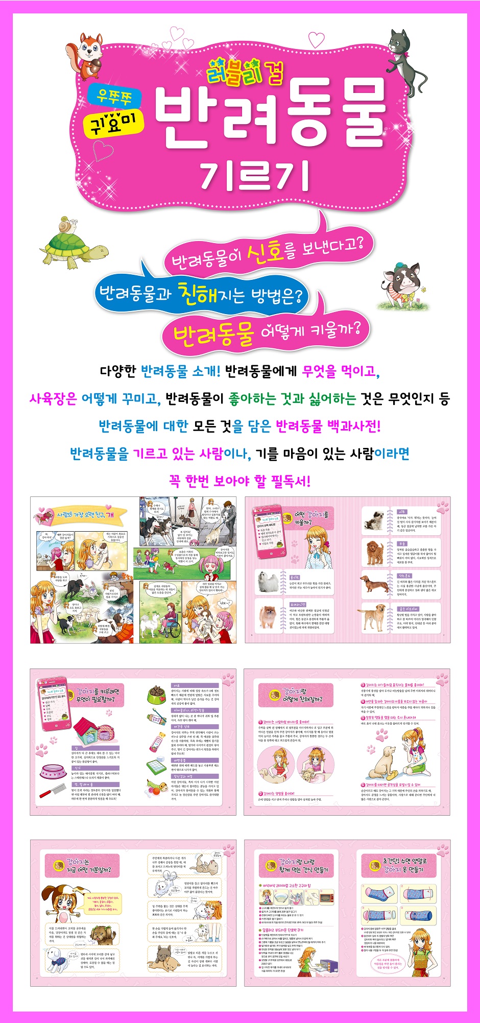 소중한 반려동물, 정다운 내 친구들! 12 사람의 가장 오랜 친구, 개 14 · 어떤 강아지를 키울까? 16 · 강아지를 키우려면 무엇이 필요할까? 18 · 강아지랑 어떻게 친해질까? 20 · 강아지는 지금 어떤 기분일까? 22 · 강아지랑 나랑 함께 먹는 간식 만들기 24 · 초간단! 수면양말로 강아지 옷 만들기 25 꼬리는 살랑살랑~ 발은 사뿐사뿐, 고양이 26 · 어떤 고양이를 키울까? 28 · 고양이를 키우려면 무엇이 필요할까? 30~31 · 고양이랑 어떻게 친해질까? 32 · 고양이는 지금 어떤 기분일까? 34 · 고양이 간식 만들기 36 · 요리조리 공놀이 장난감 만들기 37 쳇바퀴를 빙글빙글~ 햄스터 38 · 어떤 햄스터를 키울까? 40 · 햄스터 집 예쁘게 꾸미기 42 · 초롱초롱 햄스터 건강하게 키우기 44 · 햄스터랑 어떻게 친해질까? 45 · 햄스터는 지금 어떤 기분일까? 46 · 햄스터 장난감과 간식 만들기 48 두 귀가 쫑긋쫑긋, 토끼 50 · 어떤 토끼를 키울까? 52 · 토끼를 키우려면 무엇이 필요할까? 54 · 토끼는 지금 어떤 기분일까? 56 · 토끼랑 어떻게 친해질까? 58 · 오물오물~ 토끼는 뭘 먹을까? 60 가시가 삐죽삐죽, 고슴도치 62 · 어떤 고슴도치를 키울까? 64 · 고슴도치 집 예쁘게 꾸미기 66 · 따끔따끔 고슴도치 건강하게 키우기68 · 촵촵촵촵~ 고슴도치는 뭘 먹을까? 69 · 고슴도치는 지금 어떤 기분일까? 70 · 반짝반짝~ 고슴도치 목욕시키기 71 두 볼에 도토리가 쏘옥, 다람쥐 72 · 줄무늬 다람쥐와 친구들 74 · 다람쥐 집 예쁘게 꾸미기 76 · 쪼르르~ 쪼르르~ 다람쥐 건강하게 키우기 78 · 다랑쥐랑 어떻게 친해질까? 79 · 다람쥐의 겨울나기 80 · 다람쥐는 뭘 먹을까? 81 주인을 잘 따르는 애교쟁이, 미니 돼지 82 · 어떤 미니 돼지를 키울까? 84 · 미니 돼지를 키우려면 무엇이 필요할까? 85 · 꿀꿀~ 미니 돼지 건강하게 키우기 86 · 미니 돼지랑 어떻게 친해질까? 87 · 미니 돼지 관찰 일기 88 내 말을 따라해, 앵무새 90 · 어떤 앵무새를 키울까? 92 · 앵무새 집 예쁘게 꾸미기 94 · 앵무새랑 어떻게 친해질까? 95 · 앵무새 건강하게 키우기 96 · 앵무새야, 내 말 따라해 봐! 97 · 앵무새 장난감 만들기 98 노란 솜털 삐악삐악, 병아리 100 · 어떤 종류의 닭이 있어요? 102 · 병아리 집 예쁘게 꾸미기 104 · 뽀송뽀송 병아리 건강하게 키우기 106 · 콕콕콕~ 병아리는 뭘 먹을까? 107 · 병아리 관찰 일기 108 엉금엉금 느릿느릿, 거북 110 · 어떤 거북을 키울까? 112 · 거북 집 예쁘게 꾸미기 114 · 우적우적~ 거북은 뭘 먹을까? 116 · 거북 관찰 일기 117 긴 꼬리를 휘이익~, 그린 이구아나 118 · 그린이구아나와 친구들 120 · 그린이구아나 집 예쁘게 꾸미기 122 · 그린이구아나는 뭘 먹을까? 124 · 그린이구아나 관찰 일기 125 레오파드 게코 도마뱀 126 · 레오파드게코도마뱀의 종류는 다양해! 128 · 레오파드게코도마뱀의 집 예쁘게 꾸미기 130 · 레오파드게코도마뱀 건강하게 기르기 132 · 레오파드게코도마뱀 관찰 일기 133 입은 뻐끔뻐끔 눈은 꿈뻑꿈뻑, 금붕어 134 · 어떤 금붕어를 키울까? 136 · 금붕어 어항 예쁘게 꾸미기 138 · 빵긋빵긋~ 금붕어 건강하게 키우기 140 · 금붕어 관찰 일기 141 알록달록~ 물속 요정, 구피 142 · 어떤 구피를 키울까? 144 · 구피 어항 예쁘게 꾸미기 146 · 구피의 산란 147 · 씽씽쌩쌩~ 구피 건강하게 키우기 148 · 구피 관찰 일기 149 긴 뿔이 울끈불끈, 장수풍뎅이 150 · 어떤 장수풍뎅이를 키울까? 152 · 장수풍뎅이 집 예쁘게 꾸미기 154 · 으쌰으쌰~ 장수풍뎅이 건강하게 키우기 156 · 장수풍뎅이 관찰 일기 157 고둥 껍데기를 으랏차차, 소라게 158 · 어떤 소라게를 키울까? 160 · 소라게 집 예쁘게 꾸미기 162 · 올망졸망~ 소라게 건강하게 키우기 164 · 소라게 관찰 일기 165 껍데기는 둥글둥글 몸은 꼬물꼬물, 달팽이 166 · 어떤 달팽이를 키울까? 168 · 달팽이는 뭘 먹을까? 169 · 달팽이 집 예쁘게 꾸미기 170 · 영차영차~ 달팽이 건강하게 키우기 172 · 달팽이 관찰 일기 173 이런 반려동물도 있어! 174 |