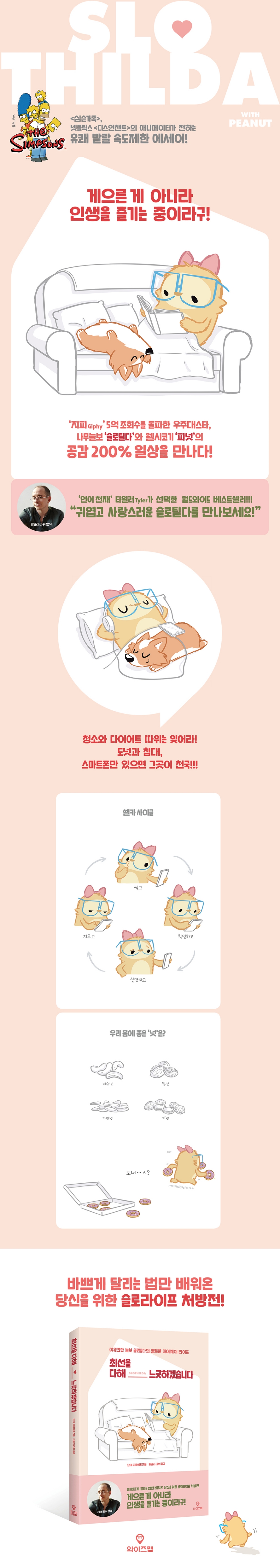 미국의 대표 애니메이션 [심슨가족The Simpsons]으로 에미상을 수상한 경력이 있는 애니메이터인 저자 단테 파비에로. 현재는 넷플릭스Netflix 오리지널 시리즈 [디스인챈트Disenchantment]에서 스토리보드 아티스트로 활동하고 있다. 그는 여유 있고 유쾌한, 누구나 쉽게 공감할 수 있는 느긋한 일상의 즐거움을 공유하기 위해 슬로틸다라는 귀여운 캐릭터를 탄생시켰다. 슬로틸다의 반려견 피넛은 실제 저자의 반려견이기도 하다. 이 책의 번역 작업은 언어 천재라고 불리는 방송인 타일러가 함께 했다. 슬로라이프와 동물을 좋아하는 그는 슬로틸다를 보자마자 한 눈에 반해 흔쾌히 프로젝트에 참여하게 됐다. 그는 센스 넘치는 감각으로 느긋하게 인생을 즐기는 슬로틸다의 이야기를 재밌게 풀어냈다. 오늘의 느긋함을 내일로 미루지 말아요! 바쁘게 사는 것이 미덕으로 여겨지는 시대에 ‘여유’와 ‘느긋함’은 어울리지 않는 단어처럼 느껴질지도 모른다. 하지만 아무것도 하지 않는 주말의 한적함이, 바쁜 일과 중 갖는 차 한 잔의 여유가 가장 행복하듯 한 박자 쉬어가는 시간은 우리 삶에 활력을 불어 넣어준다. 빠르게 달리는 것에 익숙해진 사람들에게 느리게 사는 즐거움을 전하기 위해 슬로틸다는 오늘도 최선을 다해 느긋하게 살고 있다. |