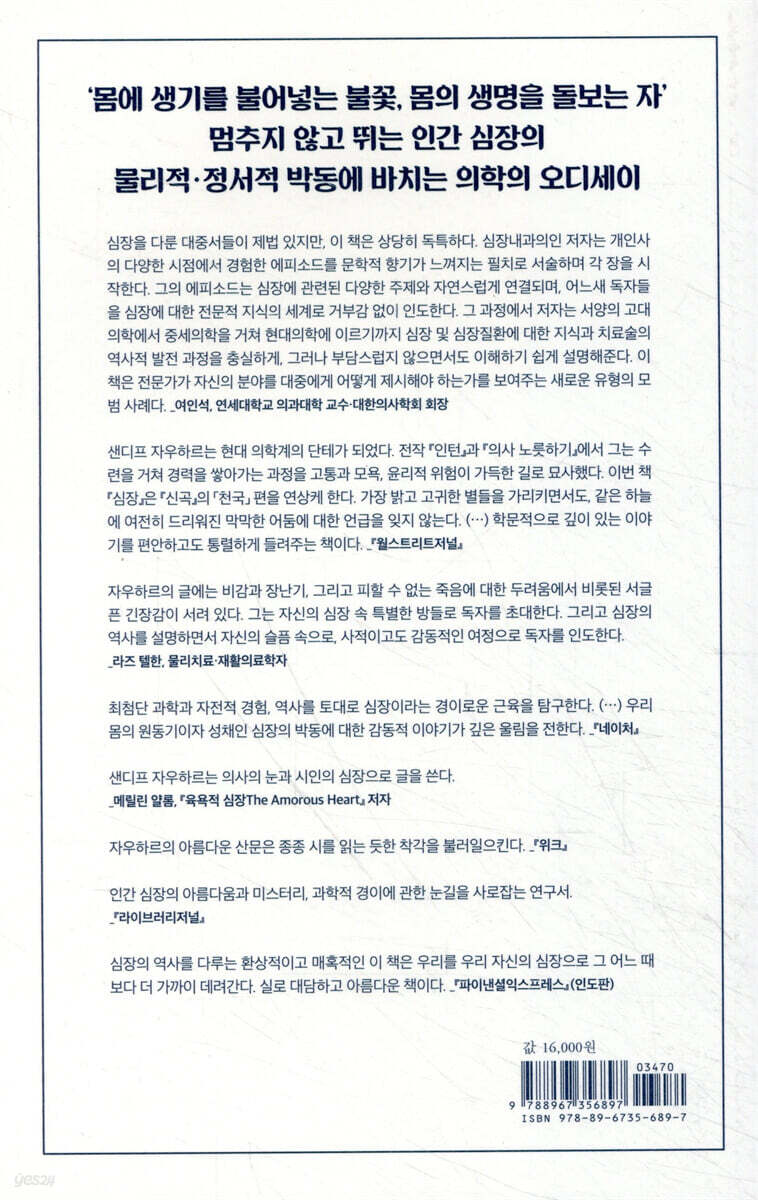샌디프 자우하르는 현대 의학계의 단테가 되었다. 전작 『인턴』과 『의사 노릇하기』에서 그는 수련을 거쳐 경력을 쌓아가는 과정을 고통과 모욕, 윤리적 위험이 가득한 길로 묘사했다. 이번 책 『심장』은 『신곡』의 「천국」 편을 연상케 한다. 가장 밝고 고귀한 별들을 가리키면서도, 같은 하늘에 여전히 드리워진 막막한 어둠에 대한 언급을 잊지 않는다. (…) 학문적으로 깊이 있는 이야기를 편안하고도 통렬하게 들려주는 책이다. - [월스트리트저널]